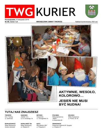 TWG KURIER Poniedziałek, 9 listopada 2015 Nr 88, Cena 1 zł MIESIĘCZNIK GMINY TWORÓG Nakład kontrolowany 500 szt. AKTYWNIE, WESOŁO, KOLOROWO… JESIEŃ NIE MUSI BYĆ NUDNA! TUTAJ NAS ZNAJDZIESZ TWORÓG G.S. Tworóg ul. Zamkowa HANUSEK „Dżelfa” S.C. ul. B. Chrobrego 16 BRYNEK Husqvarna ul. Tarnogórska 7a POŁOMIA Sklep Spożywczy „MART” ul. Bytomska 64 WOJSKA Sklep Spożywczy ul. Powst. Śl. 64 BORUSZOWICE Sklep Spożywczy Aniela Lukoszek NOWA WIEŚ TW. Sklep Spożywczy ul. Wiejska 61 KOTY Mini Market „Mix” ul. Potępska 2 ŚWINIOWICE Piekarnia-Cukiernia M. Szyguła ul. Wiejska 27 TWG KURIER TABLICA LIST DO REDAKCJI NOWE SUKCESY W BRYDŻU SPORTOWYM Fundusz sołecki nadal wzbudza wiele emocji. Na szczęście tym razem pozytywnych. Jednemu z mieszkańców Nowej Wsi Tworoskiej bardzo zależało na złożeniu na naszych łamach podziękowań dla członkini Rady Rodziców Szkoły Podstawowej w Tworogu. Po przeczytaniu artykułu w październikowy wydaniu „TWG Kuriera” poświęconym funduszowi sołeckiemu, poczułem, że należy wspomnieć o pewnej osobie. To Grażyna Godlewska. Ona „zaraziła” mieszkańców Nowej Wsi Tworoskiej pomysłem wydzielenia z funduszu sołeckiego środków na rozbudowę szkolnej świetlicy i adaptację strychu na bibliotekę. Uważam, że należą jej się podziękowania. Sądzę, że pomysł jest szczytny i jego realizacja wyraźnie wpłynie na poprawę warunków w świetlicy. E K L A M Dwie uczennice SP w Tworogu – Antosia Osadnik i Daria Imach zakwalifikowały się do kadry Śląska młodzików w brydżu sportowym. W dniach 2427.09.2015 r. reprezentowały nasze województwo i szkołę na Mistrzostwach Polski Młodzików w Starachowicach. Gratulujemy powołania i życzymy sukcesów. • 17 października 2015 r. w hali widowiskowosportowej MOSiR w Zabrzu odbył się Wojewódzki Turniej Brydża w kategorii młodzików województwa śląskiego. W turnieju wojewódzkim reprezentowała nas para Antonina Osadnik i Antoni Jaruszowic. W dobrym stylu zajęli IV miejsce w grupie młodzików do lat 15. Gratulacje! AKADEMIA SENIORA I KOLEKCJONERSKA WYSTAWA Mieszkaniec Nowej Wsi Tworoskiej (dane do wiadomości redakcji) R • Zapraszamy na wystawę filatelistyczną połączoną z prelekcją Dariusza Frączka. Tematem kolekcji jest Jan Paweł II. A 2 TWG KURIER WSTĘPNIAK OD REDAKCJI SPIS TREŚCI DRODZY MIESZKAŃCY, TABLICA………………………………………………...str.2 SESJA……………………………………………………str.4 – Podatek od nieruchomości – Opłata targowa – Opłata od posiadania psów – Drogi publiczne – Będzie kontrola – Niezbędnik mieszkańca HOBBYSTA …………………………………………….str.6 – Dla wytrwałych i odważnych – Rajd Rowerowy POD LUPĄ …………………………………………......str.7 – OKTOBERFESTyn, czyli święto piwoszy – Na Świętego Marcina gęś do komina KULTURALNIE………………………………….…..…str.9 – Książka to przygoda – Bo starość to radość! – Trzymaj poziom! Nie pij, nie pal, nie bierz! – Mówiąc przez obrazy – Panie i Panowie brawa dla artystów! – Musicie tam być! NA BIEŻĄCO………………………………….……….str.12 – Trwa oczyszczanie kraju z azbestu – Przez trudy do gwiazd – Uczniowie z Brynka zdobywają Berlin – Inspirowani kolorami otaczającego świata – Ciemno wszędzie, straszno wszędzie, co to będzie? – Kostka brukowa przed GOK – Nauczymy Cię tańczyć! – Turniej młodego piłkarza – Sztafetowe biegi przełajowe Tym razem sporo miejsca poświęcamy podatkom, których stawki ustalono na październikowej sesji Rady Gminy. Próbujemy też zachęcić Was do wnoszenia obowiązkowych opłat z tytułu posiadania psa. Szerzej o tej sprawie piszemy w dziale „Sesja”. Na terenie Gminy Tworóg znajduje się obecnie 30117,09 m² wyrobów zawierających azbest. Wszystkie muszą zostać usunięte do końca 2032 roku. Więcej na temat oczyszczania kraju z chorobotwórczego azbestu przeczytacie na str. 12. „Pod lupę” wzięliśmy tym razem „smaczne” zwyczaje, czyli święto piwoszy oraz marcinki, które nie mogą się odbyć bez pieczonej gęsi. Podpowiadamy także jak wykorzystać te produkty w kuchni, by zaimponować gościom i być wiernym tradycji. Zapraszamy do lektury! www.twg-kurier.pl [email protected] REDAKTOR NACZELNA Marta Kobędza-Krain KREACJA Łukasz Krain GOŚCINNIE Katarzyna Mika, Ryszard Królicki, Hanna Pawełczyk, Monika Ruda MECENAT Grażyna Chmiel – dyrektor Gminnego Ośrodka Kultury WYDAWCA Gminny Ośrodek Kultury w Tworogu, ul. Zamkowa 1, 42-690 Tworóg, tel. 32 450 81 34; 512 950 842 DRUK Foto&druk www.fotoidruk.pl Redakcja zastrzega sobie prawo do redagowania i skracania tekstów przesyłanych do druku. 3 TWG KURIER SESJA Terminem płatności opłaty targowej jest dzień, w którym dokonywana jest sprzedaż. Pobór opłaty targowej odbywa się w drodze inkasa. Pobór opłaty powierzono w miejscowości Brynek Iwonie Pryk, w miejscowości Boruszowice-Hanusek Marianowi Łuczak, w Kotach Adamowi Wandzik, w sołectwie Nowa Wieś Tworoska Reginie Mika, w miejscowości Połomia Stefanowi Paś, w Świniowicach Patrycji Skowronek, w Tworogu Krzysztofowi Pustułka, w Wojsce Janowi Siwiec. PODATEK OD NIERUCHOMOŚCI 26 października podczas sesji Rady Gminy podjęto uchwałę w sprawie określenia wysokości stawek podatku od nieruchomości na rok 2016 (Uchwała nr XII105/2015). Podatek od gruntów: • związanych z prowadzeniem działalności gospodarczej bez względu na sposób sklasyfikowania w ewidencji gruntów i budynków – 0,89 zł od 1 m² powierzchni; • pod wodami powierzchniowymi stojącymi lub wodami powierzchniowymi płynącymi jezior i zbiorników sztucznych – 4,42 zł od 1 ha powierzchni; • pozostałych, w tym zajętych na prowadzenie odpłatnej, statutowej działalności pożytku publicznego przez organizacje pożyt