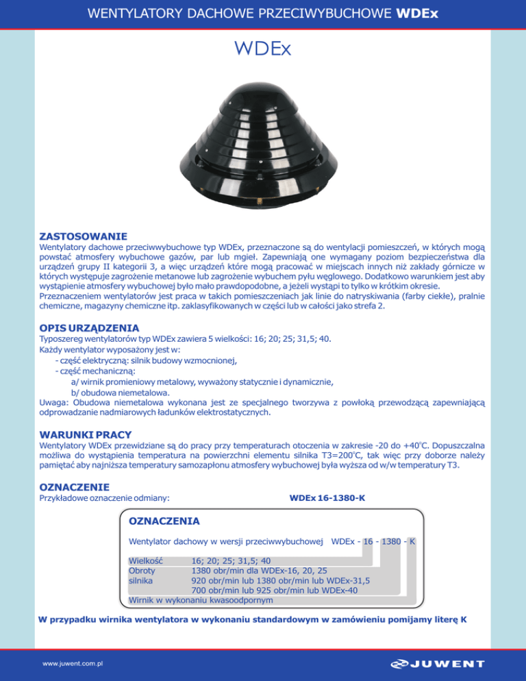 WENTYLATORY DACHOWE PRZECIWYBUCHOWE WDEx WDEx ZASTOSOWANIE Wentylatory dachowe przeciwwybuchowe typ WDEx, przeznaczone s¹ do wentylacji pomieszczeñ, w których mog¹ powstaæ atmosfery wybuchowe gazów, par lub mgie³. Zapewniaj¹ one wymagany poziom bezpieczeñstwa dla urz¹dzeñ grupy II kategorii 3, a wiêc urz¹dzeñ które mog¹ pracowaæ w miejscach innych ni¿ zak³ady górnicze w których wystêpuje zagro¿enie metanowe lub zagro¿enie wybuchem py³u wêglowego. Dodatkowo warunkiem jest aby wyst¹pienie atmosfery wybuchowej by³o ma³o prawdopodobne, a je¿eli wyst¹pi to tylko w krótkim okresie. Przeznaczeniem wentylatorów jest praca w takich pomieszczeniach jak linie do natryskiwania (farby ciek³e), pralnie chemiczne, magazyny chemiczne itp. zaklasyfikowanych w czêœci lub w ca³oœci jako strefa 2. OPIS URZ¥DZENIA Typoszereg wentylatorów typ WDEx zawiera 5 wielkoœci: 16; 20; 25; 31,5; 40. Ka¿dy wentylator wyposa¿ony jest w: - czêœæ elektryczn¹: silnik budowy wzmocnionej, - czêœæ mechaniczn¹: a/ wirnik promieniowy metalowy, wywa¿ony statycznie i dynamicznie, b/ obudowa niemetalowa. Uwaga: Obudowa niemetalowa wykonana jest ze specjalnego tworzywa z pow³ok¹ przewodz¹c¹ zapewniaj¹c¹ odprowadzanie nadmiarowych ³adunków elektrostatycznych. WARUNKI PRACY Wentylatory WDEx przewidziane s¹ do pracy przy temperaturach otoczenia w zakresie -20 do +40oC. Dopuszczalna mo¿liwa do wyst¹pienia temperatura na powierzchni elementu silnika T3=200oC, tak wiêc przy doborze nale¿y pamiêtaæ aby najni¿sza temperatury samozap³onu atmosfery wybuchowej by³a wy¿sza od w/w temperatury T3. OZNACZENIE Przyk³adowe oznaczenie odmiany: WDEx 16-1380-K OZNACZENIA Wentylator dachowy w wersji przeciwwybuchowej WDEx - 16 - 1380 - K Wielkoœæ Obroty silnika 16; 20; 25; 31,5; 40 1380 obr/min dla WDEx-16, 20, 25 920 obr/min lub 1380 obr/min lub WDEx-31,5 700 obr/min lub 925 obr/min lub WDEx-40 Wirnik w wykonaniu kwasoodpornym W przypadku wirnika wentylatora w wykonaniu standardowym w zamówieniu pomijamy literê K WENTYLATORY DACHOWE PRZECIWYBUCHOWE WDEx DANE TECHNICZNE H Podstawowe wymiary f d nxM8 f d1 f D Wielkoœæ wentylatora f d [mm] f d1 [mm] f D [mm] H [mm] n Masa [kg] WD-16 140 190 500 400 4 18 WD-20 WD-25 175 220 230 280 500 605 400 470 4 6 20 21 WD-31,5 WD-40 266 360 345 430 605 810 510 640 6 8 30 45 Silnik KPER-63G4 3~400 V 0,18 kW 0,66 A 1380 obr/min WDEx-16-1380 Pst(Pa) 300 200 1380obr/min 100 0 Silnik KPER-71K4 3~400 V 0,25 kW 0,79 A 1380 obr/min 0 500 1000 1500 V(m3/h) WDEx-20-1380 Pst(Pa) 350 300 250 200 1380obr/min 150 100 50 0 0 1000 2000 3000 V(m3/h) WENTYLATORY DACHOWE PRZECIWYBUCHOWE WDEx WDEx-25-1380 Pst(Pa) 350 Silnik KPER-71K4 3~400 V 0,25 kW 0,79 A 1380 obr/min 300 250 1380obr/min 200 150 100 50 0 Silnik KPER-80K6 3~400 V 0,37 kW 1,3 A 920 obr/min 0 Pst(Pa) 600 1000 3000 2000 4000 V(m3/h) WDEx-31,5-920 / WDEx-31,5-1380 500 400 1380obr/min 300 KPER-80K4 3~400 V 0,55 kW 1,59 A 1380 obr/min 200 100 0 Silnik KPER-90S8 3~400 V 0,37 kW 1,69 A 700 obr/min 920obr/min 0 Pst(Pa) 450 1000 2000 3000 4000 5000 6000 V(m3/h) WDEx-40-700 / WDEx-40-925 400 350 300 925obr/min 250 KPER-90L6 3~400 V 0,95 kW 2,85 A 925 obr/min 200 150 700obr/min 100 50 0 0 2000 Pst - podciœnienie statyczne w otworze wlotowym do wentylatora 4000 6000 8000 10000 V(m3/h) WENTYLATORY DACHOWE PRZECIWYBUCHOWE WDEx G³oœnoœæ pracy [dB(A)] wentylatorów z silnikami 3-fazowymi Od strony wylotu powietrza* Od strony wylotu powietrza** Wielkoœæ wentylatora Obroty [obr/min] z odleg³oœci 1m z odleg³oœci 5m z odleg³oœci 1m z odleg³oœci 5m WD-16 1380 63 51 59 54 WD-20 1380 65 53 61 56 WD-25 1380 67 55 63 59 WD-31,5 920 1380 62 70 50 58 58 66 53 61 WD-40 700 925 65 70 53 58 61 66 56 61 *G³oœnoœæ w dB(A) - poziom ciœnienia akustycznego od strony wylotu powietrza, w polu swobodnym z uwzglêdnieniem wspó³czynnika kierunkowego Q=2 i odleg³oœci od wentylatora podanych w tabeli. **G³oœnoœæ w dB(A) - poziom ciœnienia akustycznego od strony wlotu powietrza z uwzglêdnieniem zdolnoœci poch³aniania pomieszczenia A=100 m2 , wspó³czynnika kierunkowego Q=2 i odleg³oœci od wlotu powietrza podanych w tabeli. INFORMACJE DODATKOWE Na egzemplarzach prototypowych wentylatorów zosta³y wykonane badania na obudowie niemetalowej w Laboratorium Systemów i Zabezpieczeñ Przeciwwybuchowych oraz Eksplozymetrii Kopalni Doœwiadczalnej "Barbara” Zak³adzie Bezpieczeñstwa Przeciwwybuchowego, jednostki notyfikowanej nr 1453 jakim jest G³ówny Instytut Górnictwa w Katowicach. Zestawienie rozporz¹dzeñ i norm zharmonizowanych: -Rozporz¹dzenie Ministra Gospodarki i Polityki Spo³ecznej z dnia 28 lipca 2003 w sprawie zasadniczych wymagañ dla urz¹dzeñ i systemów ochronnych przeznaczonych do u¿ytku w przestrzeniach zagro¿onych wybuchem Dz. U. z 14 sierpnia 2003 Nr 143 Poz. 1393. -Rozporz¹dzenie Ministra Gospodarki i Polityki Spo³ecznej z dnia 10 kwietnia 2003 w sprawie wymagañ maszyn i elementów bezpieczeñstwa. Dz. U. Nr 91 pozycja. 858 z 23 maja 2003 r. - PN-EN 1127-1 Zapobieganie wybuchowi i ochrona przed wybuchem. - PN-EN 50014 (U) Urz¹dzenia elektryczne w przestrzeniach zagro¿onych wybuchem. Wymagania ogólne. - PN-EN 50019 (U) Urz¹dzenia elektryczne w przestrzeniach zagro¿onych wybuchem. Budowa wzmocniona "e". Do wentylatorów dachowych WDEx mo¿emy dostarczyæ podstawy dachowe PWD typu B/I; B/II lub B/III. Dane techniczne wyposa¿enia dodatkowego wentylatorów zamieszczone s¹ w karcie katalogowej podstaw PWD, w niniejszym katalogu. Wszystkie wielkoœci wentylatorów mog¹ byæ wykonane z wirnikami ze stali kwasoodpornej. Nale¿y to zaznaczyæ przy zamówieniu. AUTOMATYKA Opis dzia³ania oraz doboru uk³adów automatyki wentylatorów zamieszczony jest w dziale STEROWANIE I AUTOMATYKA WENTYLATORÓW, w niniejszym katalogu.