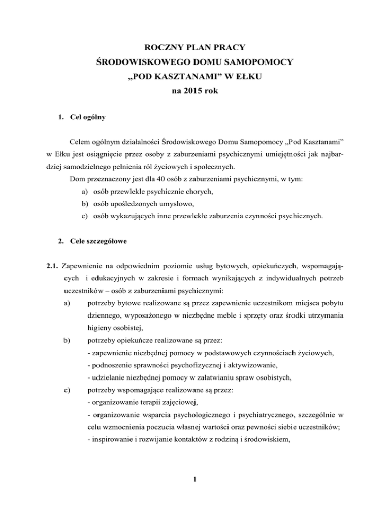 ROCZNY PLAN PRACY ŚRODOWISKOWEGO DOMU SAMOPOMOCY „POD KASZTANAMI” W EŁKU na 2015 rok 1. Cel ogólny Celem ogólnym działalności Środowiskowego Domu Samopomocy „Pod Kasztanami” w Ełku jest osiągnięcie przez osoby z zaburzeniami psychicznymi umiejętności jak najbardziej samodzielnego pełnienia ról życiowych i społecznych. Dom przeznaczony jest dla 40 osób z zaburzeniami psychicznymi, w tym: a) osób przewlekle psychicznie chorych, b) osób upośledzonych umysłowo, c) osób wykazujących inne przewlekłe zaburzenia czynności psychicznych. 2. Cele szczegółowe 2.1. Zapewnienie na odpowiednim poziomie usług bytowych, opiekuńczych, wspomagających i edukacyjnych w zakresie i formach wynikających z indywidualnych potrzeb uczestników – osób z zaburzeniami psychicznymi: a) potrzeby bytowe realizowane są przez zapewnienie uczestnikom miejsca pobytu dziennego, wyposażonego w niezbędne meble i sprzęty oraz środki utrzymania higieny osobistej, b) potrzeby opiekuńcze realizowane są przez: - zapewnienie niezbędnej pomocy w podstawowych czynnościach życiowych, - podnoszenie sprawności psychofizycznej i aktywizowanie, - udzielanie niezbędnej pomocy w załatwianiu spraw osobistych, c) potrzeby wspomagające realizowane są przez: - organizowanie terapii zajęciowej, - organizowanie wsparcia psychologicznego i psychiatrycznego, szczególnie w celu wzmocnienia poczucia własnej wartości oraz pewności siebie uczestników; - inspirowanie i rozwijanie kontaktów z rodziną i środowiskiem, 1 - rozwijanie aktywności społecznej i samorządności, w szczególności poprzez udział w lokalnych wydarzeniach kulturalnych i społecznych. d) potrzeby edukacyjne realizowane są przez: - uczenie przez doświadczenie życiowe, - uczestnictwo w zajęciach terapeutycznych i kulturalno-edukacyjnych, w szczególności rozwijanie zainteresowania literaturą, audycjami telewizyjnymi i radiowymi, Internetem itp. 2.2. Zapewnienie uczestnikom możliwie pełnego uczestnictwa w życiu społecznym poprzez umożliwienie pełnienia przez uczestników jak największej liczby ról społecznych w rodzinie, środowisku, instytucjach itp; 2.3. Kształtowanie prawidłowych relacji interpersonalnych w obrębie społeczności Domu; 2.4. Inicjowanie zachowań zmierzających do integracji ze społecznością Miasta, w tym udział w spotkaniach towarzyskich i kulturalnych; 2.5. Prowadzenie reintegracji zawodowej i społecznej uczestników. 3. Działania i metody pracy W 2015r. Dom będzie realizował zadania wynikające z: - ustawy z dnia 12 marca 2004r. o pomocy społecznej, - rozporządzenia Ministra Pracy i Polityki Społecznej z 9 grudnia 2010 w sprawie środowiskowych domów samopomocy, - Strategii Rozwiązywania Problemów Społecznych dla Miasta Ełk na lata 2008 – 2018, - Regulaminu Organizacyjnego Środowiskowego Domu Samopomocy dla Osób z Zaburzeniami Psychicznymi w Ełku, w zakresie odpowiadającym potrzebom uczestników. Działania wspierająco – aktywizujące wobec uczestników realizowane są w formie zajęć zorganizowanych: treningów i zajęć w pracowniach, grupowych i indywidualnych. Metody pracy to: modelowanie, prezentacja, warsztaty, ćwiczenia i inne, zależnie od potrzeb. Formy i metody pracy są w wysokim stopniu zindywidualizowane, specyficzne i z tego powodu nie mogą podlegać standaryzacji. Indywidualizacja działań dotyczy również oceny funkcjonowania uczestników, dokonywanej co 6 miesięcy przez zespół wspierająco – aktywizujący. 2 4. Plan działań w 2015r. L.p. Zakres Działania Termin realizacji 1. 2. 3. 4. Odpowiedzialny 5. 1. Trening umiejętności społecznych I Postępowanie wspierającoaktywizujące 1.1. Trening umiejętności interpersonalnych i rozwiązywania problemów- kształtowanie pozytywnych relacji uczestnika z osobami bliskimi i społecznością lokalną, nauka zachowania się w miejscach publicznych, doskonalenie umiejętności nawiązywania kontaktów, podtrzymywania rozmowy, aktywnego słuchania; pomoc w rozwiązywaniu problemów interpersonalnych i życiowych uczestnika. praca ciągła wszyscy terapeuci 1.2. Trening gospodarowania własnymi zasobami finansowymi – uczenie dokonywania racjonalnych zakupów, orientacji w cenach, dokonywania obliczeń. praca ciągła wszyscy terapeuci 1.3. Trening prowadzenia gospodarstwa domowego i dbania o estetykę otoczenia – uczenie dbałości o czystość, porządek i estetykę otoczenia. Trening realizowany w formie dyżurów oraz „generalnych porządków” dyżury – praca ciągła „generalne porządki” – raz na 6 m-cy wszyscy terapeuci raz w tygodniu wszyscy terapeuci zgodnie z kalendarzem wyznaczony terapeuta 1.4. Trening współdziałania i komunikacji interpersonalnej – zebrania społeczności uczestników, nauka demokracji i samorządności oraz współodpowiedzialności za funkcjonowanie środowiskowego domu samopomocy 1.5. Imprezy okolicznościowe: zabawa karnawałowa, Dzień Kobiet, Powitanie Wiosny, Śniadanie Wielkanocne, Pima Aprilis, Zaduszki, Andrzejki, Mikołajki, Wigilia Bożego Narodzenia, zabawa sylwestrowa,7ta rocznica utworzenia ŚDS itp. 2. Trening umiejętności spędzania wolnego czasu Postępowanie wspierającoaktywizujące c.d. 2.1. zajęcia świetlicowe - -gry towarzyskie, konkursy karaoke i inne, turnieje gier planszowych, „ogniska”, oglądanie filmów itp. 2.2. 5- dniowy biwak praca ciągła wszyscy terapeuci czerwiec- lipiec wyznaczeni terapeuci dwa razy w roku wyznaczony terapeuta wszyscy terapeuci 3. Integracja uczestników z innymi osobami niepełnosprawnymi i ze społecznością lokalną 3.1 Spotkania integracyjne z uczestnikami innych domów samopomocy, WTZ-ów itp., w tym przeglądach, festiwalach itp. 3.2 DNI RODZINY – piknik integracyjny uczestników ŚDS i członków ich rodzin maj 3.3 Spartakiada środowiskowych domów samopomocy II lub III kwartał 3.4 Wycieczka autokarowa 2 lub 3 dniowa II lub III kwartał 3.5 Udział w „Pikniku p