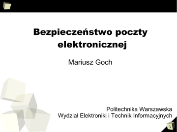 Bezpieczeństwo poczty elektronicznej Mariusz Goch Politechnika Warszawska Wydział Elektroniki i Technik Informacyjnych 1 Plan prezentacji Bezpieczeństwo transportu wiadomości Problemy serwera pocztowego Niechciana poczta 2 Transport wiadomości Przesyłanie wiadomości Protokół SMTP Protokoły POP3/IMAP 3 Przesyłanie wiadomości 4 Protokół SMTP Simple Mail Transfer Protocol Komunikacja pomiędzy klientem poczty a serwerem Komunikacja pomiędzy serwerami Czy wymagać uwierzytelnienia, a jeśli tak to od kogo? 5 Protokół SMTP 220 test.com ESMTP Easy.Server EHLO dom 250-test.com 250-PIPELINING 250-SIZE 22000000 250-ETRN 250-STARTTLS 250-AUTH LOGIN PLAIN DIGEST-MD5 CRAM-MD5 250-AUTH=LOGIN PLAIN DIGEST-MD5 CRAM-MD5 250-8BITMIME 250 DSN AUTH LOGIN 334 VXNlcm5hbWU6 [Username:] cG9jenRhQHRlc3QuY29tCg== [[email protected]] 334 UGFzc3dvcmQ6 [Password:] dGVzdAo= [test] 6 235 2.0.0 Authentication successful Protokół SMTP MAIL FROM:<[email protected]> 250 2.1.0 Ok RCPT TO:<[email protected]> 250 2.1.5 Ok DATA 354 End data with <CR><LF>.<CR><LF> Wiadomość . 250 2.0.0 Ok: queued as 723F62090F1 QUIT 221 2.0.0 Bye 7 Uwierzytelnianie w protokole SMTP PLAIN Jeden komunikat (base64): base64('authid', 0, 'userid', 0, 'password') LOGIN Oddzielnie login i hasło (base64) Base64 – kodowanie umożliwiające zapis danych binarnych w formie znaków drukowanych Brak zabezpieczenia przed podsłuchem 8 Uwierzytelnianie w protokole SMTP CRAM-MD5 Bazuje na funkcji haszującej MD5 Serwer generuje losowy ciąg bajtów Klient tworzy odpowiedź na podstawie funkcji XOR i MD5 na znanym haśle i otrzymanym ciągu znaków DIGEST-MD5 Dokonuje uwierzytelnienia nie tylko klienta, ale i serwera 9 Zabezpieczenie przed posłuchem Szyfrowanie komunikacji poprzez TLS Transport Layer Security Komenda STARTTLS po przywitaniu STARTTLS 220 2.0.0 Ready to start TLS Szyfrowanie zarówno komunikacji z klientem poczty jak i pomiędzy serwerami Komunikacja cały czas poprzez port 25 10 Protokoły POP3/IMAP Oddzielne usługi serwera Wiadomości pobierane bezpośrednio z dysku serwera Metody uwierzytelniania podobne jak w SMTP Można niezależnie uruchomić usługi z szyfrowaniem połączenia SSL Porty: POP3 – 110 POP3S – 995 IMAP – 143 IMAPS – 993 11 Protokół POP3 Komendy: AUTH – wybór sposobu uwierzytelniania USER – identyfikator użytkownika PASS – hasło LIST – pobierz listę wiadomości RETR – pobierz wiadomość DELE – usuń wiadomość QUIT – koniec 12 Zagrożenia transportu wiadomości Podsłuch hasła dostępowego do skrzynki Podsłuchanie treści wiadomości Modyfikacja wiadomości 13 Problemy serwera pocztowego OpenRelay Kontrola podanych adresów Weryfikacja nadawców Konta systemowe Odporność na awarie 14 OpenRelay Serwer pocztowy niezabezpieczony przed nieautoryzowanym dostępem Rozsyłanie spamu Podszywanie się Wymuszenie uwierzytelniania przed wysłaniem wiadomości Blokada przekazywania wiadomości Odblokowanie tylko dla znanych serwerów wspólnie realizujących obsługę poczty 15 Kontrola podanych adresów Kontrola komend protokołu SMTP: MAIL FROM RCPT TO Poprawność podanych adresów FQDN - Fully Qualified Domain Name Zgodność z danymi podanymi w trakcie uwierzytelniania 16 Weryfikacja nadawcy Odnalezienie serwera nadawcy (na podstawie danych w DNS) Komunikacja z serwerem i próba wysłania wiadomości do nadawcy Gdy serwer nadawcy przyjmie wiadomość testową, zakończenie połączenia i akceptacja wiadomości Operacja kosztowna Cachowanie wyników 17 Konta systemowe Skrzynka pocztowa = Konto pocztowe ?? Wirtualne skrzynki pocztowe: Informacje o kontach w bazie danych Ograniczenie dostępu do systemu Możliwość utrzymywania poczty z wielu domen na pojedynczym serwerze 18 Odporność na awarie Podstawowe lekarstwo na awarie – redundancja Za pomocą rekordów MX w DNS można ustawić wiele serwerów SMTP Awaria głównego serwera uniemożliwia odbiór wiadomości poprzez POP3/IMAP Ustawienie bramki pocztowej Wiadomości trzymane poza serwerem odpowiedzialnym za komunikacje z resztą sieci 19 Niechciana poczta Rodzaje niepożądanej poczty Filtry antyspamowe i antywirusowe RBL Greylist 20 Rodzaje niepożądanej poczty Wirusy, exploity Spam Ataki Denial of Service - DoS 21 Filtry antyspamowe i antywirusowe Lokalna kontrola wiadomości Analiza sygnatur Blokowanie słów kluczowych Analiza heurystyczna Filtrowanie załączników 22 RBL RBL – Realtime Blackhole Lists Globalne bazy danych o hostach podejrzanych o rozsyłanie spamu Dane udostępniane poprzez DNS Adres IP: a.b.c.d Zapytanie o rekord TXT: d.c.b.a.serwer.list.rbl. 23 Greylist Wysłanie pojedynczego spamu nie jest ponawiane Serwer pocztowy zrywa połączenie za pierwszym razem i zapisuje sygnaturę listu Jeśli wysyłka zostanie ponowiona serwer zaakceptuje wiadomość Wprowadza opóźnienie w dostarczeniu przesyłki 24 Literatura Ralf Hildebrandt, Patrick Koetter „The Book of Postfix” 25 Dziękuję za uwagę Pytania? 26