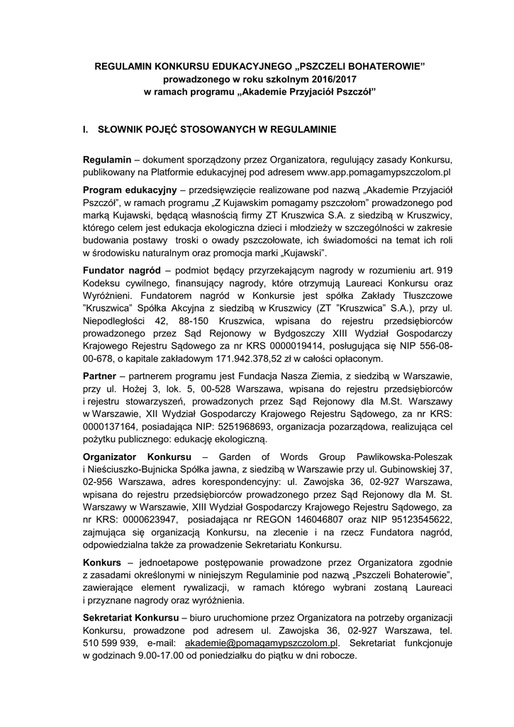 REGULAMIN KONKURSU EDUKACYJNEGO „PSZCZELI BOHATEROWIE” prowadzonego w roku szkolnym 2016/2017 w ramach programu „Akademie Przyjaciół Pszczół” I. SŁOWNIK POJĘĆ STOSOWANYCH W REGULAMINIE Regulamin – dokument sporządzony przez Organizatora, regulujący zasady Konkursu, publikowany na Platformie edukacyjnej pod adresem www.app.pomagamypszczolom.pl Program edukacyjny – przedsięwzięcie realizowane pod nazwą „Akademie Przyjaciół Pszczół”, w ramach programu „Z Kujawskim pomagamy pszczołom” prowadzonego pod marką Kujawski, będącą własnością firmy ZT Kruszwica S.A. z siedzibą w Kruszwicy, którego celem jest edukacja ekologiczna dzieci i młodzieży w szczególności w zakresie budowania postawy troski o owady pszczołowate, ich świadomości na temat ich roli w środowisku naturalnym oraz promocja marki „Kujawski”. Fundator nagród – podmiot będący przyrzekającym nagrody w rozumieniu art. 919 Kodeksu cywilnego, finansujący nagrody, które otrzymują Laureaci Konkursu oraz Wyróżnieni. Fundatorem nagród w Konkursie jest spółka Zakłady Tłuszczowe ”Kruszwica” Spółka Akcyjna z siedzibą w Kruszwicy (ZT ”Kruszwica” S.A.), przy ul. Niepodległości 42, 88-150 Kruszwica, wpisana do rejestru przedsiębiorców prowadzonego przez Sąd Rejonowy w Bydgoszczy XIII Wydział Gospodarczy Krajowego Rejestru Sądowego za nr KRS 0000019414, posługująca się NIP 556-0800-678, o kapitale zakładowym 171.942.378,52 zł w całości opłaconym. Partner – partnerem programu jest Fundacja Nasza Ziemia, z siedzibą w Warszawie, przy ul. Hożej 3, lok. 5, 00-528 Warszawa, wpisana do rejestru przedsiębiorców i rejestru stowarzyszeń, prowadzonych przez Sąd Rejonowy dla M.St. Warszawy w Warszawie, XII Wydział Gospodarczy Krajowego Rejestru Sądowego, za nr KRS: 0000137164, posiadająca NIP: 5251968693, organizacja pozarządowa, realizująca cel pożytku publicznego: edukację ekologiczną. Organizator Konkursu – Garden of Words Group Pawlikowska-Poleszak i Nieściuszko-Bujnicka Spółka jawna, z siedzibą w Warszawie przy ul. Gubinowskiej 37, 02-956 Warszawa, adres korespondencyjny: ul. Zawojska 36, 02-927 Warszawa, wpisana do rejestru przedsiębiorców prowadzonego przez Sąd Rejonowy dla M. St. Warszawy w Warszawie, XIII Wydział Gospodarczy Krajowego Rejestru Sądowego, za nr KRS: 0000623947, posiadająca nr REGON 146046807 oraz NIP 95123545622, zajmująca się organizacją Konkursu, na zlecenie i na rzecz Fundatora nagród, odpowiedzialna także za prowadzenie Sekretariatu Konkursu. Konkurs – jednoetapowe postępowanie prowadzone przez Organizatora zgodnie z zasadami określonymi w niniejszym Regulaminie pod nazwą „Pszczeli Bohaterowie”, zawierające element rywalizacji, w ramach którego wybrani zostaną Laureaci i przyznane nagrody oraz wyróżnienia. Sekretariat Konkursu – biuro uruchomione przez Organizatora na potrzeby organizacji Konkursu, prowadzone pod adresem ul. Zawojska 36, 02-927 Warszawa, tel. 510 599 939, e-mail: [email protected]. Sekretariat funkcjonuje w godzinach 9.00-17.00 od poniedziałku do piątku w dni robocze. Uczestnik Konkursu – Zespół Konkursowy, który za pośrednictwem Opiekuna Zespołu Konkursowego, został zgłoszony do udziału w Konkursie, w terminach i zgodnie z zasadami wynikającymi z niniejszego Regulaminu. Opiekun Zespołu Konkursowego – Dyrektor Szkoły lub pedagog/nauczyciel sprawujący z upoważnienia Dyrektora Szkoły opiekę nad Zespołem Konkursowym. Opiekun posiada konto nauczyciela na Platformie edukacyjnej, co umożliwia udział w Konkursie Zespołu Konkursowego, a w szczególności możliwość zgłoszenia Relacji w Konkursie. Zespół Konkursowy– grupa uczniów danej Szkoły ucząca się w klasach IV-VI, wspólnie lub indywidualnie realizująca zadania, zgodnie z postanowieniami Regulaminu, co wiąże się z możliwością zdobycia punktów dla całej grupy. Zespół wspierany i nadzorowany jest przez Opiekuna Zespołu Konkursowego. Zespół może liczyć maksymalnie 40 uczniów. Gracz – członek Zespołu Konkursowego, zarejestrowany na Platformie edukacyjnej, w sposób określony w Regulaminie, który ma możliwość wykonywania zadań indywidualnych i zbierania punktów dla swojego Zespołu Konkursowego. Relacja zespołowa – praca stanowiąca sprawozdanie z wykonania zadań wspólnych przez Zespół Konkursowy, przygotowana i zgłaszana przez Opiekuna Zespołu konkursowego za pośrednictwem Portalu edukacyjnego. Relacja indywidualna – praca stanowiąca sprawozdanie z realizacji zadań indywidualnych, wykonywana samodzielnie przez Gracza i zgłaszana przez jego opiekuna prawnego, w celu zdobycia punktów dla swojego Zespołu. Szkoła – placówka publiczna lub niepubliczna, znajdująca się na terenie Rzeczypospolitej Polskiej, zajmująca się kształceniem dzieci i młodzieży na poziomie podstawowym. Na potrzeby Programu pod pojęciem Szkoły należy rozumieć również placówki oświatowo-wychowawcze oraz specjalne ośrodki szkolno-wychowawcze stanowiące część systemu oświaty w rozumieniu ustawy z dnia 7 września 1991 r. o systemie oświaty (j.t. Dz.U. z 2004 r., Nr 256, poz. 2572 z późn.zm.). Laureaci Konkursu – pięć Zespołów Konkursowych, które zdobyły w Konkursie największą liczbę punktów i którym przyznano z tego tytułu nagrody główne, zgodnie z zasadami określonymi w Regulaminie. Wyróżniony – Zespół Konkursowy, którego Relacja Zespołowa z wykonania zadania otwartego została uznana za najlepszą przez Jury w danym województwie, na zakończenie danej fazy Konkursu. W Konkursie trzykrotnie wyłonionych zostanie 16 Wyróżnionych, po jednym z każdego województwa na zakończenie każdej fazy Konkursu. Platforma edukacyjna – strona internetowa znajdująca się pod adresem www.app.pomagamypszczolom.pl dedykowana Programowi edukacyjnemu Akademie Przyjaciół Pszczół, za pośrednictwem której realizowany jest Konkurs, na której 