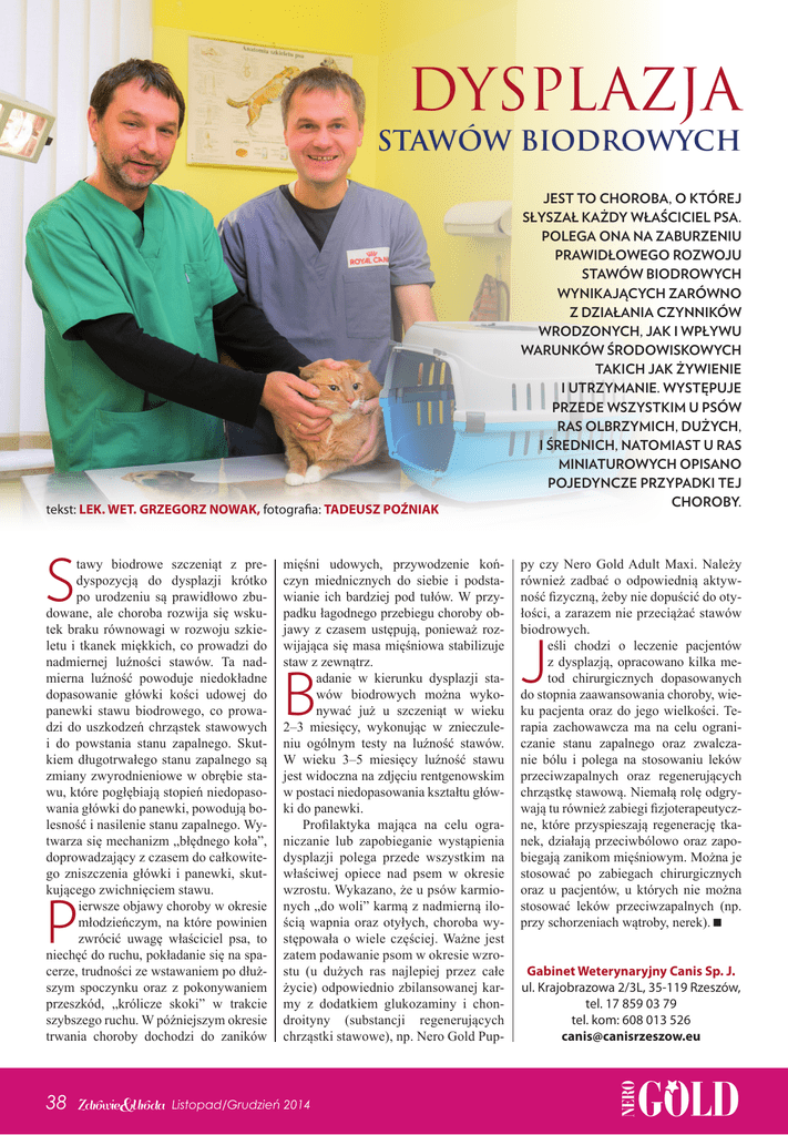 DYSPLAZJA STAWÓW BIODROWYCH tekst: LEK. WET. GRZEGORZ NOWAK, fotografia: TADEUSZ POŹNIAK S tawy biodrowe szczeniąt z predyspozycją do dysplazji krótko po urodzeniu są prawidłowo zbudowane, ale choroba rozwija się wskutek braku równowagi w rozwoju szkieletu i tkanek miękkich, co prowadzi do nadmiernej luźności stawów. Ta nadmierna luźność powoduje niedokładne dopasowanie główki kości udowej do panewki stawu biodrowego, co prowadzi do uszkodzeń chrząstek stawowych i do powstania stanu zapalnego. Skutkiem długotrwałego stanu zapalnego są zmiany zwyrodnieniowe w obrębie stawu, które pogłębiają stopień niedopasowania główki do panewki, powodują bolesność i nasilenie stanu zapalnego. Wytwarza się mechanizm „błędnego koła”, doprowadzający z czasem do całkowitego zniszczenia główki i panewki, skutkującego zwichnięciem stawu. ierwsze objawy choroby w okresie młodzieńczym, na które powinien zwrócić uwagę właściciel psa, to niechęć do ruchu, pokładanie się na spacerze, trudności ze wstawaniem po dłuższym spoczynku oraz z pokonywaniem przeszkód, „królicze skoki” w trakcie szybszego ruchu. W późniejszym okresie trwania choroby dochodzi do zaników P 38 mięśni udowych, przywodzenie kończyn miednicznych do siebie i podstawianie ich bardziej pod tułów. W przypadku łagodnego przebiegu choroby objawy z czasem ustępują, ponieważ rozwijająca się masa mięśniowa stabilizuje staw z zewnątrz. adanie w kierunku dysplazji stawów biodrowych można wykonywać już u szczeniąt w wieku 2–3 miesięcy, wykonując w znieczuleniu ogólnym testy na luźność stawów. W wieku 3–5 miesięcy luźność stawu jest widoczna na zdjęciu rentgenowskim w postaci niedopasowania kształtu główki do panewki. Profilaktyka mająca na celu ograniczanie lub zapobieganie wystąpienia dysplazji polega przede wszystkim na właściwej opiece nad psem w okresie wzrostu. Wykazano, że u psów karmionych „do woli” karmą z nadmierną ilością wapnia oraz otyłych, choroba występowała o wiele częściej. Ważne jest zatem podawanie psom w okresie wzrostu (u dużych ras najlepiej przez całe życie) odpowiednio zbilansowanej karmy z dodatkiem glukozaminy i chondroityny (substancji regenerujących chrząstki stawowe), np. Nero Gold Pup- B Listopad/Grudzień 2014 JEST TO CHOROBA, O KTÓREJ SŁYSZAŁ KAŻDY WŁAŚCICIEL PSA. POLEGA ONA NA ZABURZENIU PRAWIDŁOWEGO ROZWOJU STAWÓW BIODROWYCH WYNIKAJĄCYCH ZARÓWNO Z DZIAŁANIA CZYNNIKÓW WRODZONYCH, JAK I WPŁYWU WARUNKÓW ŚRODOWISKOWYCH TAKICH JAK ŻYWIENIE I UTRZYMANIE. WYSTĘPUJE PRZEDE WSZYSTKIM U PSÓW RAS OLBRZYMICH, DUŻYCH, I ŚREDNICH, NATOMIAST U RAS MINIATUROWYCH OPISANO POJEDYNCZE PRZYPADKI TEJ CHOROBY. py czy Nero Gold Adult Maxi. Należy również zadbać o odpowiednią aktywność fizyczną, żeby nie dopuścić do otyłości, a zarazem nie przeciążać stawów biodrowych. eśli chodzi o leczenie pacjentów z dysplazją, opracowano kilka metod chirurgicznych dopasowanych do stopnia zaawansowania choroby, wieku pacjenta oraz do jego wielkości. Terapia zachowawcza ma na celu ograniczanie stanu zapalnego oraz zwalczanie bólu i polega na stosowaniu leków przeciwzapalnych oraz regenerujących chrząstkę stawową. Niemałą rolę odgrywają tu również zabiegi fizjoterapeutyczne, które przyspieszają regenerację tkanek, działają przeciwbólowo oraz zapobiegają zanikom mięśniowym. Można je stosować po zabiegach chirurgicznych oraz u pacjentów, u których nie można stosować leków przeciwzapalnych (np. przy schorzeniach wątroby, nerek). J Gabinet Weterynaryjny Canis Sp. J. ul. Krajobrazowa 2/3L, 35-119 Rzeszów, tel. 17 859 03 79 tel. kom: 608 013 526 [email protected]