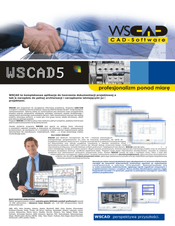 5 profesjonalizm ponad miarę WSCAD to kompleksowa aplikacja do tworzenia dokumentacji projektowej a także narzędzie do pełnej archiwizacji i zarządzania istniejącymi już projektami. WSCAD jest programem do zarządzania informacją projektową. Programy CAD/CAE w krajach o wysokiej kulturze produkcji cieszą się obecnie bardzo dużym i wciąż rosnącym zainteresowaniem. Główną zaletą ich wykorzystania jest skrócenie czasu przygotowania projektu poprzez polepszenie współpracy pomiędzy członkami zespołu projektowego i usprawnienie ponownego wykorzystania danych. Jedni konstruktorzy pracują nad częścią projektu dotyczącą zasilania, w czasie gdy inna grupa tworzy układy sterowania, całość prac dotyczy jednego projektu. Program WSCAD umożliwia pracę wielu osób przy jednym projekcie, poddana kontroli jest jedynie jednoczesna praca na tej samej stronie. Zasada działania programu WSCAD jest oparta na spójnej bazie informacji o wszystkich częściach projektu a mianowicie od informacji o użytych, zastosowanych komponentach, po powiązanie ich w kompletny schemat poprzez wygenerowanie pełnej dokumentacji list (zaciskowych, materiałowych, kabli, ....), aż po prezentację widoku montażowego szafy. DLA KOGO WSCAD? WSCAD jest idealnym rozwiązaniem dla firm i instytucji poszukujących profesjonalnego oprogramowania nie tylko do tworzenia schematów, ale także do zarządzania projektami elektrycznymi. Program pozwala także na pełną archiwizację istniejącej już dokumentacji oraz oferuje wyjątkowe rozwiązania w zakresie nanoszenia zmian i wprowadzania poprawek. Dzięki takim cechom jak: łatwość obsługi, przejrzysty design, możliwości indywidualnej konfiguracji, komplet bibliotek symboli graficznych i katalogowych baz danych, WSCAD zasłużył sobie n a miano niezbędnego narzędzia w całym zawiłym i długim procesie produkcyjnym. Kontrola poprawności tworzonego projektu wraz ze wszystkimi funkcjami zarządzania eliminuje możliwość popełnienia błędu. Program może zostać indywidualnie skonfigurowany, wszystko to zwiększa wydajność przy jednoczesnym zachowaniu przyjemności pracy. System WSCAD rozwija się wraz z rozwojem rynku, który z kolei jest podporządkowany wymaganiom użytkowników. Znajduje zastosowanie zarówno w biurach projektowych, gdzie tworzone są kompleksowe projekty, jak również w służbach utrzymania ruchu, gdzie jego zastosowanie pozwala uniknąć rozbieżności pomiędzy eksploatowaną maszyną a jej dokumentacją techniczną. Naczelnym celem naszej działalności jest udostępnienie inżynierom efektywnych narzędzi do tworzenia dokumentacji technicznej opartych na najnowszych rozwiązaniach z zakresu informatyki. Specjalizujemy się w rynku automatyki, elektrotechniki, zgłębiając tajniki zagadnień związanych z projektowaniem maszyn i urządzeń. Naszą wiedzę aktualizujemy poprzez ciągły bezpośredni kontakt z inżynierami, poprzez co poznajemy wymagania i potrzeby polskich projektantów. BAZY DANYCH I BIBLIOTEKI Pakiet oprogramowania zawiera szeroką gamę bibliotek symboli graficznych (ponad 10 000 elementów) i obszerne bazy danych (ok. 120 000 komponentów) takich producentów jak: ABB, AEG, Allen Bradley, Alstom, Apator, Beckhoff, B&R, Dold, Elester, Eltronkabel, Endress+Hauser, Festo, Finder, GE Fanuc, Harting, Helukabel, Hitachi, Legrand, Lenze, Lovato, Matsushita, Merlin Gerin, Moeller, Omron, Phoenix, Pilz, Relpol, Rittal, Saia, Schrack, Schneider Electric, SEW, Siemens, Spamel, TAC, Technokabel, Telemecanique, Wago, Weidmueller, Berker, DEHN, Elda, Fael, Polam Pułtusk, Polo-Hager, Bosch Rexroth, Honeywell, LAPP, Landis+ Stefa,... WSCAD perspektywa przyszłości. W WSCAD od zawsze kluczową rolę pełnią takie aspekty jak: funkcjonalność, bezbłędność, ergonomia, jakość, niezawodność, oraz koszty. W świetle badań najbardziej pożądaną cechą współczesnych przedsiębiorstw produkcyjnych jest umiejętność szybkiego reagowania i dostosowywania się do dynamicznie zmieniającej się sytuacji rynkowej. Ponadto przy ograniczonych kosztach i wysokiej konkurencyjności na rynku szczególnego znaczenia nabiera pytanie w jaki sposób firma może projektować maszyny, urządzenia szybciej i efektywniej od konkurencji, wykorzystując obecny zespół inżynierów konstruktorów? Błyskawiczne wprowadzanie nagłych i nieplanowanych zmian inżynierskich, dzięki wykorzystaniu nowej generacji technologii CAD stanowi jeden z tych sposobów. Program WSCAD jest bardzo intuicyjny i łatwy do poznania. W pełni wydajna praca rozpoczyna się już po 3 dniach praktycznego szkolenia wprowadzającego. Projektowanie w systemie WSCAD wprowadziło nowy wymiar w pracy z narzędziami CAD/CAE. Obalona została teoria o skomplikowanej obsłudze systemów komputerowych, które miały być lekarstwem, na dręczące projektantów problemy a stały się utrudniającą pracę złożoną konstrukcją programistyczną, wymagającą ogromnej wiedzy z zakresu informatyki a tym samym długich szkoleń w jego obsłudze. Duża odpowiedzialność w tym zakresie spoczywa nie tylko na programistach, ale także, a właściwie przede wszystkim, na użytkownikach programu, którzy są ogromną inspiracją i n i e s ko ń c z o ny m ź r ó d ł e m p o my s ł ó w n a r o z b u d o w ę funkcjonalności. Już bowiem w fazie programowania należy uwzględnić wiele aspektów związanych z racjonalnym doskonaleniem produktu w całym jego cyklu życia. Bardzo ważna jest także możliwość łatwej wymiany informacji. Problem formatu został wyeliminowany poprzez możliwość eksportowania plików do następujących formatów DWG, DXF, PDF (inteligentny PDF). Do podglądu i wydruku projektu stworzonego w WSCAD nie jest potrzebna licencja programu, wystarcza jedynie bezpłatna, powszechnie dostępna przeglądarka plików - WS Fileviewer Automatyka Procesy tech nologiczne Elektroinsta lacje GENEROWANIE ZESTAWIEŃ Program WSCAD nie t