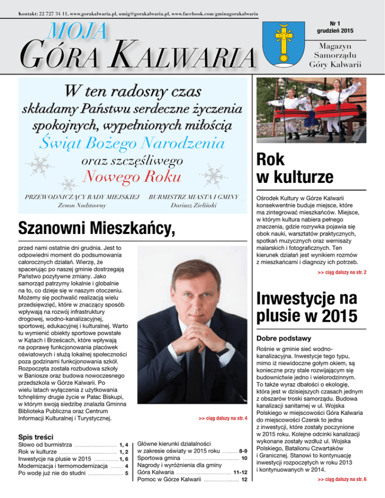 Kontakt: 22 727 34 11, www.gorakalwaria.pl, [email protected], www.facebook.com/gminagorakalwaria Moja Góra Kalwaria Nr 1 grudzień 2015 Magazyn Samorządu Góry Kalwarii W ten radosny czas składamy Państwu serdeczne życzenia spokojnych, wypełnionych miłością Świąt Bożego Narodzenia oraz szczęśliwego Nowego Roku Przewodniczący Rady Miejskiej Zenon Nadstawny Burmistrz Miasta i Gminy Dariusz Zieliński Szanowni Mieszkańcy, przed nami ostatnie dni grudnia. Jest to odpowiedni moment do podsumowania całorocznych działań. Wierzę, że spacerując po naszej gminie dostrzegają Państwo pozytywne zmiany. Jako samorząd patrzymy lokalnie i globalnie na to, co dzieje się w naszym otoczeniu. Możemy się pochwalić realizacją wielu przedsięwzięć, które w znaczący sposób wpływają na rozwój infrastruktury drogowej, wodno-kanalizacyjnej, sportowej, edukacyjnej i kulturalnej. Warto tu wymienić obiekty sportowe powstałe w Kątach i Brześcach, które wpływają na poprawę funkcjonowania placówek oświatowych i służą lokalnej społeczności poza godzinami funkcjonowania szkół. Rozpoczęta została rozbudowa szkoły w Baniosze oraz budowa nowoczesnego przedszkola w Górze Kalwarii. Po wielu latach wyłączenia z użytkowania tchnęliśmy drugie życie w Pałac Biskupi, w którym swoją siedzibę znalazła Gminna Biblioteka Publiczna oraz Centrum Informacji Kulturalnej i Turystycznej. Spis treści Słowo od burmistrza ........................... 1, 4 Rok w kulturze ..................................... 1, 2 Inwestycje na plusie w 2015 ................ 1, 6 Modernizacja i termomodernizacja ......... 4 Po wodę już nie do studni ....................... 5 Rok w kulturze Ośrodek Kultury w Górze Kalwarii konsekwentnie buduje miejsce, które ma zintegrować mieszkańców. Miejsce, w którym kultura nabiera pełnego znaczenia, gdzie rozrywka pojawia się obok nauki, warsztatów praktycznych, spotkań muzycznych oraz wernisaży malarskich i fotograficznych. Ten kierunek działań jest wynikiem rozmów z mieszkańcami i diagnozy ich potrzeb. >> ciąg dalszy na str. 2 Inwestycje na plusie w 2015 Dobre podstawy >> ciąg dalszy na str. 4 Główne kierunki działalności w zakresie oświaty w 2015 roku .......... 8-9 Sportowa gmina .................................... 10 Nagrody i wyróżnienia dla gminy Góra Kalwaria ................................... 11-12 Pomoc w Górze Kalwarii ....................... 12 Rośnie w gminie sieć wodnokanalizacyjna. Inwestycje tego typu, mimo iż niewidoczne gołym okiem, są konieczne przy stale rozwijającym się budownictwie jedno i wielorodzinnym. To także wyraz dbałości o ekologię, która jest w dzisiejszych czasach jednym z obszarów troski samorządu. Budowa kanalizacji sanitarnej w ul. Wojska Polskiego w miejscowości Góra Kalwaria do miejscowości Czersk to jedna z inwestycji, które zostały poczynione w 2015 roku. Kolejne odcinki kanalizacji wykonane zostały wzdłuż ul. Wojska Polskiego, Batalionu Czwartaków i Granicznej. Stanowi to kontynuację inwestycji rozpoczętych w roku 2013 i kontynuowanych w 2014. >> ciąg dalszy na str. 6 2 • Moja Góra Kalwaria Magazyn Samorządu Góry Kalwarii Rok w kulturze >> ciąg dalszy ze str. 1 Góra w Ruchu W 2015 r. rozpoczęto nowatorskie projekty, w tym „Górę w Ruchu”, która realizowana jest we współpracy z Instytutem Muzyki i Tańca w ramach programu MYŚL W RUCHU 2015. „Góra w Ruchu” to cykl warsztatów z różnych technik i stylów tanecznych oraz zajęcia o charakterze teoretycznym – pokazy filmowe, wykłady, dyskusje, spotkania z zaproszonymi gośćmi. Pod koniec listopada odbyło się widowisko kończące projekt, czyli spektakl taneczny zatytułowany „Alicje”. Dzień Różnorodności Kulturowej W ofercie znajdują się zajęcia, które od dawna cieszą się zainteresowaniem takie jak: warsztaty plastyczne, rysunek, fotografia, taniec ludowy i nowoczesny, modelarnia, nauka gry na instrumentach czy warsztaty teatralne. Coraz większym zainteresowaniem cieszą się wykłady Uniwersytetu Trzeciego Wieku. Nowością są zajęcia z ceramiki i studio piosenki. Góra w Ruchu Teatralna Niedziela dla najmłodszych Edukację kulturalną rozpoczyna się w Górze Kalwarii od najmłodszych lat. Z myślą o dzieciach przygotowano cykl spektakli w ramach „Teatralnej Niedzieli” oraz spotkań muzycznych dla melomaluszków, „Smykofonia na Mazowszu”. Do młodzieży skierowane są przedstawienia w ramach „Teatru Lektur Szkolnych” i spotkania z muzyką, czyli koncerty Filharmonii Narodowej. W grafiku dla dorosłych znalazły się monodramy, małe formy teatralne i spektakle m.in. „Wdowy” wg S. Mrożka, „Wodewil Warszawski” i „Małe zbrodnie małżeńskie”, czy sztuka Jeana PierreDopagne „Belfer” – monodram w wykonaniu Wojciecha Pszoniaka. Niesłabnącą popularnością cieszą się kabarety. Bilety na przedstawienie „Skurcz” kabaretu Ani Mru-Mru sprzedały się błyskawicznie. W tym roku można było również obejrzeć premierowe spektakle zagrane przez rodzimych artystów – „Małego księcia” w wykonaniu Teatru Beznazwy oraz „Konopielnik” przygotowany przez Teatr Albocoś. Dzień Dziecka Gminne Święto Plonów Święto Góry Kalwarii – koncert zespołu Wilki Festiwal Kolorów Otwarcie komnaty kasztelana na Zamku w Czersku Magazyn Samorządu Góry Kalwarii Festiwale i wolontariat Moja Góra Kalwaria • 3 Turniej Rycerski na Zamku w Czersku Kontynuowany jest Festiwal KLAPS, czyli przegląd filmów amatorskich, którego finał odbył się 17 października. W organizacji tej imprezy pomagali wolontariusze działający przy Ośrodku Kultury. Wcześniej, w sierpniu, zorganizowali oni imprezę dla młodzieży, której barwnym zakończeniem był festiwal kolorów. Zamek w Czersku mocnym akcentem kulturalnym Na Zamku Książąt Mazowieckich w tym roku już po raz VII odbył się Turniej Rycerski. Czersk jest ważnym punktem na mapie nie t