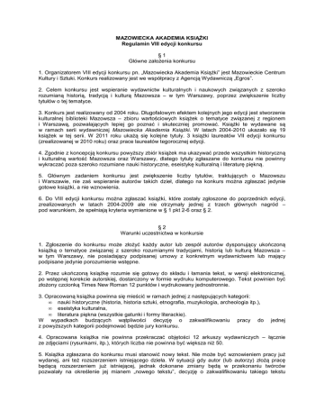 MAZOWIECKA AKADEMIA KSIĄŻKI Regulamin VIII edycji konkursu §1 Główne założenia konkursu 1. Organizatorem VIII edycji konkursu pn. „Mazowiecka Akademia Książki” jest Mazowieckie Centrum Kultury i Sztuki. Konkurs realizowany jest we współpracy z Agencją Wydawniczą „Egros”. 2. Celem konkursu jest wspieranie wydawnictw kulturalnych i naukowych związanych z szeroko rozumianą historią, tradycją i kulturą Mazowsza – w tym Warszawy, poprzez zwiększenie liczby tytułów o tej tematyce. 3. Konkurs jest realizowany od 2004 roku. Długofalowym efektem kolejnych jego edycji jest stworzenie kulturalnej biblioteki Mazowsza – zbioru wartościowych książek o tematyce związanej z regionem i Warszawą, pozwalających lepiej go poznać i skuteczniej promować. Książki te wydawane są w ramach serii wydawniczej Mazowiecka Akademia Książki. W latach 2004-2010 ukazało się 19 książek w tej serii. W 2011 roku ukażą się kolejne tytuły. 3 książki laureatów VII edycji konkursu (zrealizowanej w 2010 roku) oraz prace laureatów tegorocznej edycji. 4. Zgodnie z koncepcją konkursu powyższy zbiór książek ma ukazywać przede wszystkim historyczną i kulturalną wartość Mazowsza oraz Warszawy, dlatego tytuły zgłaszane do konkursu nie powinny wykraczać poza szeroko rozumiane nauki historyczne, eseistykę kulturalną i literaturę piękną. 5. Głównym zadaniem konkursu jest zwiększenie liczby tytułów, traktujących o Mazowszu i Warszawie, nie zaś wspieranie autorów takich dzieł, dlatego na konkurs można zgłaszać jedynie gotowe książki, a nie wznowienia. 6. Do VIII edycji konkursu można zgłaszać książki, które zostały zgłoszone do poprzednich edycji, zrealizowanych w latach 2004-2009 ale nie otrzymały jednej z trzech głównych nagród – pod warunkiem, że spełniają kryteria wymienione w § 1 pkt 2-6 oraz § 2. §2 Warunki uczestnictwa w konkursie 1. Zgłoszenie do konkursu może złożyć każdy autor lub zespół autorów dysponujący ukończoną książką o tematyce związanej z szeroko rozumianymi tradycjami, historią lub kulturą Mazowsza – w tym Warszawy, nie posiadający podpisanej umowy z konkretnym wydawnictwem lub mający podpisane jedynie porozumienie wstępne. 2. Przez ukończoną książkę rozumie się gotowy do składu i łamania tekst, w wersji elektronicznej, po wstępnej korekcie autorskiej, dostarczony w formie wydruku komputerowego. Tekst powinien być złożony czcionką Times New Roman 12 punktów i wydrukowany jednostronnie. 3. Opracowaną książka powinna się mieścić w ramach jednej z następujących kategorii: • nauki historyczne (historia, historia sztuki, etnografia, muzykologia, archeologia itp.), • eseistyka kulturalna, • literatura piękna (wszystkie gatunki i formy literackie). W wypadkach budzących wątpliwości decyzję o zakwalifikowaniu pracy do z powyższych kategorii podejmować będzie jury konkursu. jednej 4. Opracowana książka nie powinna przekraczać objętości 12 arkuszy wydawniczych – łącznie ze zdjęciami (rysunkami, itp.), których liczba nie powinna być większa niż 50. 5. Książka zgłaszana do konkursu musi stanowić nowy tekst. Nie może być wznowieniem pracy już wydanej, ani też rozszerzeniem istniejącego dzieła. W sytuacji gdy autor (lub autorzy) złożą pracę będącą rozszerzeniem już istniejącej, jednak dokonane zmiany będą w przekonaniu twórców pozwalały na określenie jej mianem „nowego tekstu”, decyzję o zakwalifikowaniu takiego tekstu do konkursu podejmować będzie jury, o ile autor lub autorzy zaznaczą we wniosku, że ich dzieło stanowi takie rozszerzenie. 6. Zgłoszone do konkursu teksty, stanowiące wznowienia istniejących prac, będą automatycznie odrzucane na etapie selekcji wstępnej. Taka sama procedura będzie stosowana w przypadku, gdy autor (autorzy) nie zaznaczy w Formularzu zgłoszeniowym odpowiedniej rubryki informującej jury, że przedstawiona praca stanowi modyfikację lub rozszerzenie już istniejącego dzieła. 7. Zgłoszenia do konkursu należy składać na Formularzu zgłoszeniowym, stanowiącym załącznik do niniejszego regulaminu, w siedzibie Mazowieckiego Centrum Kultury i Sztuki w Warszawie, przy ul. Elektoralnej 12, w dni powszednie w godzinach 10.00–14.00, w pokoju nr 18, tel. (22) 586 42 45. Do formularza należy dołączyć ukończoną książkę (w rozumieniu § 2 p. 2 niniejszego regulaminu). 8. Zgłoszenia przyjmowane będą do 31 maja 2011 roku. 9. Teksty nie zakwalifikowane do konkursu z powodów wymienionych w § 2 p. 5 i 6 lub zgłoszone po terminie określonym w § 2 p. 8 będą zwracane autorom do 30 czerwca 2011 roku. Pozostałe teksty zostaną zwrócone autorom najpóźniej do 30 września 2011 roku. §3 Sposób oceny zgłoszonych książek 1. Wszystkie zgłoszone do konkursu prace zostaną ocenione przez jury konkursu, składające się z ekspertów w dziedzinie nauk historycznych i literatury pięknej oraz przedstawicieli Mazowieckiego Centrum Kultury i Sztuki i Agencji Wydawniczej „Egros”. 2. Spośród zgłoszonych tekstów jury wybierze nie więcej niż 3 książki. Ich autorzy otrzymają nagrody: Mazowieckie Maki oraz honoraria autorskie. Książki zostaną wydane drukiem ze środków Mazowieckiego Centrum Kultury i Sztuki oraz Agencji Wydawniczej „Egros”. 3. Oficjalne ogłoszenie wyników konkursu nastąpi podczas uroczystości jego zakończenia, która odbędzie się nie później niż 15 grudnia 2011 roku. §4 Warunki wydania wybranych prac 1. Wybrane przez jury prace zostaną wydane w 2011 roku w możliwe najwyższym standardzie merytorycznym i edytorskim ze środków Mazowieckiego Centrum Kultury i Sztuki oraz Agencji Wydawniczej „Egros”. Wysokość nakładu każdej z wydawanych książek będzie nie mniejsza niż 1000 egzemplarzy. 2. Każdy z autorów (lub zespołów autorów), poza uzgodnionym z Mazowieckim Centrum Kultury i Sztuki honorarium otrzyma egzemplarze autorski