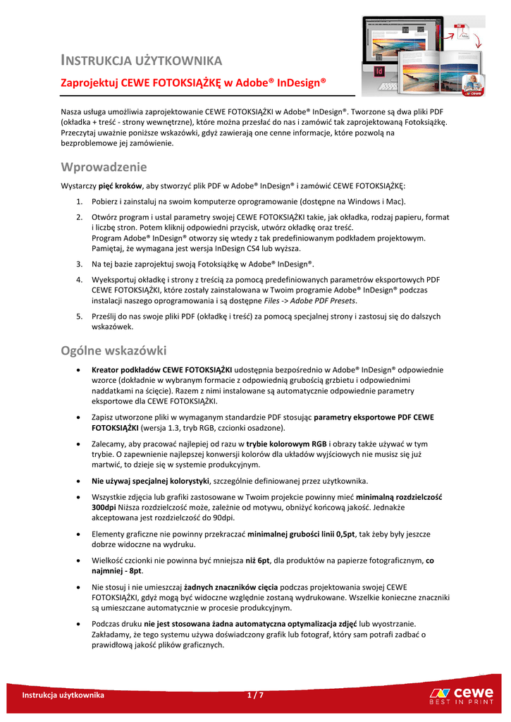 INSTRUKCJA UŻYTKOWNIKA Zaprojektuj CEWE FOTOKSIĄŻKĘ w Adobe® InDesign® Nasza usługa umożliwia zaprojektowanie CEWE FOTOKSIĄŻKI w Adobe® InDesign®. Tworzone są dwa pliki PDF (okładka + treść - strony wewnętrzne), które można przesłać do nas i zamówić tak zaprojektowaną Fotoksiążkę. Przeczytaj uważnie poniższe wskazówki, gdyż zawierają one cenne informacje, które pozwolą na bezproblemowe jej zamówienie. Wprowadzenie Wystarczy pięć kroków, aby stworzyć plik PDF w Adobe® InDesign® i zamówić CEWE FOTOKSIĄŻKĘ: 1. Pobierz i zainstaluj na swoim komputerze oprogramowanie (dostępne na Windows i Mac). 2. Otwórz program i ustal parametry swojej CEWE FOTOKSIĄŻKI takie, jak okładka, rodzaj papieru, format i liczbę stron. Potem kliknij odpowiedni przycisk, utwórz okładkę oraz treść. Program Adobe® InDesign® otworzy się wtedy z tak predefiniowanym podkładem projektowym. Pamiętaj, że wymagana jest wersja InDesign CS4 lub wyższa. 3. Na tej bazie zaprojektuj swoją Fotoksiążkę w Adobe® InDesign®. 4. Wyeksportuj okładkę i strony z treścią za pomocą predefiniowanych parametrów eksportowych PDF CEWE FOTOKSIĄŻKI, które zostały zainstalowana w Twoim programie Adobe® InDesign® podczas instalacji naszego oprogramowania i są dostępne Files -> Adobe PDF Presets. 5. Prześlij do nas swoje pliki PDF (okładkę i treść) za pomocą specjalnej strony i zastosuj się do dalszych wskazówek. Ogólne wskazówki Kreator podkładów CEWE FOTOKSIĄŻKI udostępnia bezpośrednio w Adobe® InDesign® odpowiednie wzorce (dokładnie w wybranym formacie z odpowiednią grubością grzbietu i odpowiednimi naddatkami na ścięcie). Razem z nimi instalowane są automatycznie odpowiednie parametry eksportowe dla CEWE FOTOKSIĄŻKI. Zapisz utworzone pliki w wymaganym standardzie PDF stosując parametry eksportowe PDF CEWE FOTOKSIĄŻKI (wersja 1.3, tryb RGB, czcionki osadzone). Zalecamy, aby pracować najlepiej od razu w trybie kolorowym RGB i obrazy także używać w tym trybie. O zapewnienie najlepszej konwersji kolorów dla układów wyjściowych nie musisz się już martwić, to dzieje się w systemie produkcyjnym. Nie używaj specjalnej kolorystyki, szczególnie definiowanej przez użytkownika. Wszystkie zdjęcia lub grafiki zastosowane w Twoim projekcie powinny mieć minimalną rozdzielczość 300dpi Niższa rozdzielczość może, zależnie od motywu, obniżyć końcową jakość. Jednakże akceptowana jest rozdzielczość do 90dpi. Elementy graficzne nie powinny przekraczać minimalnej grubości linii 0,5pt, tak żeby były jeszcze dobrze widoczne na wydruku. Wielkość czcionki nie powinna być mniejsza niż 6pt, dla produktów na papierze fotograficznym, co najmniej - 8pt. Nie stosuj i nie umieszczaj żadnych znaczników cięcia podczas projektowania swojej CEWE FOTOKSIĄŻKI, gdyż mogą być widoczne względnie zostaną wydrukowane. Wszelkie konieczne znaczniki są umieszczane automatycznie w procesie produkcyjnym. Podczas druku nie jest stosowana żadna automatyczna optymalizacja zdjęć lub wyostrzanie. Zakładamy, że tego systemu używa doświadczony grafik lub fotograf, który sam potrafi zadbać o prawidłową jakość plików graficznych. Instrukcja użytkownika 1/7 Krok 1 - instalacja Pobierz z naszej strony i zainstaluj kreator "PDF dla CEWE FOTOKSIĄŻKI" (dostępny dla Windows i Mac). Krok 2 - wybór produktu Otwórz program "PDF dla CEWE FOTOKSIĄŻKI" i wprowadź parametry wybranej CEWE FOTOKSIĄŻKI. Trzeba utworzyć dwa pliki PDF do projektu Fotoksiążki. Jeden PDF zawiera treść (strony wewnętrzne). Drugi to okładka. W programie wybierz typ okładki, rodzaj papieru, format Fotoksiążki i liczbę stron. Potem otwórz odpowiednio podkład dla okładki lub stron wewnętrznych z treścią w Adobe® InDesign®. Możesz teraz rozpocząć projektowanie wybranych elementów. Obsługiwane są InDesign® w wersjach CS4, CS5, CS 5.5, CS6 i CC. Podkład z treścią (strony wewnętrzne) Wszystkie CEWE FOTOKSIĄŻKI zawierają minimum 26 stron z treścią. Liczbę tę można zwiększać w kroku, co 8 stron. Maksymalna liczba stron zależy od formatu oraz rodzaju papieru. Wybierz po prostu wymagane parametry w oknie programu. Podkład z okładką Szerokość grzbietu Fotoksiążki zależy od liczby jej stron i od rodzaju użytego papieru. Aby wybrać właściwą okładkę do naszej Fotoksiążki zacznij najpierw od określenia liczby stron z treścią. Jeśli jeszcze nie wiadomo ile stron będzie liczyć CEWE FOTOKSIĄŻKA zalecamy utworzenie okładki po zaprojektowaniu stron wewnętrznych i ostatecznym ustaleniu ich końcowej liczby. Instrukcja użytkownika 2/7 Informacje o produkcie Za pomocą aplikacji "PDF dla CEWE FOTOKSIĄŻKI" możesz stworzyć Fotoksiążki drukowane na papierze cyfrowym w twardej lub miękkiej okładce lub naświetlane na papierze fotograficznym z płaskimi podwójnymi stronami. Istnieje kilka podstawowych różnic pomiędzy tymi dwoma rodzajami papieru. CEWE FOTOKSIĄŻKA druk cyfrowy (twarda i miękka okładka, bindowanie standardowe) Te Fotoksiążki są drukowane za pomocą wysokiej klasy cyfrowych maszyn drukarskich Łączenie oprawy wysokiej jakości bindowaniem klejonym. Do dyspozycji jest okładka twardą lub miękką. Możesz wybierać między następującymi rodzajami papieru (powierzchniami): standard, błyszczący, matowy Premium. CEWE FOTOKSIĄŻKA na papierze fotograficznym (twarda okładka, bindowanie Layflat) Strony wewnętrzne są naświetlane na naświetlarkach (printerach) na papierze fotograficznym. Bindowane LayFlat (płaskie łączenie podwójnych stron). Twarda okładka Papier fotograficzny stron wewnętrznych: matowy lub błyszczący. Wszystkie szczegółowe informacje znajdziesz na stronie programu. Krok 3 - praca z podkładami Po otwarciu podkładu można już zaprojektować swoją CEWE FOTOKSIĄŻKĘ w Adobe® InDesign® (od wersji CS4): W projekcie możesz zastosować zdjęcia, grafi