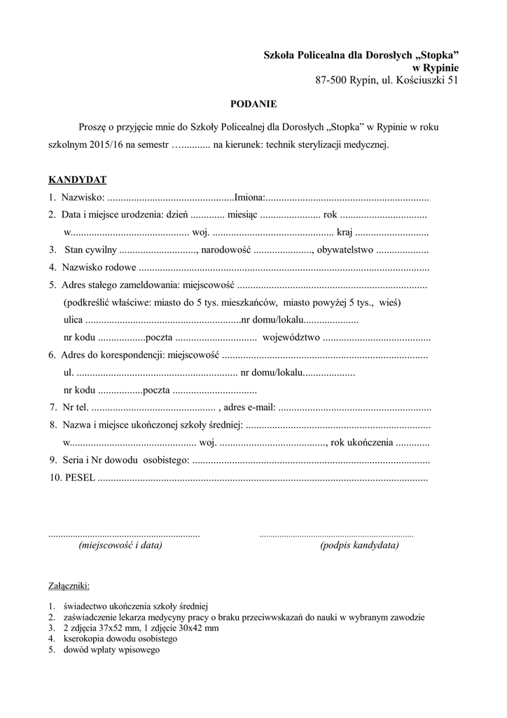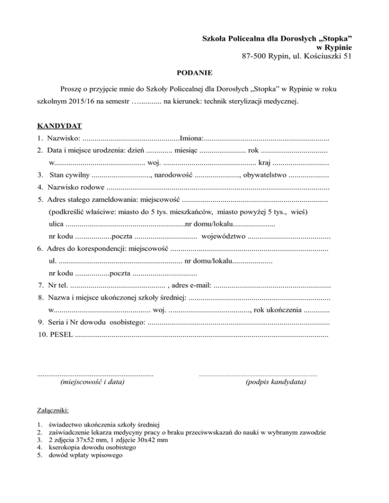 Szkoła Policealna dla Dorosłych „Stopka” w Rypinie 87-500 Rypin, ul. Kościuszki 51 PODANIE Proszę o przyjęcie mnie do Szkoły Policealnej dla Dorosłych „Stopka” w Rypinie w roku szkolnym 2015/16 na semestr …........... na kierunek: technik sterylizacji medycznej. KANDYDAT 1. Nazwisko: ................................................Imiona:.............................................................. 2. Data i miejsce urodzenia: dzień ............. miesiąc ....................... rok ................................. w............................................. woj. .............................................. kraj ............................ 3. Stan cywilny ............................., narodowość ......................, obywatelstwo .................... 4. Nazwisko rodowe .............................................................................................................. 5. Adres stałego zameldowania: miejscowość ........................................................................ (podkreślić właściwe: miasto do 5 tys. mieszkańców, miasto powyżej 5 tys., wieś) ulica ...........................................................nr domu/lokalu..................... nr kodu ..................poczta ............................... województwo ......................................... 6. Adres do korespondencji: miejscowość .............................................................................. ul. ............................................................. nr domu/lokalu.................... nr kodu .................poczta ................................ 7. Nr tel. ............................................... , adres e-mail: .......................................................... 8. Nazwa i miejsce ukończonej szkoły średniej: ...................................................................... w................................................ woj. ........................................, rok ukończenia ............. 9. Seria i Nr dowodu osobistego: .......................................................................................... 10. PESEL ............................................................................................................................. .............................................................. (miejscowość i data) ..................................................................... (podpis kandydata) Załączniki: 1. 2. 3. 4. 5. świadectwo ukończenia szkoły średniej zaświadczenie lekarza medycyny pracy o braku przeciwwskazań do nauki w wybranym zawodzie 2 zdjęcia 37x52 mm, 1 zdjęcie 30x42 mm kserokopia dowodu osobistego dowód wpłaty wpisowego ANKIETA KWALIFIKACYJNA 1 Imię i nazwisko 2 Wykształcenie, posiadany tytuł 3 Nazwy i rok ukończenia szkół: - średniej - policealnej / wyższej 4 Uzyskane końcowe oceny z przedmiotów - biologia 5 Wybór języka obcego 6 Doświadczenie zawodowe - staż pracy - aktualne/ostatnie miejsce pracy 7 Uzasadnienie wyboru Szkoły Policealnej dla Dorosłych "Stopka" w Rypinie 8 Źródło informacji o Szkole Policealnej dla Dorosłych "Stopka" w Rypinie OŚWIADCZENIE Oświadczam, że zgodnie z art. 24 Ustawy z dnia 29 sierpnia 1997 roku o ochronie danych osobowych (Dz.U. z 1997 r. Nr 133, poz. 883 ze zm.) zostałam (em) poinformowana(y) o tym, że: 1) szkoła jest administratorem danych osobowych, które zbierane są w celu spełnienia wymagań prawa oświatowego w związku z rekrutacją do szkoły i realizacją procesu dydaktycznego; 2) przewidywanymi odbiorcami danych osobowych będą: nauczyciele i inni upoważnieni pracownicy szkoły oraz SSP"Stopka", a także inne podmioty prowadzące bazy danych szkół; 3) słuchacz ma prawo dostępu do treści swoich danych osobowych oraz ich poprawiania; 4) słuchacz ma obowiązek podania danych osobowych wynikający z przepisów prawa oświatowego. .............................................................. (miejscowość i data) ...................................................................... (podpis kandydata)