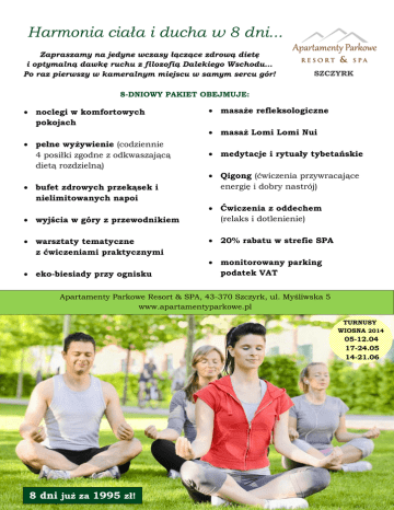 Harmonia ciała i ducha w 8 dni... Zapraszamy na jedyne wczasy łączące zdrową dietę i optymalną dawkę ruchu z filozofią Dalekiego Wschodu… Po raz pierwszy w kameralnym miejscu w samym sercu gór! SZCZYRK 8-DNIOWY PAKIET OBEJMUJE: noclegi w komfortowych pokojach masaże refleksologiczne masaż Lomi Lomi Nui pełne wyżywienie (codziennie 4 posiłki zgodne z odkwaszającą dietą rozdzielną) bufet zdrowych przekąsek i nielimitowanych napoi wyjścia w góry z przewodnikiem warsztaty tematyczne z ćwiczeniami praktycznymi eko-biesiady przy ognisku medytacje i rytuały tybetańskie Qigong (ćwiczenia przywracające energię i dobry nastrój) Ćwiczenia z oddechem (relaks i dotlenienie) 20% rabatu w strefie SPA monitorowany parking podatek VAT Apartamenty Parkowe Resort & SPA, 43-370 Szczyrk, ul. Myśliwska 5 www.apartamentyparkowe.pl TURNUSY WIOSNA 2014 05-12.04 17-24.05 14-21.06 8 dni już za 1995 zł!