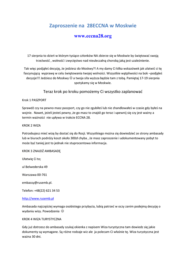 Zaproszenie na 28ECCNA w Moskwie www.eccna28.org 17 sierpnia to dzień w którym tysiące członków NA zbierze się w Moskwie by świętować swoją trzeźwość , wolność i zwycięstwo nad nieuleczalną chorobą jaką jest uzależnienie. Tak więc podjąłeś decyzję, że jedziesz do Moskwy?! A my damy Ci kilka wskazówek jak ułatwić ci tę fascynującą wyprawę w celu świętowania twojej wolności. Wszystkie wątpliwości na bok –podjąłeś decyzje!!! Jedziesz do Moskwy a twoja siła wyższa będzie tam z tobą. Pamiętaj 17-19 sierpnia spotykamy się w Moskwie. Teraz krok po kroku pomożemy Ci wszystko zaplanować Krok 1 PASZPORT Sprawdź czy na pewno masz paszport, czy go nie zgubiłeś lub nie zhandlowałeś w czasie gdy byłeś na wojnie. Nawet, jeżeli jesteś pewny ,że go masz to znajdź go teraz i upewnij się czy jest ważny a termin ważności nie upływa w trakcie ECCNA 28. KROK 2 WIZA Potrzebujesz mieć wizę by dostać się do Rosji. Wszystkiego można się dowiedzieć ze strony ambasady lub w biurach podróży koszt około 300zł chyba , że masz zaproszenie i udokumentowany pobyt to może być taniej jest to jednak nie stuprocentowa informacja. KROK 3 ZNAJDŹ AMBASADĘ Ułatwię Ci to; ul Belwederska 49 Warszawa 00-761 [email protected]. Telefon: +48(22) 621 34 53 http://www.rusemb.pl Ambasada najczęściej wymaga osobistego przybycia, lubią patrzeć w oczy zanim podejmą decyzję o wydaniu wizy. Powodzenia KROK 4 WIZA TURYSTYCZNA Gdy już dotrzesz do ambasady szukaj okienka z napisem Wiza turystyczna tam dowiedz się jakie dokumenty są wymagane. Są różne rodzaje wiz ale ja polecam Ci właśnie tę. Wiza turystyczna jest ważna 30 dni. KROK 5 DOKUMENTY Powoli i bardzo dokładnie , ale pamiętaj bez stresu i lęku spisz po kolei wszystkie dokumenty które są wymagane do wniosku. Nie jest ich dużo. Zwróć uwagę na formularz wizowy , czasem ambasada chce by wypełnić go online . ważny jest też rozmiar/ciężar zdjęcia .Potrzebne są też potwierdzenia , ale o tym w kroku 6. Dowiedz się też o formę płatności, bo czasem nie przyjmują gotówki. Jeżeli będą wymagali objaśnienia celu podróży pamiętaj , że nie musisz mówić ,że jedziesz na Zlot Anonimowych Narkomanów no chyba że naprawdę chcesz. Bardziej popularne zazwyczaj jest zwiedzanie , urlop czy rozrywka i jest to całkowicie uczciwa odpowiedź. KROK 6 WYBÓR POTWIERDZENIA Potwierdzeniem są zwykle dwa dokumenty od rosyjskiego licencjonowanego operator (lub biuro podróży lub hotelu zarejestrowane przez rosyjskie Ministerstwo Spraw Zagranicznych - należy pamiętać, że nie każdy hotel jest zarejestrowany i może dać taki rodzaj potwierdzenia). Są to (1) list potwierdzający od takiego operatora oraz (2) voucher wydany przez takiego. Teraz tutaj masz wybór – możesz albo iść do biura podróży (najlepiej, gdy "Specjalizuje się" w rosyjskich wizach) i zamówić takie potwierdzenia od tego podmiotu - Możesz też napisać maila do Katy prosząc ją, aby pomogła w kontakcie z operatorem, (normalnie koszt potwierdzenia wystawione przez operatora wynosi około 40 $ do 50 $ ale zawarł umowę o zniżkach i będzie cię to kosztować poniżej 600 rubli (czyli około 15 $ do 20 $ - nie zły interes uważamy ☺). Należy pamiętać, że potwierdzenie może kosztować więcej dla uzależnionych z"krajów rozwijających się." Uważamy, że jest to tylko biurokratyczny sztuczka -. Jesteśmy tutaj, aby pomóc zmniejszyć koszty i dołożymy wszelkich starań. Tylko nie wahaj się do nas napisać . Uwaga -nie musisz mieć ani rezerwacji hotelu ani biletu gdy idziesz ubiegać się o wizy! Pisz do Katy na adres [email protected] KROK SIÓDMY ZŁOŻENIE WNIOSKU WIZOWEGO Teraz kiedy masz już wszystko wypełnione , otrzymałeś potwierdzenie i wszystko podpisałeś . Po prostu idź i złóż ją. Powodzenia. KROK ÓSMY GDZIE SIĘ ZATRZYMAĆ? Fantastycznie że masz już wizę , teraz zdecyduj gdzie się zatrzymasz po przybyciu do Moskwy. My proponujemy Big Home Hotel- the Salute. Jest to nie tylko hotel, przede wszystkim jest miejsce gdzie będzie odbywał się EDM. Tak więc atmosfera będzie mocno zdrowieniowa. A Ty jak kol wiek byś się nie czuł , zawsze będziesz miał świadomość , że za ścianą masz miting . Szczegóły na stronie. http://eccna28.org/guest-accommodation.html KROK DZIEWIĄTY REJESTRACJA Rejestracja jest ważna ponieważ zorganizowanie ECCNA to potężne przedsięwzięcie wymagające dużych nakładów pieniężnych a jak wiesz My jako NA finansujemy się sami tak więc Twoja rejestracja jest twoim osobistym wkładem i pomocą w zorganizowaniu tego wydarzenia. Szczegóły na stronie http://eccna28.org/pre-registration.html KROK DZIESIĄTY PRZEDPŁATA Mieliśmy ogromne problemy z ujednoliceniem i wybraniem dogodnej formy ze względu na niekompatybilność systemów bakowo operacyjnych Rosji z Innymi krajami. Uznaliśmy ,że najlepszą formą jest dokonanie przelewu z twojego banku na Nasze konto wysokości 25 Euro lub 35 $ przed 17 lipca 2012. UWAGA!!! Przed dokonaniem takiego przelewu zapytaj bank o wysokość prowizji, bywają bardzo wysoki i może się to zupełnie nie opłacać. W takim przypadku lepszym rozwiązaniem jest zapłacenie Rejestracji na miejscu w Moskwie w wyskości 35Euro lub 45$. KROK 11 REZERWUJ BILET To chyba najłatwiejsza część przygotowań, zasady są proste, im wcześniej tym taniej Loty zazwyczaj są bezpośrednie. Pamiętaj że są trzy międzynarodowe lotniska. Jeśli wylądujesz na Domodiedowo lub Sheremetyevo to najlepszym i najszybszym sposobem, by dotrzeć do Moskwy jest pociąg pospieszny. Jeśli przybędziesz na Wnukowo co jest mniej prawdopodobne), a pobyt masz w hotelu Salute - wtedy można rozważyć taksówkę Vnukovo jest blisko Salute. Tylko pamiętaj, aby korzystać z licencjonowanych taksówek (posiadają reprezentatywne postoje w portach lotniczych) i unikać prywatnych kierowców. I ponownie - napisz do nas z jakim