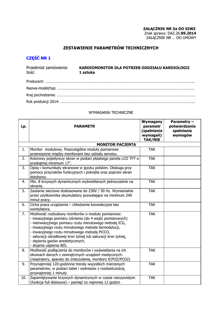 ZAŁĄCZNIK NR 5a DO SIWZ Znak sprawy: DAZ.26.89.2014 ZAŁĄCZNIK NR … DO UMOWY ZESTAWIENIE PARAMETRÓW TECHNICZNYCH CZĘŚĆ NR 1 Przedmiot zamówienia: Ilość: KARDIOMONITOR DLA POTRZEB ODDZIAŁU KARDIOLOGII 1 sztuka Producent: ………………………………………………………………………………………………………………………………... Nazwa-model/typ: ……………………………………………………………………………………………………………………… Kraj pochodzenia: ………………………………………………………………………………………………………………………. Rok produkcji 2014: …………………………………………………………………………………………………………………... WYMAGANIA TECHNICZNE Lp. 1. 2. 3. 4. 5. 6. 7. 8. 9. 10. PARAMETR MONITOR PACJENTA Monitor modułowy. Poszczególne moduły pomiarowe przenoszone między monitorami bez udziału serwisu. Kolorowy pojedynczy ekran w postaci płaskiego panela LCD TFT o przekątnej minimum 17". Opisy i komunikaty ekranowe w języku polskim. Obsługa przy pomocy przycisków funkcyjnych i pokrętła oraz poprzez ekran dotykowy. Min. 8 krzywych dynamicznych wyświetlanych jednocześnie na ekranie. Zasilanie sieciowe dostosowane do 230V / 50 Hz. Wymienialne przez użytkownika akumulatory pozwalające na minimum 240 minut pracy. Cicha praca urządzenia – chłodzenie konwekcyjne bez wentylatora. Możliwość rozbudowy monitorów o moduły pomiarowe: - inwazyjnego pomiaru ciśnienia (do 4 wejść pomiarowych) - nieinwazyjnego pomiaru rzutu minutowego metodą ICG, - inwazyjnego rzutu minutowego metoda termodylucji, - inwazyjnego rzutu minutowego metodą PiCCO, - saturacji ośrodkowej krwi żylnej lub saturacji krwi żylnej, - stężenia gazów anestetycznych, - stopnia uśpienia BIS. Możliwość podłączenia do monitorów i wyświetlania na ich ekranach danych z zewnętrznych urządzeń medycznych: (respiratory, aparaty do znieczulania, monitory tCPO2/PCO2) Przynajmniej 120-godzinne trendy wszystkich mierzonych parametrów, w postaci tabel i wykresów z rozdzielczością przynajmniej 1 minuty Zapamiętywanie krzywych dynamicznych w czasie rzeczywistym (funkcja full dislosure) – pamięć co najmniej 12 godzin Wymagany parametr (spełnienie wymagań) TAK/NIE TAK TAK TAK TAK TAK TAK TAK TAK TAK TAK Parametry – potwierdzenie spełnienia wymogów Lp. PARAMETR 11. Zapamiętywanie co najmniej 100 zdarzeń alarmowych (krzywe i odpowiadające im wartości parametrów) Monitor wyposażony w funkcje obliczeń dawki (lekowych), hemodynamicznych, natlenienia, nerkowych i wentylacji Funkcja wyświetlania na ekranie monitora pacjenta stopera Możliwość wykonywania wydruków uruchamianych z poziomu kardiomonitora przy wykorzystaniu drukarki laserowej na standardowym papierze A4. Monitor przystosowany do eksportu danych do standardowego komputera osobistego niepełniącego jednocześnie funkcji centrali (na wyposażeniu kardiomonitora oprogramowanie do archiwizacji danych na PC). Cicha praca monitora – chłodzenie konwekcyjne bez zastosowania wentylatora. Monitor wyposażony w co najmniej dwa gniazda USB (możliwość podłączenia myszki, klawiatury, przenoszenia danych i konfiguracji) W komplecie z monitorem uchwyt do mocowania na ścianie z koszykiem na akcesoria MIERZONE PARAMETRY EKG - pomiar częstości akcji serca. Zakres minimum 30 - 300/min Monitorowanie do 7 odprowadzeń jednocześnie W komplecie z monitorem przewód EKG z dwoma kompletami 5 końcówek Analiza arytmii – wykrywanie co najmniej 21 kategorii zaburzeń rytmu Analiza odcinka ST co najmniej w zakresie do -2,0 do +2,0 mV. Prezentacja zmian w odcinku ST w postaci referencyjnych wzorców z nanoszonymi bieżącymi odcinkami ST. Saturacja (SpO2) – wyświetlanie krzywej pletyzmograficznej, % saturacji (zakres co najmniej 1-100%), częstości pulsu (zakres co najmniej 40-240 P/min). Funkcja pozwalająca na jednoczesny pomiar SpO2 i nieinwazyjnego ciśnienia bez wywoływania alarmu SpO2 w momencie pompowania mankietu na kończynie, na której założony jest czujnik. W komplecie z monitorem przewód interfejsowy oraz wielorazowy czujnik SpO2 typu klips na palec Nieinwazyjny pomiar ciśnienia metoda oscylometryczna. Pomiar ręczny i automatyczny. Wyświetlane wartości ciśnienia skurczowego (zakres co najmniej 40-270 mmHg), rozkurczowego (zakres co najmniej 10-200 mmHg), średniego (zakres co najmniej 20-220 mmHg) oraz częstości pulsu (zakres pomiarowy co najmniej 40-240 P/min). Pomiar automatyczny z regulowanym interwałem 1 - 240. Prezentacja wartości: skurczowej, rozkurczowej oraz średniej . Funkcja stazy. W komplecie z monitorem przewód oraz mankiety dla dorosłych: duży, średni (2 szt.), mały. Pomiar temperatury (zakres co najmniej 10-45oC), dwa tory pomiarowe. Możliwość wyświetlania T1, T2 oraz różnicy między nimi. 12. 13. 14. 15. 16. 17. 18. 19. 20. 21. 22. 23. 24. 25. 26. 27. 28. Wymagany parametr (spełnienie wymagań) TAK/NIE TAK TAK TAK TAK TAK TAK TAK TAK TAK TAK TAK TAK TAK TAK TAK TAK TAK TAK Parametry – potwierdzenie spełnienia wymogów Lp. PARAMETR 29. W komplecie z monitorem czujnik temperatury dla dorosłych: powierzchniowy Monitor współpracujący z posiadana przez użytkownika centralą Hypervisor Pozostałe wymagania Podać inne funkcje i akcesoria oferowane w cenie, Aparatura fabrycznie nowa, rok produkcji 2014 Gwarancja min. 24 miesiące obejmująca cały system z wykonaniem co najmniej dwóch przeglądów okresowych (jeden na rok lub częściej wg zaleceń producenta) w czasie jej trwania z wykorzystaniem tzw. zestawów przeglądowych. Czas reakcji na zgłoszoną awarię (przyjęcie zgłoszenia – podjęta naprawa) max. 2 dni robocze w okresie gwarancyjnym i pogwarancyjnym, usunięcie usterki w terminie max. 5 dni roboczych. Podstawienie aparatury zastępczej na czas naprawy w przypadk