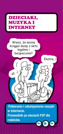 DZIECIAKI, MUZYKA I INTERNET Pobieranie i udostępnianie muzyki w internecie. Przewodnik po sieciach P2P dla rodziców. Co to jest P2P? Jako rodzice na pewno nie raz słyszeliście, jak dzieci rozmawiają o sieciach „pirtupir” (peer to peer, lub inaczej P2P), ściąganiu i udostępnianiu (file-sharing) muzyki w internecie. Tym właśnie dzieciaki dziś żyją. A powód jest prosty: muzyka. Ludzie zawsze pragnęli dzielić się muzyką z innymi. Wraz z rozwojem internetu wymienianie się swoimi ulubionymi utworami ze znajomymi (i nieznajomymi) w dowolnym miejscu na Ziemi stało się niezwykle łatwe – podobnie jak wymienianie się zdjęciami w technologii cyfrowej. Sieci peer to peer, takie jak KaZaA, LimeWire, eMule, BitTorrent, DC++, które oferują taką możliwość, mają miliony użytkowników na całym świecie. O serwisach P2P wielokrotnie pisały media w aspekcie prawnym, związanym z udostępnianiem w nich chronionych prawem autorskim nagrań muzycznych i filmów. To jednak tylko jedno z zagrożeń. Niniejsza broszura ukazuje szerszy kontekst tego zagadnienia: niepożądane treści w internecie, ograniczona możliwość zachowania prywatności i bezpieczeństwa w sieci, a także ryzyko konsekwencji prawnych. Zawiera informacje o tym w jaki sposób korzystać z muzyki dostępnej w internecie, a jednocześnie postępować zgodnie z prawem i unikać wielu zagrożeń. „W jaki sposób moje dziecko może korzystać z muzyki dostępnej w internecie bezpiecznie i zgodnie z prawem?” Jak działa P2P? Każda z sieci P2P jest nieco inna, ale zasada działania jest podobna: aby współdzielić pliki należy pobrać z internetu oprogramowanie P2P i zainstalować na swoim komputerze. Zwykle program sam od razu utworzy folder „współdzielone pliki” (shared media), który będzie dostępny dla innych użytkowników tego oprogramowania na całym świecie. Dzięki takiemu bezpośredniemu połączeniu między komputerami, wszyscy użytkownicy mogą w łatwy sposób wymieniać się zdjęciami, filmami, a także nagraniami muzycznymi, oprogramowaniem i grami komputerowymi. Najbardziej popularne programy do udostępniania plików to eMule, BitTorrent, DC++ i Kazaa. W sieci eMule i BitTorrent pobierane pliki są automatycznie udostępniane innym użytkownikom sieci, w przypadku DC++ i Kazaa - można pobierać pliki i zablokować funkcję dalszego udostępniania. Jednak w przypadku DC++ bardzo często się zdarza, że aby móc pobrać wybrane treści należy udostępnić określoną ilość swoich danych (czasami jest to 1 GB danych, a czasami więcej). I właśnie wtedy istnieje zagrożenie udostępniania swoich osobistych, często poufnych plików, które wraz z innymi treściami tworzą wymaganą objętość. W jaki sposób moje dziecko może być zagrożone? Możliwość wymieniania się plikami w internecie ma swoje dobre strony. Jeżeli np. skomponujemy utwór muzyczny, w sieci mogą wysłuchać go miliony osób na całym świecie. Ale sieci P2P stwarzają też realne zagrożenia. NIEBEZPIECZNE TREŚCI / NIEPOŻ ĄDANY KONTAKT Największym zagrożeniem dla dzieci są pojawiające się w sieciach P2P niepożądane treści, takie jak pornografia i przemoc. Badania internetu potwierdzają, że zdjęcia pornograficzne są udostępniane w sieciach P2P na szeroką skalę. Pliki zawierające takie treści często posiadają mylące nazwy zachęcające do ich ściągnięcia, np. „Kubuś Puchatek” albo „Pokemon”. Filtry, które stosują blokady według słów kluczowych i adresów niepożądanych stron internetowych, rzadko blokują dostęp do zdjęć i filmów zawierających pornograficzne i brutalne treści w sieciach P2P. „Czy w sieciach Rodzice powinni także wiedzieć P2P moje o tym, że oprogramowanie dziecko może służące do wymieniania się uzyskać dostęp do plikami w internecie umożliwia pornografii?” także komunikowanie się przez internet („czatowanie”) z innymi użytkownikami, zwykle nieznajomymi. W przypadku korzystania z sieci P2P należy więc brać również pod uwagę wszystkie takie zagrożenia i stosować zasady, które towarzyszą prowadzeniu „czatu” w internecie. Więcej informacji na ten temat można znaleźć na stronie www.dzieckowsieci.pl PRYWATNOŚĆ I BEZPIECZEŃTWO Oprogramowanie do udostępniania plików otwiera dostęp do naszego komputera, przez co stwarza zagrożenie dla naszej prywatności i bezpieczeństwa. Spyware – Największym zagrożeniem jest tzw. spyware – niewielkie programy szpiegujące, które bez naszej wiedzy ściągane są wraz z niektórymi plikami multimedialnymi albo oprogramowaniem do udostępniania plików. Niektóre z nich rejestrują uderzenia w klawisze klawiatury komputera. W ten sposób osoba kontrolująca taki program uzyskuje dostęp do naszych haseł, numerów kart kredytowych i innych poufnych informacji, zawartych na naszym komputerze. Prywatność – Istnieje niebezpieczeństwo, że udostępniając swoje pliki nieodwracalnie przekażemy innym użytkownikom więcej niż mieliśmy zamiar udostępnić. Może to dotyczyć także informacji poufnych, np. naszych danych osobistych. Wirusy – Komputery osób, które udostępniają pliki w sieciach P2P są narażone na działanie złośliwego oprogramowania lub wirusów, które mogą spowodować, iż nasz komputer zostanie wykorzystany do rozsyłania różnych treści, między innymi „spamu”, tj. niechcianych „Czy wiadomości pocztowych. Badania ktoś wykazały, że niemal 50% mógłby plików z oprogramowaniem mieć dostęp komputerowym, dostępnych do naszych w jednej z sieci P2P, zawierało prywatnych wirusy i inne złośliwe kody. plików?” Jeżeli nasze dziecko ściągnie plik zawierający taki złośliwy kod, nasz komputer może być użyty m.in. do dystrybucji treści pornograficznych. Kiedy zauważymy, że nasz komputer działa wolniej, problemem mogą być zainstalowane programy do udostępniania i pobierania plików. RYZYKO KONSEKWENCJI P