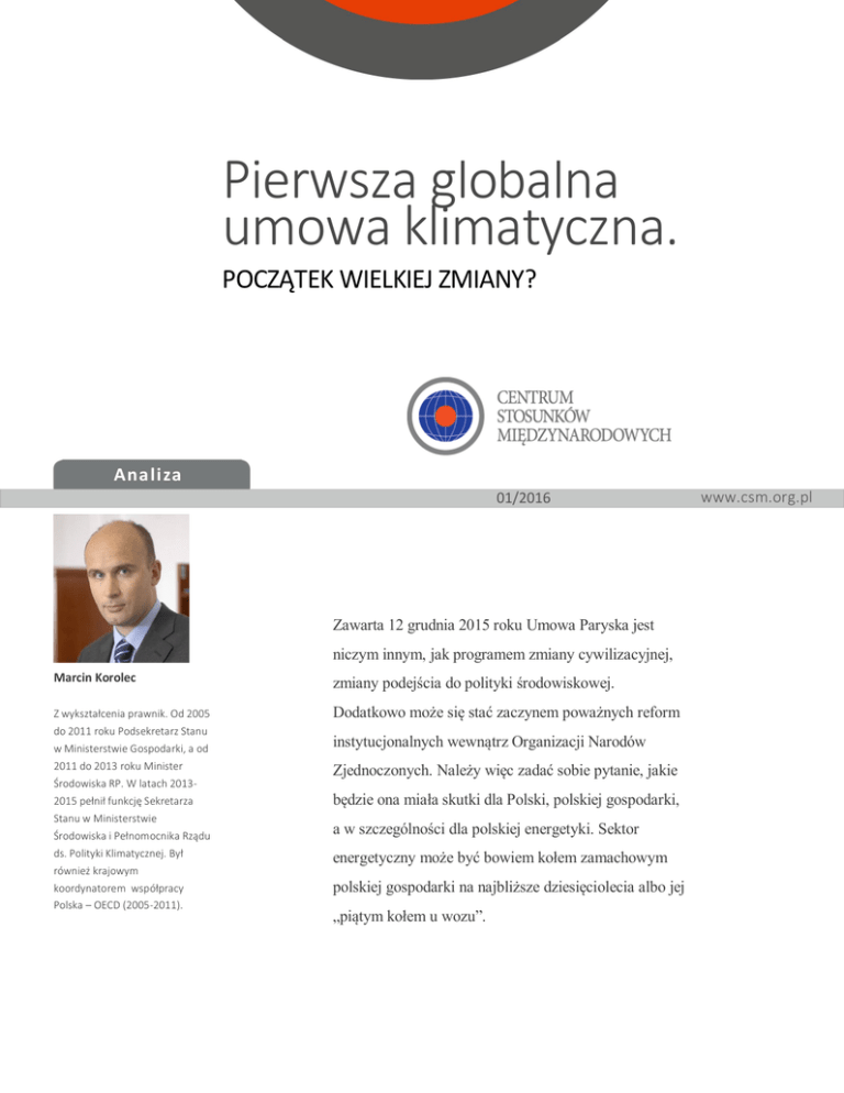 Pierwsza globalna umowa klimatyczna. POCZĄTEK WIELKIEJ ZMIANY? Analiza 01/2016 Zawarta 12 grudnia 2015 roku Umowa Paryska jest niczym innym, jak programem zmiany cywilizacyjnej, Marcin Korolec zmiany podejścia do polityki środowiskowej. Z wykształcenia prawnik. Od 2005 Dodatkowo może się stać zaczynem poważnych reform do 2011 roku Podsekretarz Stanu w Ministerstwie Gospodarki, a od 2011 do 2013 roku Minister Środowiska RP. W latach 20132015 pełnił funkcję Sekretarza Stanu w Ministerstwie Środowiska i Pełnomocnika Rządu ds. Polityki Klimatycznej. Był również krajowym koordynatorem współpracy Polska – OECD (2005-2011). instytucjonalnych wewnątrz Organizacji Narodów Zjednoczonych. Należy więc zadać sobie pytanie, jakie będzie ona miała skutki dla Polski, polskiej gospodarki, a w szczególności dla polskiej energetyki. Sektor energetyczny może być bowiem kołem zamachowym polskiej gospodarki na najbliższe dziesięciolecia albo jej „piątym kołem u wozu”. www.csm.org.pl PIERWSZA GLOBALNA UMOWA KLIMATYCZNA. POCZĄTEK WIELKIEJ ZMIANY? | Marcin Korolec 2 Nie ma wątpliwości, że zawarta 12 grudnia 2015 roku Umowa Paryska ma charakter przełomowy, historyczny. Ostatni akord dwudziestej pierwszej Konferencji Stron Konwencji Klimatycznej, tzw. COP21, był bardzo miły. Można by powiedzieć, że starzy przyjaciele spotkali się po latach w paryski wieczór. Na twarzach Minister Claudii Salerno z Wenezueli, Todda Sterna ze Stanów Zjednoczonych i Xie Zhenhua, Specjalnego Wysłannika Rządu Chińskiej Republiki Ludowej, widać było szczery uśmiech i ulgę wskazującą na poczucie dobrze wypełnionego obowiązku. Jedynie Paul Oquist, Minister z Nikaragui, również należący do tych, którzy uczestniczyli w spotkaniu w grudniu 2009 roku w Kopenhadze (COP15), które zakończyło się fiaskiem, wyraził pewne zaniepokojenie w związku z pośpiesznym, jego zdaniem, zamknięciem dyskusji nad nowym porozumieniem. Jak do tego doszło? W Kopenhadze ci sami aktorzy, którzy umieli się porozumieć w Paryżu, skakali sobie do gardeł. Symbolem Konferencji COP15 stała się ta sama Claudia Salerno, przemawiająca na ceremonii zamknięcia z uniesioną, krwawiącą ręką, którą skaleczyła, bo tak mocno waliła w stół protestując przeciwko projektowi Umowy globalnej i przeciwko sposobowi prowadzenia obrad przez Prezydencję duńską. Cytowała odpowiednie zapisy Karty Narodów Zjednoczonych i Konwencji Klimatycznej, które gwarantują zachowanie zasady suwerenności państwowej. Przez cały czas trwania Konferencji Prezydencja COP15 próbowała narzucić swoją wizję Umowy, nie zwracając uwagi na sprzeciw szeregu państw uczestniczących w negocjacjach. W trakcie COP21 w Paryżu, po raz pierwszy od czasu zawarcia Konwencji Klimatycznej Organizacji Narodów Zjednoczonych w 1992 roku, wszystkie 195 państw członkowskich podjęło zobowiązania nie tylko aby wspólnie podejmować wysiłki związane z walką z globalnym ociepleniem klimatycznym, ale także – a może przede wszystkim – że każde z nich będzie podejmowało indywidualny wysiłek walki ze zmianami klimatycznymi, co będzie prowadzić do redukcji emisji gazów cieplarnianych. Ale co w zasadzie jest przedmiotem Umowy zawartej przez 195 państw? Nad czym kilkuset negocjatorów z całego świata dyskutowało przez ostatnie cztery lata, a w ciągu pierwszych dwóch tygodni grudnia tak naprawdę dniami i nocami? Co spowo- PIERWSZA GLOBALNA UMOWA KLIMATYCZNA. POCZĄTEK WIELKIEJ ZMIANY? | Marcin Korolec 3 dowało, że 6 lat po fiasku w Kopenhadze ci sami aktorzy nie tylko wyrazili zgodę, ale również gratulowali sobie sukcesu, jakim jest uzgodnienie tekstu Umowy Paryskiej? Historyczne porozumienie Znaczenie Umowy zawartej w Paryżu będzie z pewnością wykraczać poza zapisy w niej zawarte, a z czasem będziemy poznawali pełny wpływ tych ustaleń na globalną politykę i gospodarkę. Najważniejsze obszary negocjacyjne Umowy były próbą odpowiedzi na następujące pytania: jak w drugiej dekadzie XXI wieku realizować zasadę wspólnej, lecz zróżnicowanej odpowiedzialności poszczególnych państw (CBDR – Common but Differentiated Responsibilities)? jak stworzyć mechanizm prawny, aby zawarta w Paryżu Umowa miała jak najbardziej wymierny skutek (w żargonie negocjacyjnym ten problem był nazywany Ambicją)? jak powinno wyglądać globalne finansowanie polityki klimatycznej po roku 2020? czy i jak powinien zostać przewidziany w Umowie mechanizm rekompensaty za szkody wyrządzone kataklizmami klimatycznymi (w żargonie negocjacyj- nym ten obszar nazywany jest Loss and Damage)? Oczywiście, 195 państw miało również swoje indywidualne cele. Polska delegacja zwracała uwagę na znaczenie pochłaniania dwutlenku węgla przez lasy, a na przykład Arabia Saudyjska walczyła o tzw. Response measures, czyli zagwarantowanie mechanizmów ochrony dla gospodarek, które w sposób oczywisty ucierpią w wyniku realizacji polityki klimatycznej. Podobnych indywidualnych celów negocjacyjnych w Paryżu było wiele. Część ustaleń została zawarta w Umowie Paryskiej, a część we wprowadzanej w życie znacznie bardziej szczegółowej Decyzji COP. Aby wejść w życie, Umowa musi zostać ratyfikowana zgodnie z wewnętrznymi procedurami państw - sygnatariuszy. Postanowienia zawarte w Decyzji COP nie wymagają ratyfikacji, a więc nie wymagają potwierdzenia ich zastosowania w stosunku do poszczególnych państw. Poniższa analiza jest oparta o lekturę obu tych dokumentów. Największy problem negocjacyjny Najczęściej używanym skrótem w dyskusjach klimatycznych jest CBDR: Common but Differentiated Responsibilities, czyli PIERWSZA GLOBALNA UMOWA KLIMATYCZNA. POCZĄTEK WIELKIEJ ZMIANY? | Marcin Korolec 4 „wspólna, lecz zróżnicowana odpowiedzialność”. To nie tylko fundamentalna zasada funkcjonowania Organizacji Narodów Zjednoczonych, ale również jedna z fundamentalnych zasad Konwencji Klimatyc