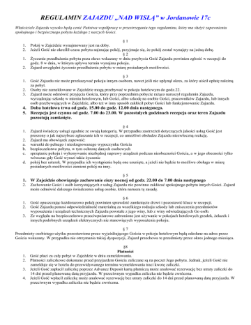 REGULAMIN ZAJAZDU „NAD WISŁĄ” w Jordanowie 17c Właściciele Zajazdu wysoko będą cenić Państwa współpracę w przestrzeganiu tego regulaminu, który ma służyć zapewnieniu spokojnego i bezpiecznego pobytu każdego z naszych Gości. 1. 2. 1. 2. 1. 2. 3. §1 Pokój w Zajeździe wynajmowany jest na doby. Jeżeli Gość nie określił czasu pobytu najmując pokój, przyjmuje się, że pokój został wynajęty na jedną dobę. §2 Życzenie przedłużenia pobytu poza okres wskazany w dniu przybycia Gość Zajazdu powinien zgłosić w recepcji do godz. 8 w dniu, w którym upływa termin wynajmu pokoju. Zajazd uwzględni życzenie przedłużenia pobytu w miarę posiadanych możliwości. §3 Gość Zajazdu nie może przekazywać pokoju innym osobom, nawet jeśli nie upłynął okres, za który uiścił opłatę należną za pobyt. Osoby nie zameldowane w Zajeździe mogą przebywać w pokoju hotelowym do godz.22. Zajazd może odmówić przyjęcia Gościa, który przy poprzednim pobycie rażąco naruszył regulamin Zajazdu, wyrządzając szkodę w mieniu hotelowym, lub Gości, albo szkodę na osobie Gości, pracowników Zajazdu, lub innych osób przebywających w Zajeździe, albo też w inny sposób zakłócił pobyt Gości lub funkcjonowanie Zajazdu. 4. Doba hotelowa trwa od godz. 15.00 do godz. 12.00 dnia następnego. 5. Recepcja jest czynna od godz. 7.00 do 23.00. W pozostałych godzinach recepcja oraz teren Zajazdu pozostają zamknięte. 1. 2. a. b. c. d. §4 Zajazd świadczy usługi zgodnie ze swoją kategorią. W przypadku zastrzeżeń dotyczących jakości usług Gość jest proszony o jak najszybsze zgłaszanie ich w recepcji, co umożliwi obsłudze Zajazdu niezwłoczną reakcję. Zajazd ma obowiązek zapewnić: warunki do pełnego i nieskrępowanego wypoczynku Gościa bezpieczeństwo pobytu, w tym ochronę danych osobowych sprzątanie pokoju i wykonywanie niezbędnej naprawy urządzeń podczas nieobecności Gościa, a w jego obecności tylko wówczas gdy Gość wyrazi takie życzenie pokój bez usterek. W przypadku ich wystąpienia będą one usunięte, a jeżeli nie będzie to możliwe obsługa w miarę posiadanych możliwości zamieni pokój na inny. §5 1. W Zajeździe obowiązuje zachowanie ciszy nocnej od godz. 22.00 do 7.00 dnia następnego 2. 1. 2. 3. Zachowanie Gości i osób korzystających z usług Zajazdu nie powinno zakłócać spokojnego pobytu innych Gości. Zajazd może odmówić dalszego świadczenia usług osobie, która narusza tę zasadę. §6 Gość opuszczając każdorazowo pokój powinien sprawdzić zamknięcie drzwi i pozostawić klucz w recepcji. Gość Zajazdu ponosi odpowiedzialność materialną za wszelkiego rodzaju szkody lub zniszczenia przedmiotów wyposażenia i urządzeń technicznych Zajazdu powstałe z jego winy, lub z winy odwiedzających Go osób. Ze względu na bezpieczeństwo przeciwpożarowe zabronione jest używanie w pokojach hotelowych grzałek, żelazek i innych podobnych urządzeń elektrycznych nie stanowiących wyposażenia pokoju. §7 Przedmioty osobistego użytku pozostawione przez wyjeżdżającego Gościa w pokoju hotelowym będą odesłane na adres przez Gościa wskazany. W przypadku nie otrzymania takiej dyspozycji, Zajazd przechowa te przedmioty przez okres jednego miesiąca. 1. 2. 3. 4. §8 Płatności Gość płaci za cały pobyt w Zajeździe w dniu zameldowania. Płatności zaliczkowe dokonane przed przyjazdem Gościa zaliczane są na poczet Jego pobytu. Jednak, jeżeli Gość nie zamelduje się w hotelu do przewidywanego terminu wymeldowania traci kwotę zaliczki. Jeżeli Gość zapłacił zaliczkę poprzez Advance Deposit kartą płatniczą może anulować rezerwację bez utraty zaliczki do 14 dni przed planowaną datą przyjazdu. W przeciwnym wypadku zaliczka nie będzie zwrócona. Jeżeli Gość wpłacił zaliczkę może anulować rezerwację bez utraty zaliczki do 14 dni przed planowaną datą przyjazdu. W przeciwnym wypadku zaliczka nie będzie zwrócona.