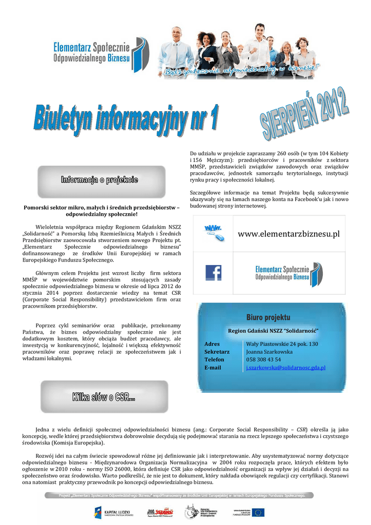 Do udziału w projekcie zapraszamy 260 osób (w tym 104 Kobiety i 156 Mężczyzn): przedsiębiorców i pracowników z sektora MMŚP, przedstawicieli związków zawodowych oraz związków pracodawców, jednostek samorządu terytorialnego, instytucji rynku pracy i społeczności lokalnej. Pomorski sektor mikro, małych i średnich przedsiębiorstw – odpowiedzialny społecznie! Szczegółowe informacje na temat Projektu będą sukcesywnie ukazywały się na łamach naszego konta na Facebook’u jak i nowo budowanej strony internetowej. Wieloletnia współpraca między Regionem Gdańskim NSZZ „Solidarność” a Pomorską Izbą Rzemieślniczą Małych i Średnich Przedsiębiorstw zaowocowała stworzeniem nowego Projektu pt. „Elementarz Społecznie odpowiedzialnego biznesu” dofinansowanego ze środków Unii Europejskiej w ramach Europejskiego Funduszu Społecznego. www.elementarzbiznesu.pl Głównym celem Projektu jest wzrost liczby firm sektora MMŚP w województwie pomorskim stosujących zasady społecznie odpowiedzialnego biznesu w okresie od lipca 2012 do stycznia 2014 poprzez dostarczenie wiedzy na temat CSR (Corporate Social Responsibility) przedstawicielom firm oraz pracownikom przedsiębiorstw. Poprzez cykl seminariów oraz publikacje, przekonamy Państwa, że biznes odpowiedzialny społecznie nie jest dodatkowym kosztem, który obciąża budżet pracodawcy, ale inwestycją w konkurencyjność, lojalność i większą efektywność pracowników oraz poprawę relacji ze społeczeństwem jak i władzami lokalnymi. Region Gdański NSZZ “Solidarność” Adres Sekretarz Telefon E-mail Wały Piastowskie 24 pok. 130 Joanna Szarkowska 058 308 43 54 [email protected] Jedna z wielu definicji społecznej odpowiedzialności biznesu (ang.: Corporate Social Responsibility – CSR) określa ją jako koncepcję, wedle której przedsiębiorstwa dobrowolnie decydują się podejmować starania na rzecz lepszego społeczeństwa i czystszego środowiska (Komisja Europejska). Rozwój idei na całym świecie spowodował różne jej definiowanie jak i interpretowanie. Aby usystematyzować normy dotyczące odpowiedzialnego biznesu - Międzynarodowa Organizacja Normalizacyjna w 2004 roku rozpoczęła prace, których efektem było ogłoszenie w 2010 roku - normy ISO 26000, która definiuje CSR jako odpowiedzialność organizacji za wpływ jej działań i decyzji na społeczeństwo oraz środowisko. Warto podkreślić, że nie jest to dokument, który nakłada obowiązek regulacji czy certyfikacji. Stanowi ona natomiast praktyczny przewodnik po koncepcji odpowiedzialnego biznesu. Region Gdański NSZZ „Solidarność” w partnerstwie z Pomorską Izbą Rzemieślniczą Małych i Średnich Przedsiębiorstw -rozpoczął realizację nowego projektu współfinansowanego ze środków Unii Europejskiej w ramach Europejskiego Funduszu Społecznego - „Elementarz Społecznie Odpowiedzialnego Biznesu”. Z tej okazji rozmawiamy z Kierownikiem Projektu – Panią Jagną Łobodzińską: To już kolejny projekt realizowany w partnerstwie między Regionem Gdańskim NSZZ „Solidarność” a Pomorską Izbą Rzemieślniczą Małych i Średnich Przedsiębiorstw – jakie są Państwa wspólne doświadczenia w realizacji przedsięwzięć? Oba nasze związki – pracowników jak i pracodawców - są przykładem jak wspólny dialog oparty na zaufaniu oraz rzeczowe artykułowanie problemów, z jakimi spotykają się członkowie naszych instytucji prowadzą do wspólnych inicjatyw z korzyścią dla każdej ze stron rynku pracy. Środki unijne przyczyniły się do zainicjowania szeregu wspólnych projektów. Już w 2005 roku, zrealizowaliśmy wspólnie projekt „Integracja społeczna i zawodowa grup zagrożonych wykluczeniem” wspierający osoby długotrwale bezrobotne. Następnie wraz z szerszą grupą partnerów zrealizowaliśmy projekty: „Partnerstwo na rzecz przedsiębiorczości osób zatrudnionych w przemyśle stoczniowym”, „Pomorska Sieć Wsparcia Pracowników Sektora Stoczniowego” oraz projekt „Pomorskie Partnerstwo na Rzecz Flexicurity”. W ramach powyższych projektów udzieliliśmy beneficjentom kolejno: pomocy w założeniu własnej działalności gospodarczej, szkoleń zawodowych oraz informatycznych, doradztwo zawodowe oraz szerzyliśmy koncepcję bezpieczeństwa zatrudnienia i organizacji pracy oraz ustawicznego kształcenia się, które odpowiada potrzebom rynku pracy. Od lipca 2012 roku realizują Państwo wspólnie Projekt „Elementarz Społecznie Odpowiedzialnego Biznesu” – proszę przybliżyć czytelnikom powód wybrania właśnie tej tematyki. Społecznie odpowiedzialny biznes (CSR - Corporate Social Responsibility) jest od lat dobrze znany w Unii Europejskiej. Koncepcja CSR jest dobrowolną strategią funkcjonowania i prowadzenia firmy w sposób przejrzysty z uwzględnieniem zasad etycznych, w poczuciu odpowiedzialności za klienta, pracownika, inwestora, udziałowca, społeczeństwo i środowisko. W Polsce etyczny biznes był długo rugowany z życia społecznego. Po upadku komunizmu, Polska weszła w fazę transformacji ustrojowej, której nie towarzyszyło stworzenie odpowiednich mechanizmów chroniących obywateli w trudnej sytuacji społecznej. Od 1989 roku mamy do czynienia z rosnącą ilością mikro, małych i średnich przedsiębiorstw, które wypracowują obecnie 2/3 Produktu Krajowego Brutto oraz generują 2/3 miejsc pracy w Polsce. Właśnie dla tego segmentu przedsiębiorstw skierowany jest nasz projekt w celu popularyzacji idei społecznej odpowiedzialności biznesu, która najczęściej stosowana jest przez duże firmy, często z zagranicznym kapitałem.. Od kilku lat mamy do czynienia ze spowolnieniem gospodarczym. Przedsiębiorstwa, aby być dalej konkurencyjne – muszą ograniczać koszty. Państwo chcą narzucić kolejne obciążenia na pracodawców? Każdy pracodawca, który planuje długofalowo rozwój swojego przedsiębiorstwa dostrzeże w idei społecznej odpo