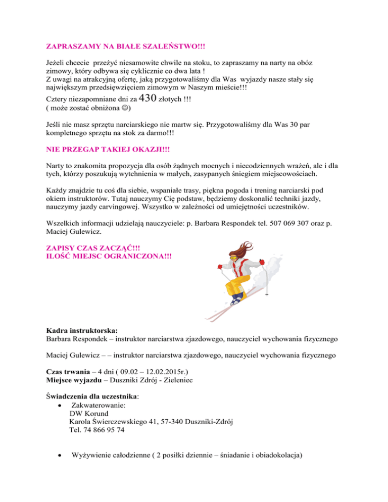 ZAPRASZAMY NA BIAŁE SZALEŃSTWO!!! Jeżeli chcecie przeżyć niesamowite chwile na stoku, to zapraszamy na narty na obóz zimowy, który odbywa się cyklicznie co dwa lata ! Z uwagi na atrakcyjną ofertę, jaką przygotowaliśmy dla Was wyjazdy nasze stały się największym przedsięwzięciem zimowym w Naszym mieście!!! Cztery niezapomniane dni za 430 złotych !!! ( może zostać obniżona ) Jeśli nie masz sprzętu narciarskiego nie martw się. Przygotowaliśmy dla Was 30 par kompletnego sprzętu na stok za darmo!!! NIE PRZEGAP TAKIEJ OKAZJI!!! Narty to znakomita propozycja dla osób żądnych mocnych i niecodziennych wrażeń, ale i dla tych, którzy poszukują wytchnienia w małych, zasypanych śniegiem miejscowościach. Każdy znajdzie tu coś dla siebie, wspaniałe trasy, piękna pogoda i trening narciarski pod okiem instruktorów. Tutaj nauczymy Cię podstaw, będziemy doskonalić techniki jazdy, nauczymy jazdy carvingowej. Wszystko w zależności od umiejętności uczestników. Wszelkich informacji udzielają nauczyciele: p. Barbara Respondek tel. 507 069 307 oraz p. Maciej Gulewicz. ZAPISY CZAS ZACZĄĆ!!! ILOŚĆ MIEJSC OGRANICZONA!!! Kadra instruktorska: Barbara Respondek – instruktor narciarstwa zjazdowego, nauczyciel wychowania fizycznego Maciej Gulewicz – – instruktor narciarstwa zjazdowego, nauczyciel wychowania fizycznego Czas trwania – 4 dni ( 09.02 – 12.02.2015r.) Miejsce wyjazdu – Duszniki Zdrój - Zieleniec Świadczenia dla uczestnika: Zakwaterowanie: DW Korund Karola Świerczewskiego 41, 57-340 Duszniki-Zdrój Tel. 74 866 95 74 Wyżywienie całodzienne ( 2 posiłki dziennie – śniadanie i obiadokolacja) Karnety narciarskie Przejazd autokarem , Ewentualne wycieczki piesze i wyjazdowe do ciekawych miejsc w okolicy ( do uzgodnienia na miejscu) Ognisko, kulig, dyskoteki, i inne ewentualne atrakcje dostępne na miejscu Ubezpieczenie Opieka nauczycieli- instruktorów narciarskich Nauka i doskonalenie jazdy na nartach z instruktorami narciarskimi, nauczycielami w-f , udział w zawodach narciarskich ( slalom ) Zajęcia obowiązkowe z narciarstwa zjazdowego zorganizowane są w ciągu czterech godzin przed południem oraz trzech godzin po południu. Uczniowie, którzy chcą mogą także brać udział w konsultacjach, które odbywają się przez dwie godziny po kolacji. Program tych zajęć został opracowany na podstawie: "Programu nauczania narciarstwa zjazdowego" Kraków - PZN – 2000. Szkolenie podstawowe z narciarstwa zjazdowego dla uczniów gimnazjum objętych gminnym programem nauki jazdy na nartach w Kluczborku Cele obozu narciarskiego: poznanie zasad doboru sprzętu i ekwipunku narciarskiego, zdobycie umiejętności jazdy na nartach w stopniu średnim, poznanie zasad bezpieczeństwa na stoku, zdobycie doświadczenia poznawczego, przeżyć estetycznych pozwalających na minimalizację i likwidację znużenia, zmęczenia nauką szkolną i monotonią codziennie powtarzających się problemów i zadań, poznanie osobliwości przyrody, relaksu i autentycznego odpoczynku psychicznego, wyrobienie nawyku aktywnego wypoczywania, zaspokajania potrzeby relaksu, doskonalenia umysłu, ducha i ciała, integracja grupy, poprawienie stosunków interpersonalnych w grupie, kształtowanie świadomych postaw, odnoszących się do wartości, wynikających ze stosunku do świata, idei, osób, rzeczy. Przebieg szkolenia narciarskiego Pierwsze zajęcia (4 godz.):- elementy podstawowe - pozycja narciarza, kroki (krok zwykły, bezkrok), zwroty (zwrot przestępowaniem, zwrot przez przełożenia nart, zwrot podskokiem), podejścia (podchodzenie schodkowaniem, podchodzenie trawersem, podejście rozkrokiem), upadanie i podnoszenie się;- jazda na wprost w linii spadku stoku; jazda w skos stoku - zmiana kierunku jazdy przestępowaniem;- pług - pług ślizgowy, pług hamujący, pług do zatrzymania; Drugie zajęcia (4 godz.):- doskonalenie elementów technicznych z poprzednich zajęć + krok łyżwowy;- półpług, ześlizg skośny;- jazda wyciągiem;- łuki płużne;- konsultacje (2 godz.); Trzecie zajęcia (4 godz.):- doskonalenie łuków płużnych;- jazda w skos stoku narty równoległa + skręt z pługu;- jazda w skos stoku narty równoległe + skręt półpługu; Czwarte zajęcia (4 godz.):- doskonalenie jazdy w skos skręt z półpługu;- skręt stop;skręt szkolny z poszerzenia równoległego;- konsultacje (2 godz.); Piąte zajęcia (4 godz. - ).- doskonalenie skrętu szkolnego z poszerzenia równoległego;- skręt równoległy; Szóste zajęcia (4 godz.):- doskonalenie skrętu równoległego; Siódme zajęcia (3 godz.):- doskonalenie poznanych technik;- slalom;- jazda dowolna - podsumowanie zajęć. Dzień pierwszy Rozpakowanie, przydział pokoi, Podział na grupy, Zapoznanie z regulaminem, Zwiad terenowy – rozpoznanie terenu, Zajęcia programowe z instruktorem, Kominek – gry i zabawy Dzień drugi : Zasady bezpieczeństwa w górach, Zwrócenie uwagi na oznaczenia tras narciarskich, zachowania się na stoku, oraz korzystania z wyciągów, Omówienie podstawowych zasad bezpieczeństwa w razie zgubienia się, Przygotowanie sprzętu do zajęć ( dobór ubioru w zależności od panujących warunków na stoku ), Zajęcia programowe z instruktorem, Kominek: zabawy i konkursy, Jeżeli będzie taka możliwość, to zwiedzimy placówkę GOPR-u. Dzień trzeci : Ustalenie listy niezbędnych rzeczy, które ma mieć przy sobie narciarz wychodząc na stok, Zajęcia programowe na stoku z instruktorami, Podsumowanie obozu Zabawa taneczna – dyskoteka. Dzień czwarty SAMOKSZTAŁCENIE Zajęcia programowe z instruktorem, Slalom – zjazd na czas Pożegnanie z górami Wyjazd z Zieleńca do Kluczborka EKWIPUNEK NA 4- DNIOWY OBÓZ: zdrowie i dobry humor (w dużych ilościach), · kurtka zimowa ,wiatrówka, · czapka, szalik i rękawiczki (2 pary )· wygodne obuwie zimowe oraz obuwie sportowe· 4 zmiany bielizny dziennej, · 6 par bawełnianych skarpet,( kalesony ,rajtuzy)· 2 dresy, (lub 2 b