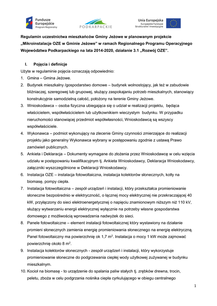 Regulamin uczestnictwa mieszkańców Gminy Jeżowe w planowanym projekcie „Mikroinstalacje OZE w Gminie Jeżowe” w ramach Regionalnego Programu Operacyjnego Województwa Podkarpackiego na lata 2014-2020, działanie 3.1 „Rozwój OZE”. I. Pojęcia i definicje Użyte w regulaminie pojęcia oznaczają odpowiednio: 1. Gmina – Gmina Jeżowe. 2. Budynek mieszkalny /gospodarstwo domowe – budynek wolnostojący, jak też w zabudowie bliźniaczej, szeregowej lub grupowej, służący zaspokajaniu potrzeb mieszkalnych, stanowiący konstrukcyjnie samodzielną całość, położony na terenie Gminy Jeżowe. 3. Wnioskodawca – osoba fizyczna ubiegająca się o udział w realizacji projektu, będąca właścicielem, współwłaścicielem lub użytkownikiem wieczystym budynku. W przypadku nieruchomości stanowiącej przedmiot współwłasności, Wnioskodawcą są wszyscy współwłaściciele. 4. Wykonawca – podmiot wykonujący na zlecenie Gminy czynności zmierzające do realizacji projektu jako generalny Wykonawca wybrany w postępowaniu zgodnie z ustawą Prawo zamówień publicznych. 5. Ankieta i Deklaracja – Dokumenty wymagane do złożenia przez Wnioskodawcę w celu wzięcia udziału w postępowaniu kwalifikacyjnym tj. Ankieta Wnioskodawcy, Deklaracja Wnioskodawcy, załączniki wyszczególnione w Deklaracji Wnioskodawcy. 6. Instalacja OZE – instalacja fotowoltaiczna, instalacja kolektorów słonecznych, kotły na biomasę, pompy ciepła. 7. Instalacja fotowoltaiczna – zespół urządzeń i instalacji, który przekształca promieniowanie słoneczne bezpośrednio w elektryczność, o łącznej mocy elektrycznej nie przekraczającej 40 kW, przyłączony do sieci elektroenergetycznej o napięciu znamionowym niższym niż 110 kV, służący wytwarzaniu energii elektrycznej wyłącznie na potrzeby własne gospodarstwa domowego z możliwością wprowadzenia nadwyżek do sieci. 8. Panele fotowoltaiczne – element instalacji fotowoltaicznej który wystawiony na działanie promieni słonecznych zamienia energię promieniowania słonecznego na energię elektryczną. Panel fotowoltaiczny ma powierzchnię ok 1,7 m2. Instalacja o mocy 1 kW może zajmować powierzchnię około 8 m2. 9. Instalacja kolektorów słonecznych - zespół urządzeń i instalacji, który wykorzystuje promieniowanie słoneczne do podgrzewania ciepłej wody użytkowej zużywanej w budynku mieszkalnym. 10. Kocioł na biomasę - to urządzenie do spalania paliw stałych tj. zrębków drewna, trocin, peletu, zboża w celu podgrzania nośnika ciepła cyrkulującego w obiegu centralnego 1 ogrzewania. 11. Kolektor słoneczny - element instalacji kolektorów słonecznych który wystawiony na działanie promieni słonecznych podgrzewa płynący w nich czynnik grzewczy. Kolektor słoneczny ma powierzchnię ok 2 m2. Instalacja kolektorów słonecznych dla 2-4 osobowej rodziny może zajmować powierzchnię do 6 m2. 12. Pompa ciepła - to urządzenia umożliwiające wykorzystanie ciepła niskotemperaturowego oraz odpadowego do ogrzewania, wentylacji i przygotowania ciepłej wody użytkowej. 13. Postępowanie kwalifikacyjne – Postępowanie, które ma na celu sporządzenie listy osób mających pierwszeństwo w ubieganiu się o udział w projekcie oraz sporządzenie listy rezerwowej. 14. Projekt – „Mikroinstalacje OZE w Gminie Jeżowe”, przedsięwzięcie mające na celu pozyskanie środków z ,,Regionalnego Programu Operacyjnego Województwa Podkarpackiego na lata 2014-2020, działanie 3.1 „Rozwój OZE” co przełoży się na dofinansowanie instalacji fotowoltaicznych i instalacji kolektorów słonecznych zamontowanych na budynkach Wnioskodawców. 15. Umowa – umowa pomiędzy Gminą i Wnioskodawcą, ustalająca szczegółowo obowiązki stron w zakresie przygotowania i realizacji projektu, w tym również warunki wykonania i eksploatacji instalacji fotowoltaicznej i Instalacji kolektorów słonecznych. 16. Koszt kwalifikowany – koszt który zostanie pokryty do 85% z funduszu przewidzianego do realizacji projektu. Wnioskodawca pokrywa min. 15% tego kosztu. 17. Koszt niekwalifikowany – koszt który nie zostanie pokryty z funduszu przewidzianego do realizacji projektu i w całości będzie poniesiony przez Wnioskodawcę. 18. Ustawa OZE - Ustawa z dnia 20 lutego 2015 r. o odnawialnych źródłach energii. 19. Regulamin – niniejszy regulamin. 20. Gmina Jeżowe dopuszcza wprowadzenie zmian w Regulaminie, w tym terminu wydłużenia naboru. Informacja tym zakresie zostanie umieszczona na stronie internetowej Gminy Jeżowe. II. Warunki udziału w postępowaniu kwalifikacyjnym 1. Nabór ankiet i deklaracji uczestnictwa w projekcie prowadzony jest przez Gminę Jeżowe w celu opracowania wniosku aplikacyjnego o dofinansowanie dostawy i montażu instalacji OZE w ramach Osi Priorytetowej 3 - Czysta energia, Działanie 3.1 „Rozwój OZE”, w ramach Regionalnego Programu Operacyjnego Województwa Podkarpackiego na lata 2014-2020 (RPO WP 2014-2020). 2. Ilość Wnioskodawców zakwalifikowanych do programu jest ograniczona, ze względu na wytyczne programowe i zapisy w Szczegółowym Opisie Osi Priorytetowych RPO WP 20142 2020, dlatego Ankiety i Deklaracje będą podlegać ocenie i weryfikacji ze względu na ograniczenie wielkości projektu Gminy – maksymalna moc urządzeń w wysokości do 2 MW (kolektory słoneczne i panele fotowoltaiczne), do 5MW (kotły na biomasę i pompy ciepła) oraz maksymalnej kwocie dofinansowania wynoszącej do 10 000 000 zł. 3. Przy tworzeniu listy Wnioskodawców będzie decydować kolejność wpływu wniosków. 4. Projekt będzie realizowany przez Gminę Jeżowe jedynie w przypadku otrzymania dofinansowania z RPO WP 2014-2020. 5. Poziom dofinansowania może wynieść maksymalnie 85 % kosztów kwalifikowanych brutto. 6. Dopuszcza się złożenie tylko jednej deklaracji wraz z ankietą na jeden budynek mieszkalny, w której Wnioskodawca wybiera tylko jeden rodzaj instalacji – instalację kolektorów sł
