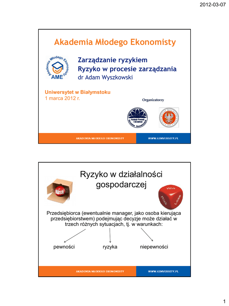 2012-03-07 Akademia Młodego Ekonomisty Zarządzanie ryzykiem Ryzyko w procesie zarządzania dr Adam Wyszkowski Uniwersytet w Białymstoku 1 marca 2012 r. Ryzyko w działalności gospodarczej Przedsiębiorca (ewentualnie manager, jako osoba kierująca przedsiębiorstwem) podejmując decyzje może działać w trzech różnych sytuacjach, tj. w warunkach: pewności ryzyka niepewności 1 2012-03-07 Ryzyko w działalności gospodarczej Sytuacja ryzyka będzie występować wówczas, gdy decydent jest w stanie zidentyfikować potencjalne korzyści i koszty podjętej decyzji oraz przypisać im szacunkowe prawdopodobieństwo. Wówczas podjęcie decyzji oparte jest na rachunku prawdopodobieństwa wystąpienia określonych skutków. Ryzyko w działalności gospodarczej Sytuacja niepewności zachodzi wówczas, gdy decydent nie jest w stanie przewidzieć wszystkich warunków, w których ma zamiar podjąć decyzję oraz jej skutków. Ten stan obecnie występuje najczęściej, bowiem zmiany zachodzące w otoczeniu są na tyle dynamiczne i nieprzewidywalne, że możliwości predykcji oraz identyfikacji skutków są bardzo ograniczone. 2 2012-03-07 Źródła ryzyka w działalności przedsiębiorstwa 3 2012-03-07 Zarządzanie ryzykiem w działalności gospodarczej Postawa osób zarządzających przedsiębiorstwem w stosunku do ryzyka może być co do zasady: pasywna lub aktywna. Zarządzanie ryzykiem w działalności gospodarczej Działanie przedsiębiorstwa w często zmieniającym się otoczeniu powoduje konieczność przybrania aktywnej postawy wobec zachodzących zmian. Ze względu na fakt, iż nie wszystkie te zmiany są znane przedsiębiorcy, chcąc zachować aktywną postawę, zmuszeni są oni do podejmowania szeregu czynności i działań związanych z zarządzaniem ryzkiem. 4 2012-03-07 Zarządzanie ryzykiem w działalności gospodarczej Zarządzanie ryzykiem jest procesem, który obejmuje działania mające na celu: • rozpoznanie, • ocenę i • sterowanie ryzykiem oraz • kontrolę podjętych działań. Celem zarządzania jest ograniczanie ryzyka oraz zabezpieczanie się przed jego skutkami. 5 2012-03-07 Celem rozpoznania - identyfikacji jest określenie rodzajów ryzyka, które wiążą się z rozważaną działalnością. Ich prawidłowe rozpoznanie jest o tyle istotne, że umożliwia przedsiębiorcy podjęcie działań mających na celu zabezpieczenie się przed nimi lub ich redukcję. Oceny ryzyka dokonuje się przez zastosowanie różnego rodzaju mierników. Ich wybór zależy od rodzaju ryzyka jakie podlega ocenie. Dzięki kwantyfikacji możliwe jest wskazanie tych czynników ryzyka, na które należy zwrócić szczególną uwagę. 6 2012-03-07 Na etapie sterowania podejmowane są działania mające na celu ograniczenie ryzyka do dopuszczalnych rozmiarów. Głównym celem etapu kontroli jest badanie efektywności podejmowany działań, mających na celu ograniczenie ryzyka. Do głównych zadań wykonywanych na tym etapie powinny należeć oceny: dokładności zastosowanych metod redukcji ryzyka, efektywności podjętych działań w zakresie sterowania ryzykiem, stopnia zgodności działań z odpowiednimi programami itp. 7 2012-03-07 Zadanie na teraz! Analiza ryzyka na przykładzie organizowania wycieczki szkolnej 8