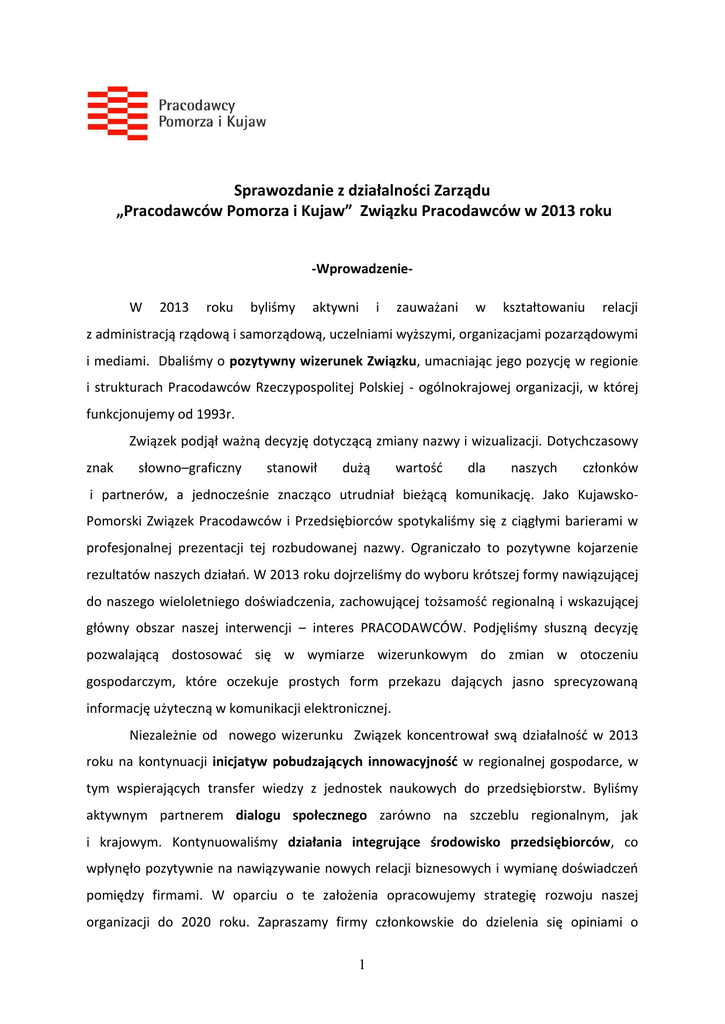 Sprawozdanie z działalności Zarządu „Pracodawców Pomorza i Kujaw” Związku Pracodawców w 2013 roku -WprowadzenieW 2013 roku byliśmy aktywni i zauważani w kształtowaniu relacji z administracją rządową i samorządową, uczelniami wyższymi, organizacjami pozarządowymi i mediami. Dbaliśmy o pozytywny wizerunek Związku, umacniając jego pozycję w regionie i strukturach Pracodawców Rzeczypospolitej Polskiej - ogólnokrajowej organizacji, w której funkcjonujemy od 1993r. Związek podjął ważną decyzję dotyczącą zmiany nazwy i wizualizacji. Dotychczasowy znak słowno–graficzny stanowił dużą wartość dla naszych członków i partnerów, a jednocześnie znacząco utrudniał bieżącą komunikację. Jako KujawskoPomorski Związek Pracodawców i Przedsiębiorców spotykaliśmy się z ciągłymi barierami w profesjonalnej prezentacji tej rozbudowanej nazwy. Ograniczało to pozytywne kojarzenie rezultatów naszych działań. W 2013 roku dojrzeliśmy do wyboru krótszej formy nawiązującej do naszego wieloletniego doświadczenia, zachowującej tożsamość regionalną i wskazującej główny obszar naszej interwencji – interes PRACODAWCÓW. Podjęliśmy słuszną decyzję pozwalającą dostosować się w wymiarze wizerunkowym do zmian w otoczeniu gospodarczym, które oczekuje prostych form przekazu dających jasno sprecyzowaną informację użyteczną w komunikacji elektronicznej. Niezależnie od nowego wizerunku Związek koncentrował swą działalność w 2013 roku na kontynuacji inicjatyw pobudzających innowacyjność w regionalnej gospodarce, w tym wspierających transfer wiedzy z jednostek naukowych do przedsiębiorstw. Byliśmy aktywnym partnerem dialogu społecznego zarówno na szczeblu regionalnym, jak i krajowym. Kontynuowaliśmy działania integrujące środowisko przedsiębiorców, co wpłynęło pozytywnie na nawiązywanie nowych relacji biznesowych i wymianę doświadczeń pomiędzy firmami. W oparciu o te założenia opracowujemy strategię rozwoju naszej organizacji do 2020 roku. Zapraszamy firmy członkowskie do dzielenia się opiniami o 1 potrzebach biznesowych oraz oczekiwanych kierunkach rozwoju Związku. Zarząd na podstawie analizy stanu otoczenia gospodarczego i dotychczasowych doświadczeń sformułował wstępnie wizję organizacji. Uważamy, iż w przyszłych latach powinniśmy koncentrować się na działaniach integrujących i proinnowacyjnych, które pozwolą stwierdzić, że: Pracodawcy Pomorza i Kujaw to opiniotwórczy i ekspercki reprezentant biznesu działający na rzecz współpracujących i wspierających się partnerów gospodarczych. Przed nami intensywna praca nad strategią, której zwieńczeniem będzie ostateczne sformułowanie celów strategicznych i operacyjnych dla Związku, a także określenie adekwatnych działań pozwalających na ich osiągnięcie. Wierzymy, iż wspólny wysiłek i prezentacja różnych propozycji przyniesie skuteczne rozwiązania, dzięki którym nasz Związek stanie się silną grupą przedsiębiorców działających w oparciu o innowacyjność i partnerstwo. -prace Zarządu i Prezydium - W 2013 roku zaszły zmiany w składzie Zarządu Związku. Rezygnację z pracy w Zarządzie z przyczyn osobistych złożyli: Tadeusz Kosień prezes zarządu Sklejka Multi SA, Robert Wieluński prezes zarządu Autosar Wieluński Sp. z o.o oraz Konrad Mikołajski były prezes zarządu Zachem SA. Zarząd zgodnie z postanowieniami statutu powołał do funkcji członków Zarządu następujące osoby: Izabelę Wiernikowską prezesa zarządu Bydgoskiej Centrali Materiałów Budowlanych Sp. z o.o., Romualda Kosieniaka właściciela Centrum Doradztwa Kosieniak i Partnerzy oraz Krzysztofa Szpakowskiego prezesa zarządu Międzyzakładowej Spółdzielni Mieszkaniowej ZRZESZENI. Członkowie Zarządu i Prezydium Związku w ramach 25 posiedzeń podejmowali w 2013 roku decyzje o bieżących działaniach organizacji wynikających z zadań statutowych i planu działań zatwierdzonego przez Zgromadzenie Ogólne. Szczególnie zajmowaliśmy się takimi kwestiami, jak: rozstrzyganie problemów wymagających współpracy z organami władzy rządowej i samorządowej; konsultacje społeczne dotyczące Zintegrowanych Inwestycji Terytorialnych, 2 analiza powstających w regionie kujawsko-pomorskim powiązań kooperacyjnych, stanowisko przedsiębiorców dotyczące projektów Regionalnej Strategii Innowacji oraz Strategii Rozwoju Województwa Kujawsko-Pomorskiego do 2020 roku, ze szczególnym uwzględnieniem kwestii inteligentnych specjalizacji, nowa wizualizacja i nazwa Związku, organizacja kampanii promocyjno-informacyjnej Związku o zasięgu regionalnym, opracowanie i wdrożenie platformy elektronicznej dla członków Związku, rozpatrzenie deklaracji członkowskich i przyjęcie nowych członków organizacji, analiza realizacji obowiązku składek członkowskich, zmiany w dokumentach organizacyjnych Związku dotyczących m.in. pracy biura, ochrony danych osobowych i zasad rachunkowości, organizacja procesu wyboru wniosków i podejmowanie decyzji o udzielaniu dofinansowania na realizację przedsięwzięć badawczych i tymczasowe zatrudnienie naukowców w firmach, zaangażowanie Związku w realizację i kontynuację projektów unijnych wspierających rozwój przedsiębiorstw, organizacja wydarzeń integrujących członków Związku. - Dialog społeczny, prezentacja stanowiska przedsiębiorców – W ramach Sejmiku Gospodarczego Województwa Kujawsko-Pomorskiego jesteśmy wiodącą instytucją przygotowującą stanowiska określające opinię przedsiębiorców w zakresie regionalnej polityki rozwoju. Z ramienia Sejmiku uczestniczyliśmy w 2013 roku w konsultacjach projektu Regionalnej Strategii Innowacji, Strategii Rozwoju Województwa Kujawsko-Pomorskiego do 2020 roku oraz listy przedsięwzięć do projektu mandatu negocjacyjnego Kontraktu Terytorialnego Województwa Kujawsko-Pomorskiego. Rezultatem naszej aktywności jest niewątpliwie wyek
