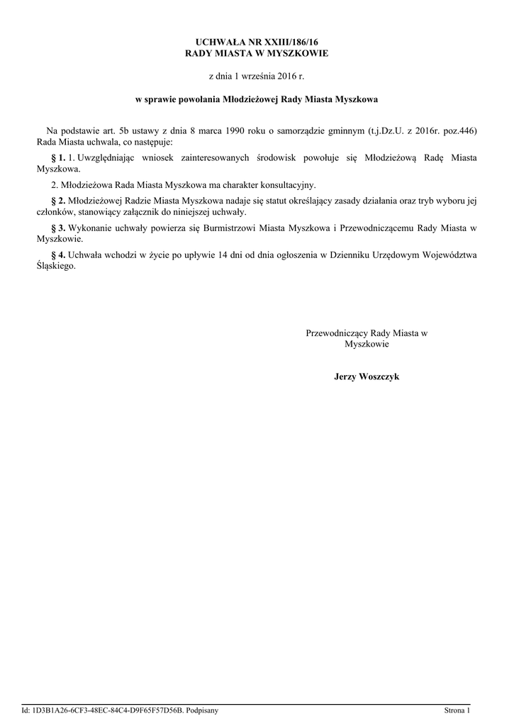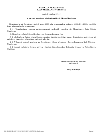UCHWAŁA NR XXIII/186/16 RADY MIASTA W MYSZKOWIE z dnia 1 września 2016 r. w sprawie powołania Młodzieżowej Rady Miasta Myszkowa Na podstawie art. 5b ustawy z dnia 8 marca 1990 roku o samorządzie gminnym (t.j.Dz.U. z 2016r. poz.446) Rada Miasta uchwala, co następuje: § 1. 1. Uwzględniając wniosek zainteresowanych środowisk powołuje się Młodzieżową Radę Miasta Myszkowa. 2. Młodzieżowa Rada Miasta Myszkowa ma charakter konsultacyjny. § 2. Młodzieżowej Radzie Miasta Myszkowa nadaje się statut określający zasady działania oraz tryb wyboru jej członków, stanowiący załącznik do niniejszej uchwały. § 3. Wykonanie uchwały powierza się Burmistrzowi Miasta Myszkowa i Przewodniczącemu Rady Miasta w Myszkowie. § 4. Uchwała wchodzi w życie po upływie 14 dni od dnia ogłoszenia w Dzienniku Urzędowym Województwa Śląskiego. Przewodniczący Rady Miasta w Myszkowie Jerzy Woszczyk Id: 1D3B1A26-6CF3-48EC-84C4-D9F65F57D56B. Podpisany Strona 1 Załącznik do Uchwały Nr XXIII/186/16 Rady Miasta w Myszkowie z dnia 1 września 2016 r. STATUT MŁODZIEŻOWEJ RADY MIASTA MYSZKOWA Rozdział 1. Postanowienia ogólne § 1. 1. Statut Młodzieżowej Rady Miasta Myszkowa, zwany dalej Statutem, określa zasady działania oraz tryb wyboru członków Młodzieżowej Rady Miasta Myszkowa. 2. Młodzieżowa Rada Miasta Myszkowa zwana dalej Młodzieżową Radą, jest reprezentacją młodzieży Miasta Myszkowa. 3. Młodzieżowa Rada wobec organów Miasta Myszkowa oraz innych instytucji w sprawach dotyczących młodzieży ma charakter wyłącznie konsultacyjny. 4. Podstawą działania Młodzieżowej Rady jest praca społeczna jej członków wybieranych zgodnie ze Statutem. § 2. Młodzieżowa Rada składa się z 10 członków w tym 5 przedstawicieli gimnazjów – po jednym przedstawicielu z każdej szkoły oraz 5 przedstawicieli szkół ponadgimnazjalnych - po 2 przedstawicieli z Liceum Ogólnokształcące im. mjr Henryka Sucharskiego i Zespołu Szkół Nr 1 im. Eugeniusza Kwiatkowskiego i 1 przedstawiciel z Zespołu Szkół Nr 2 im. Hugo Kołłątaja. § 3. 1. Siedzibą Młodzieżowej Rady jest Miasto Myszków. 2. Kadencja Młodzieżowej Rady rozpoczyna się od października i kończy wraz z końcem roku szkolnego. 3. Pierwsza kadencja Młodzieżowej Rady rozpoczyna się od listopada 2016 r. § 4. Rada Miasta Myszkowa powołuje spośród radnych koordynatora Młodzieżowej Rady, którego zadaniem jest pomoc merytoryczna członkom Młodzieżowej Rady w ich obowiązkach, związanych z bieżącą działalnością Młodzieżowej Rady. Rozdział 2. Zakres działania i zadania Młodzieżowej Rady § 5. Celem działania Młodzieżowej Rady demokratycznych i patriotycznych poprzez m.in.: jest kształtowanie postaw społecznych, obywatelskich, 1) upowszechnianie i rozwijanie idei samorządności oraz zasad działania samorządu terytorialnego wśród młodzieży; 2) inicjowanie i koordynowanie działań na rzecz młodych mieszkańców Miasta, w szczególności w zakresie nauki, kultury i sportu; 3) rozpoznawanie i reprezentowanie interesów młodzieży wobec instytucji publicznych i pozarządowych; 4) organizację aktywnego uczestnictwa młodzieży w życiu publicznym; 5) integrację i współpracę środowisk młodzieżowych na terenie Miasta; 6) nawiązywanie współpracy z młodzieżowymi radami innych gmin. § 6. Młodzieżowa Rada realizuje swoje cele poprzez: 1) przygotowywanie i przeprowadzanie posiedzeń Młodzieżowej Rady; 2) reprezentowanie swoich wyborców wobec organów samorządowych Miasta; 3) współpracę z organizacjami samorządowymi Miasta; 4) współpracę z samorządami uczniowskimi poszczególnych szkół; Id: 1D3B1A26-6CF3-48EC-84C4-D9F65F57D56B. Podpisany Strona 1 5) organizowanie spotkań z przedstawicielami samorządu lokalnego, organizacji społecznych, kulturalnych, sportowych i politycznych. § 7. Do zadań Młodzieżowej Rady należy: 1) przedstawianie opinii w sprawach dotyczących młodzieży wobec władz samorządowych Miasta Myszkowa (w formie uchwał lub stanowisk); 2) wybór oraz odwołanie przewodniczącego, wiceprzewodniczacych i sekretarza Młodzieżowej Rady; 3) proponowanie zmian w Statucie. Rozdział 3. Członkowie Młodzieżowej Rady § 8. Członkowie Młodzieżowej Rady mają prawo: 1) uczestniczyć z głosem stanowiącym w posiedzeniach Młodzieżowej Rady; 2) brać udział we wszystkich przedsięwzięciach młodzieżowej Rady; 3) zgłaszania wniosków i postulatów związanych z celami i działalnością Młodzieżowej Rady; 4) proponowania tematów i spraw do dyskusji zwłaszcza tych, które wynikają z postulatów młodzieży; 5) zgłaszania władzom Miasta za pośrednictwem Przewodniczącego Młodzieżowej Rady pytań i pomysłów dotyczących funkcjonowania lokalnego samorządu. § 9. Członkowie Młodzieżowej Rady mają obowiązek: 1) przestrzegać Statutu i uchwał podjętych przez Młodzieżową Radę; 2) uczestniczyć w realizacji celów Młodzieżowej Rady; 3) brać czynny udział w posiedzeniach Młodzieżowej Rady; 4) informować swoich wyborców o działalności Młodzieżowej Rady Miasta; 5) przedstawiać wnioski swoich wyborców na posiedzeniach Młodzieżowej Rady. § 10. 1. Wygaśnięcie mandatu członka Młodzieżowej Rady następuje wskutek: 1) rezygnacji z mandatu; 2) skreślenia z listy uczniów. 2. W przypadku wygaśnięcia mandatu członkiem Młodzieżowej Rady zostaje kandydat z kolejno największą liczbą głosów. Rozdział 4. Organizacja Młodzieżowej Rady § 11. 1. Na pierwszym posiedzeniu Młodzieżowa Rada wybiera ze swojego grona przewodniczącego, od jednego do trzech wiceprzewodniczących i sekretarza Młodzieżowej Rady zwykłą większością głosów, w obecności co najmniej połowy jej składu w głosowaniu tajnym. 2. Odwołanie przewodniczącego, wiceprzewodniczących i sekretarza Młodzieżowej Rady następuje w trybie określonym w ust. 1 na wniosek co najmniej 5 członków Młodzieżowej Rady złożony ni