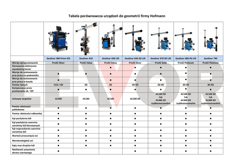 Tabela porównawcza urządzeń do geometrii firmy Hofmann Wersja oprogramowania Sterowanie elektryczne wysokością kamer Wersje do zastosowania przy pracy na podnośniku Wersje do zastosowania przy pracy w kanale Pomiar danych Kompensacja przez przetaczanie ok. ±20o Geoliner 580 Prism Elit Geoliner 610 Geoliner 650 Lift Geoliner 650 XD Lift Geoliner 670 XD Lift Geoliner 680 XD Lift Geoliner 790 Pro42 Silver Pro32 Value Pro32 Value Pro42 Silver Pro42 Gold Pro42 Platinum Pro42 Platinum • • • • • • • • • • • • • • • • • • CCD / 3D 3D 3D 3D XD 3D XD 3D XD 3D XD • • • • • • • AC100 XD lub AC400 XD szybkomocowalne AC100 XD lub AC400 XD szybkomocowalne Uchwyty targetów AC200 AC100 AC100 AC100 XD AC100 XD lub AC400 XD szybkomocowalne Pomiar zbieżności połówkowe • • • • • • • • • • • • • • • • • • • • • • • • • • • • • • • • • • • • • • • • • • • • • • • • • • • • • • • • • • • • • Pomiar zbieżności całkowitej Kąt pochylenia kół Kąt pochylenia sworznia zwrotnicy kół kierowanych Kąt wyprzedzenia sworznia zwrotnicy kół Wartość przesunięcia osi Nierównoległość osi Kąty max skrętów kół Możliwość ustawienia ekranu startowego Geoliner 580 Prism Elit Możliwość ustawiania własnych procedur (kreatorów) pomiarowych Logowanie użytkownika – zabezpieczenie hasłem Możliwość drukowania własnych raportów i formularzy inspekcji Funkcja diagnozowania „narzekań kierowcy” Diagnozowanie zachowania dynamicznego pojazdu Procedura szybkiego pomiaru i regulacji Pomiar pochylenia koła przy zerowej zbieżności (wymóg Mercedesa) EZ-Toe – możliwość regulacji zbieżności przy skręconych kołach Pomiar podstawowych wymiarów zawieszenia Pomiar krzywej zbieżności (wymóg VW i Audi) Automatyczny pomiar wysokości zawieszenia Programy regulacyjne dla różnych typów zawieszeń Procedury pomiarowe OEM (zgodne z wymaganiami danego producenta) Współpraca z inklinometrem Romes Zaawansowany pomiar wymiarów zawieszenia (w tym przekątnych) Geoliner 610 Geoliner 650 Lift Geoliner 650 XD Lift Geoliner 670 XD Lift Geoliner 680 XD Lift Geoliner 790 • • • • • • • • • • • • • • • • • • • • • • • • • • • • • • • • • • • • • • • • • • • • • • • • • • • • • • • • • • • • • • • • • • • • • • • • • • Geoliner 580 Prism Elit Pomiar promieni tocznych kół (w tym pomiar różnic w prędkościach obrotowych – praca mechanizmów różnicowych) Możliwość pomiarów i regulacji przy zdjętych kołach Możliwość importowania i eksportowania baz danych użytkownika Funkcja zarządzania serwisem VSA (Vehicle Sensitive Alignmen) – pomiar ważnych parametrów z pominięciem niewymagalnych Pomiar i diagnostyka niesymetryczności układu kierowniczego Zaawansowany pomiar wysokości zawieszenia Pro Ackerman – zaawansowana diagnostyka układu kierowniczego Graficzna prezentacja wyprzedzenia i pochylenia osi zwrotnicy oraz promienia zataczania Automatyczne śledzenie wysokości (położenia) tarcz pasywnych samochodu Komunikacja Bluetooth Geoliner 610 Geoliner 650 Lift Geoliner 650 XD Lift Geoliner 670 XD Lift Geoliner 680 XD Lift Geoliner 790 • • • • • • • • • • • • • • • • • • • • • • •