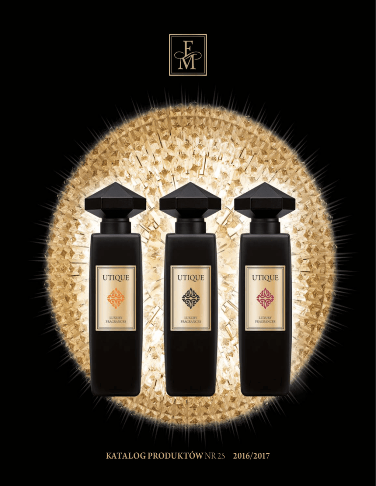 KATALOG PRODUKTÓW NR 25 2016/2017 SPIS TREŚCI UTIQUE R ADOŚĆ TWORZENIA Przekrocz próg magicznego świata produktów FM WORLD. Przekładając strony ekskluzywnego katalogu, odbędziesz niezapomnianą podróż po świecie wspaniałych zapachów, intensywnych barw, niezwykłych możliwości. Współpraca naukowców i technologów oraz czerpanie z natury tego, co najcenniejsze, pozwoliły nam stworzyć produkty niezwykłe. Wspięliśmy się na wyżyny możliwości współczesnej nauki, a następnie dodaliśmy szczyptę magii. Po to, abyś wybierając naszą ofertę był pewien, że sięgasz po najwyższą jakość! Czas publikacji katalogu, który trzymasz w dłoniach, to przede wszystkim czas wielkich premier. Odsłaniamy przed Tobą aż trzy nowe, fantastyczne marki – wyjątkowe perfumy i olejki UTIQUE, linię unikalnych produktów FONTAINAVIE oraz innowacyjne systemy suplementacji NUTRICODE. W stworzenie każdej z nich włożyliśmy serce i ogrom pracy – starannie dobieraliśmy najlepsze składniki i z pasją projektowaliśmy opakowania. A wszystko po to, byś mógł cieszyć się życiem razem z nami. Gdy patrzę w przyszłość, widzę, że należy ona do FM WORLD! Bez Ciebie nie byłoby to możliwe. Dziękuję! str. 4-11 Naturalne olejki Ekskluzywne perfumy str. 8-9 str. 10-11 FONTAINAVIE str. 12-15 Liftingujące serum pod oczy str. 14-15 NUTRICODE str. 16-27 Inner Balance str. 20-21 Slim Extreme str.22-23 Vitality Boost str. 24-25 Immuno str. 26 Hair Skin Nails str. 27 PERFUMY FEDERICO MAHORA str. 28-61 KOSMETYKI PIELĘGNACYJNE FEDERICO MAHORA str. 62-83 Uniwersalny krem pielęgnacyjny str. 64-65 MAKE UP str. 84-113 Artur Trawiński FM WORLD AURILE str. 114-123 FOR HOME str. 124-145 Spis zapachów str. 146 Zestawienie według rodzin zapachowych str. 147 W YJĄTKOWE DOZNANIA Najcenniejsze oleje, wyszukane receptury, bogate kompozycje – wejdź z nami w świat luksusu! Z marzenia o doskonałości i idealnej harmonii ciała z duchem stworzyliśmy unikalną markę: UTIQUE. Zapachy skomponowane, by oddać piękno, harmonię i energię życia. Oleje pielęgnacyjne stworzone, by dodać tajemniczości i zmysłowych doznań codziennym chwilom. UTIQUE UTIQUE to nowa jakość w świecie luksusowych perfum i kosmetyków, zapewniająca bukiet szczególnych, zmysłowych doznań. Skomponowana, by oddać piękno, harmonię i energię życia. Stworzona, aby wpływać na naszą egzystencję, dodając odrobiny luksusu codziennym chwilom. Życie znów staje się pełne pasji. UTIQUE to doskonałość, droga, którą wybiorą osoby pragnące uciec do świata pełnego klasy i wyrafinowania. Wejdź do eleganckiego atelier i spotkaj alchemika, który tworzy najcenniejsze kompozycje eliksirów: trzy mistyczne zapachy i dwa naturalne oleje. Naturalne Oleje Oleje UTIQUE są płynnym złotem, skarbem, który zmienia codzienną pielęgnację w nieopisaną przyjemność. Dzięki zastosowaniu techniki blendowania, zmieszaliśmy ze sobą kilkanaście drogocennych olejów tak, aby ich działanie wzajemnie się uzupełniało, zapewniając skórze odżywienie, nawilżenie i regenerację. Sekretem ich siły jest naturalne pochodzenie. Oleje do twarzy i włosów UTIQUE nie zawierają konserwantów, są bogate w cenne witaminy, a organiczne certyfikaty potwierdzają najwyższej jakości pochodzenie wybranych składników. Tradycja i Nowoczesność Już w starożytności perfumy były wytwarzane na bazie naturalnych surowców i miały najczęściej formę olejków i balsamów. Początkowo do tych ekskluzywnych produktów mieli dostęp jedynie władcy oraz najmożniejsi obywatele. Perfumy UTIQUE sięgają do podstaw klasycznego perfumiarstwa, w którym z uczuciem i znawstwem łączone są doskonale wyselekcjonowane naturalne olejki i nuty natury w niespotykaną dotąd jakość. Tworzone według tajnych receptur, na bazie drogocennych składników, są swoistymi arcydziełami. Wspaniałością niespotykanych, tajemniczych i egzotycznych zapachów. Zapach to Sztuka Luksus, elegancja, bogactwo najwyższej jakości składników – perfumy UTIQUE powstały z marzenia o doskonałości i idealnej harmonii ciała z duchem. Po to, by zaoferować Ci jakość, jaką do tej pory można było spotkać odwiedzając małe, bardzo ekskluzywne butiki w kameralnych dzielnicach światowych stolic mody. Czerpiące z wiedzy światowej klasy senselierów, perfumy UTIQUE to linia niszowych zapachów na bazie najwyższej jakości składników – eliksirów o wysokiej koncentracji olejków eterycznych. To ideał, stworzony dla tych, którzy pragną oderwać się od codzienności i podążyć w kierunku najbardziej wyrafinowanych doznań. 6 | UTIQUE UTIQUE | 7 UTIQUE Wykorzystujemy to, co najwspanialsze w naturalnych olejkach: ich cudowny zapach w naszych orientalno-drzewnych perfumach, a pielęgnujące właściwości w kosmetykach do pielęgnacji twarzy i włosów. Poznaj ich moc! Zakochaj się w naturalnym bogactwie drogocennych składników Naturalna siła dla Twoich włosów • Olej jojoba stymuluje wzrost włosów. • Olejek neroli zapobiega pękaniu drobnych naczyń krwionośnych. • Olej lniany eliminuje problem ich wypadania. • Olej arganowy działa przeciwzmarszczkowo i odmładzająco. • Olej z pestek moreli odżywia suche i zniszczone włosy. • Olej z róży rdzawej redukuje istniejące zmarszczki i hamuje powstawanie nowych. • Olej arganowy odbudowuje włosy, dodaje im blasku, ujarzmia, a także poprawia ich kondycję, zapobiegając rozdwajaniu się końcówek. • Olej z czarnuszki wspomaga likwidowanie zaskórników i niedoskonałości. • Olej jojoba zamyka pory, doskonale nawilża skórę i poprawia jej jędrność. • Olejek ylang-ylang ma właściwości tonizujące. • Olej słonecznikowy zwiększa elastyczność skóry, spowalniając procesy starzenia. • Olej sojowy odbudowuje naturalną barierę ochronną skóry, poprawiając jej nawilżenie. • Olej rycynowy to silny przeciwutleniacz, działający jak
