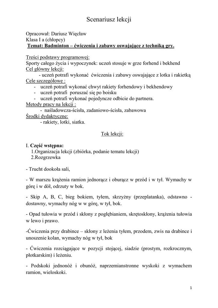 Scenariusz lekcji Opracował: Dariusz Więcław Klasa I a (chłopcy) Temat: Badminton – ćwiczenia i zabawy oswajające z techniką gry. Treści podstawy programowej: Sporty całego życia i wypoczynek: uczeń stosuje w grze forhend i bekhend Cel główny lekcji: - uczeń potrafi wykonać ćwiczenia i zabawy oswajające z lotka i rakietką Cele szczegółowe : - uczeń potrafi wykonać chwyt rakiety forhendowy i bekhendowy - uczeń potrafi poruszać się po boisku - uczeń potrafi wykonać pojedyncze odbicie do partnera. Metody pracy na lekcji : - naśladowcza-ścisła, zadaniowo-ścisła, zabawowa Środki dydaktyczne: - rakiety, lotki, siatka. Tok lekcji: I. Część wstępna: 1.Organizacja lekcji (zbiórka, podanie tematu lekcji) 2.Rozgrzewka - Trucht dookoła sali, - W marszu krążenia ramion jednorącz i oburącz w przód i w tył. Wymachy w górę i w dół, odrzuty w bok. - Skip A, B, C, bieg bokiem, tyłem, skrzyżny (przeplatanka), odstawno dostawny, wymachy nóg w w górę, w tył, bok. - Opad tułowia w przód i skłony z pogłębianiem, skrętoskłony, krążenia tułowia w lewo i prawo. -Ćwiczenia przy drabince – skłony z leżenia tyłem, przodem, zwis na drabince i unoszenie kolan, wymachy nóg w tył, bok - Ćwiczenia rozciągające w pozycji stojącej, siadzie (prostym, rozkrocznym, płotkarskim) i leżeniu. - Podskoki jednonóż i obunóż, naprzemianstronne wyskoki z wymachem ramion, wieloskoki. 1 II. Część główna: Zestaw ćwiczeń oswajających z rakietą i lotką 1. Pokaz i omówienie techniki chwytu rakiety forhendem i bekhendem. 2. Ćwiczenia oswajające z rakietką i lotką pojedynczo i w parach. 3. Gry i zabawy ruchowe kształtujące umiejętność gry w badmintona. 1. Ćwiczenia oswajające z rakietą. 1. Trzymając trzonek rakiety w dłoni, palcami wprowadzanie jej w rotację wzdłuż osi długiej. 2. Trzymając rączkę rakiety w dłoni, palcami nadawanie jej obrotów w płaszczyźnie czołowej. 3. Przenoszenie rakiety ustawionej pionowo na palcu. 4. Przenoszenie rakiety ułożonej poziomo na palcu wskazującym. 5. Podrzucanie rakiety i chwytanie drugą ręką. 6. Podrzucanie rakiety w górę w przód i chwytanie drugą ręką. 7. Chwyt rakiety (trzymanej przed sobą) po obrocie tułowia o 360 stopni. 8. Przekładanie rakiety z ręki do ręki pod ugiętą nogą, za plecami. 2. Ćwiczenia oswajające z rakietą i lotką. 1. Stojąc w szerokim rozkroku prowadzenie lotki po parkiecie, zataczając "ósemki" między nogami. 2. Przekładanie rakiety z ułożoną na naciągu lotką z ręki do ręki pod ugiętą nogą, za plecami. 3. Lekkim podrzutem przekładanie lotki z jednej strony rakiety na drugą. 4. Podbijanie lotki przed sobą na przemian jedną i drugą stroną naciągu. 5. Podbijanie lotki przed sobą rakietą trzymaną naprzemian w obu rękach. 6. Podbijanie lotki przed sobą po obrocie o 360 stopni. 7. Podbijanie lotki przed sobą po dotknięciu parkietu druga dłonią. 8. Podnoszenie lotki z parkietu za pomocą rakiety. 9. Wyrzut w górę lotki ułożonej na naciągu i chwyt lotki na rakietę poprzez zamortyzowanie uderzenia spadającej lotki o naciąg. 3. Ćwiczenia w parach 1. Za pomocą rakiety rzut do partnera lotki leżącej na parkiecie. 2. Rzut lotki w kierunku partnera. Współćwiczący stara się trzymaną w ręku rakietą obronić strzał. 3. Podbijanie lotki wysoko w górę, rakietą przekazaną przez partnera. 4. Podbijanie lotki w górę, rakietą położoną przez partnera na parkiecie. 5. Odbijanie lotki do siebie przez partnerów stojących na ławeczce gimnastycznej. 6. Odbijanie przez partnerów dwóch lotek na przemian do siebie. 2 III. Gry i zabawy ruchowe 1. Uczniowie biegają po sali w luźnej gromadce. Na parkiecie rozłożone są rakiety – o jedną mniej niż ilość uczestników zabawy. Na sygnał każdy z uczniów chwyta najbliżej leżącą rakietę. Ten, kto nie zdołał w ten sposób zdobyć rakiety, odpada z zabawy. Zmniejszając ilość rakiet, zabawę kontynuuje się dalej, aż na placu gry pozostaną dwie osoby. 2. Cztery zastępy stoją w rzędach na obwodzie koła. Pierwsza osoba w każdym zastępie trzyma rakietę z lotką ułożoną na naciągu. Na sygnał, w każdym zastępie pierwsza osoba podaje drugiej, druga trzeciej itd. rakietę z leżącą na niej lotką w taki sposób, aby nie upuścić lotki. Wygrywa ten zespół, którego rakieta najszybciej obiegnie po obwodzie i ponownie znajdzie się w rękach osoby rozpoczynającej zabawę. 3. Zabawa jak wyżej, ale rakieta wędruje w rzędzie pod nogami uczestników stojących w rozkroku, a powraca nad głowami stojących w rzędzie. 4. Dzieci ustawione na obwodzie koła kładą na parkiecie przed sobą rakietę, drugą rakietę trzymają w dłoni. Dwie wyznaczone osoby, posiadające lotki, biegają wewnątrz koła i starają się lotką trafić w naciąg dowolnej, leżącej rakiety. Każdy z pozostałych uczestników broni dostępu do swojej rakiety - używając rakiety trzymanej w dłoni. Jeżeli udało się trafić lotką w leżącą rakietę, to jej właściciel powiększa grono biegających z lotkami. Wygrywa ten uczestnik, który najdłużej potrafi obronić swoją rakietę. 5. Kilkuosobowe zastępy stoją w rzędach. W odległości 5-6 m. od linii startu, naprzeciw każdego rzędu leży rakieta. Na sygnał pierwsza osoba z każdego rzędu, skacząc na jednej nodze przesuwa przed sobą lotkę, trącając ją stopą. Po obiegnięciu rakiety wraca na linię startu skacząc na drugiej nodze. Mijając linię, uprawnia następnego gracza do startu. Wygrywa zastęp, którego zawodnicy szybciej wykonają zadanie. 6. Kilkuosobowe drużyny stają w rzędach na linii. Chwytając lotkę między stopy, jeden z bawiących się wykonuje skok w przód obunóż i stara się wyrzucić lotkę możliwie najdalej. Z miejsca upadku lotki druga osoba wykonuje to samo zadanie w przeciwnym kierunku. Zwycięża ten zespół, który szybciej wyrzuci lotkę za przeciwległą l