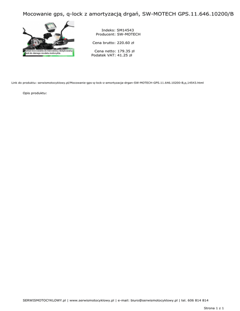 Mocowanie gps, q-lock z amortyzacją drgań, SW-MOTECH GPS.11.646.10200/B Indeks: SM14543 Producent: SW-MOTECH Cena brutto: 220.60 zł Cena netto: 179.35 zł Podatek VAT: 41.25 zł Link do produktu: serwismotocyklowy.pl/Mocowanie-gps-q-lock-z-amortyzacja-drgan-SW-MOTECH-GPS.11.646.10200-B,p,14543.html Opis produktu: SERWISMOTOCYKLOWY.pl | www.serwismotocyklowy.pl | e-mail: [email protected] | tel. 606 814 814 Strona 1 z 1