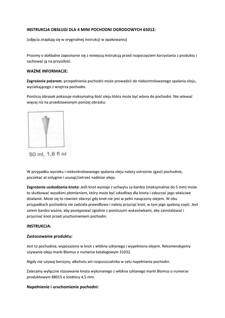 INSTRUKCJA OBSŁUGI DLA 4 MINI POCHODNI OGRODOWYCH 65012: (zdjęcia znajdują się w oryginalnej instrukcji w opakowaniu) Prosimy o dokładne zapoznanie się z niniejszą instrukcją przed rozpoczęciem korzystania z produktu i zachowad ją na przyszłośd. WAŻNE INFORMACJE: Zagrożenie pożarem: przepełnienia pochodni może prowadzid do niekontrolowanego spalania oleju, wyciekającego z wnętrza pochodni. Poniższy obrazek pokazuje maksymalną ilośd oleju która może byd wlana do pochodni. Nie wlewad więcej niż na przedstawionym poniżej obrazku: W przypadku wycieku i niekontrolowanego spalania oleju należy ostrożnie zgasid pochodnie, poczekad aż ostygnie i usunąd/zetrzed nadmiar oleju. Zagrożenie uszkodzenia knota: Jeśli knot wystaje z uchwytu za bardzo (maksymalnie do 5 mm) może to skutkowad wysokimi płomieniem, który może byd szkodliwy dla knota i zaburzad jego właściwe działanie. Może się to również zdarzyd gdy knot nie jest w pełni nasączony olejem. W obu przypadkach pochodnia nie zadziała prawidłowo i należy przyciąd knot, w tym jego spaloną częśd. Jest zatem bardzo ważne, aby postępowad zgodnie z poniższymi wskazówkami, aby zainstalowad i przycinad knot przed uruchomieniem pochodni. INSTRUKCJA: Zastosowanie produktu: Jest to pochodnia, wyposażona w knot z włókna szklanego i wypełniona olejem. Rekomendujemy używanie oleju marki Blomus o numerze katalogowym 31032. Nigdy nie używaj benzyny, alkoholu ani rozpuszczalnika w celu napełnienia pochodni. Zalecamy wyłączne stosowanie knota wykonanego z włókna szklanego marki Blomus o numerze produktowym 88015 o średnicy 4,5 mm. Napełnienie i uruchomienie pochodni: Prosimy usunąd wszystkie elementy opakowania przed użyciem produktu. W przypadku, gdy górny koniec knota jest zabezpieczony taśmą z tworzywa sztucznego, należy dokładnie ją usunąd. Taśma owinięta wokół dolnej części nie może byd usunięta. W zakupionej pochodni knot jest już umieszczony wewnątrz uchwytu na knot. Knot musi byd przycięty tak aby nie wystawał z uchwytu na więcej niż 5 mm ( jak na obrazku obok). W celu napełnienia pochodni olejem usuo uchwyt na knot. Pochodnia posiada zabezpieczenie zamknięcia i zabezpieczenie dla knota. Naciśnij delikatnie zabezpieczenie uchwytu knota, jednocześnie skręcając go w kierunku przeciwnym do ruchu wskazówek zegara. Zabezpieczenie zablokuje uchwyt knota. Proszę odkręcid uchwyt w kierunku przeciwnym do ruchu wskazówek zegara (obrazek poniżej). Napełnid pochodnię przez otwór za pomocą lejka (jak na obrazku poniżej). W przypadku rozlania oleju na zewnętrzną częśd pochodni, należy je całkowicie usunąd przed podpaleniem knota. W celu zamknięcia pochodni należy dopasowad uchwyt na knot wraz z knotem z powrotem do otworu. Wkręcisz go, naciskając w dół i skręcając w kierunku ruchu wskazówek zegara, aż do zabezpieczenia zamknięcia. Następnie dokręd poprzez skręcenie w kierunku ruchu wskazówek zegara (jak na obrazku poniżej). Regulacja knota: Proszę sprawdzid ustawienie konta przed użyciem pochodni. Knot nie może wystawad z uchwytu więcej niż 5 mm (jak na obrazku obok). Gdy zajdzie taka koniecznośd należy ustawid knot ręcznie. Zapalanie pochodni: Po napełnieniu pochodni należy odczekad co najmniej 5 minut, aż knot nasączy się olejem. Jeżeli po upływie tego czasu olej nie jest widoczny na górze knota, należy odczekad jeszcze 5 minut, aż olej będzie widoczny. Gaszenie pochodni: Nigdy nie zdmuchuj płomienia, zawsze używaj gaśnicy. UWAGA: dmuchanie w płomieo może spowodowad niekontrolowany ruch płomienia. Ważne zasady dotyczące bezpieczeostwa: UWAGA: Zawsze trzymaj olej do lampy poza zasięgiem dzieci. Jeden łyk oleju – nawet ssanie knota – może spowodowad ciężkie obrażenia płuc. UWAGA: W razie połknięcia nie wywoływad wymiotów! Należy niezwłocznie zasięgnąd porady lekarza i pokazad oryginalną instrukcję lub etykietę z pojemnika na olej. UWAGA: Zawsze trzymaj tę pochodnię poza zasięgiem dzieci, kiedy pochodnia jest używana bądź przechowywana. UWAGA: Nigdy nie zostawiaj płonącej pochodni bez nadzoru. UWAGA: Pochodnia jest bardzo gorąca kiedy płonie. Nigdy nie dotykaj płonącej pochodni. Produktu należy używad tylko na zewnątrz, nigdy w budynku. Należy przenosid i przechowywad pochodnie tylko kiedy jest zimna i nie zawiera oleju.