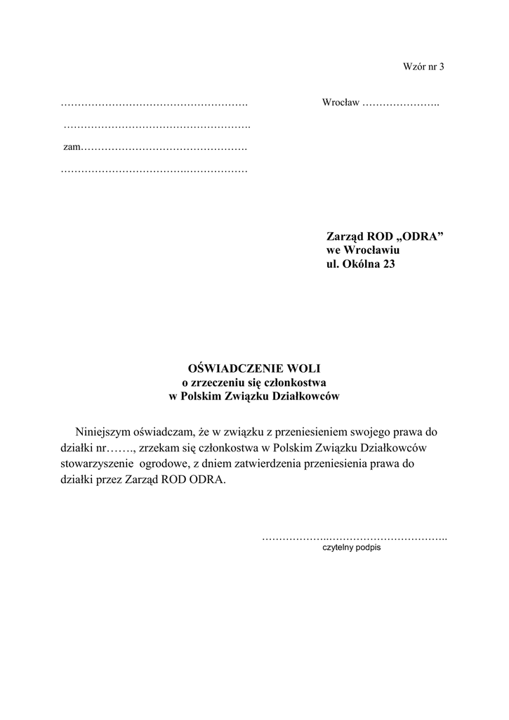 Wzór nr 3 ………………………………………………. Wrocław ………………….. ………………………………………………. zam…………………………………………. ……………………………….……………… Zarząd ROD „ODRA” we Wrocławiu ul. Okólna 23 OŚWIADCZENIE WOLI o zrzeczeniu się członkostwa w Polskim Związku Działkowców Niniejszym oświadczam, że w związku z przeniesieniem swojego prawa do działki nr……., zrzekam się członkostwa w Polskim Związku Działkowców stowarzyszenie ogrodowe, z dniem zatwierdzenia przeniesienia prawa do działki przez Zarząd ROD ODRA. ………………..…………………………….. czytelny podpis