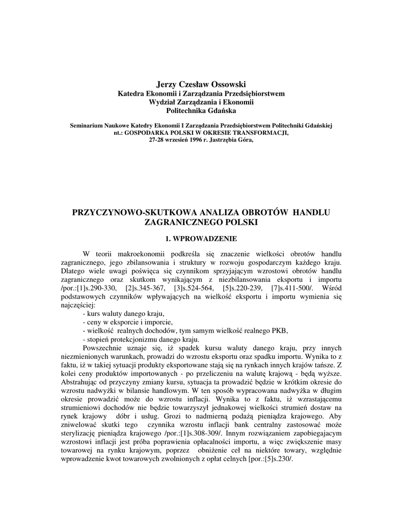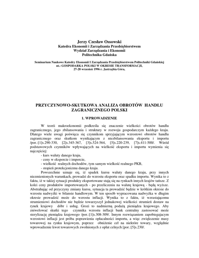 Jerzy Czesław Ossowski Katedra Ekonomii i Zarz dzania Przedsi biorstwem Wydział Zarz dzania i Ekonomii Politechnika Gda ska Seminarium Naukowe Katedry Ekonomii I Zarz dzania Przedsi biorstwem Politechniki Gda skiej nt.: GOSPODARKA POLSKI W OKRESIE TRANSFORMACJI, 27-28 wrzesie 1996 r. Jastrz bia Góra, PRZYCZYNOWO-SKUTKOWA ANALIZA OBROTÓW HANDLU ZAGRANICZNEGO POLSKI 1. WPROWADZENIE W teorii makroekonomii podkre la si znaczenie wielko ci obrotów handlu zagranicznego, jego zbilansowania i struktury w rozwoju gospodarczym ka dego kraju. Dlatego wiele uwagi po wi ca si czynnikom sprzyjaj cym wzrostowi obrotów handlu zagranicznego oraz skutkom wynikaj cym z niezbilansowania eksportu i importu /por.:[1]s.290-330, [2]s.345-367, [3]s.524-564, [5]s.220-239, [7]s.411-500/. W ród podstawowych czynników wpływaj cych na wielko eksportu i importu wymienia si najcz ciej: - kurs waluty danego kraju, - ceny w eksporcie i imporcie, - wielko realnych dochodów, tym samym wielko realnego PKB, - stopie protekcjonizmu danego kraju. Powszechnie uznaje si , i spadek kursu waluty danego kraju, przy innych niezmienionych warunkach, prowadzi do wzrostu eksportu oraz spadku importu. Wynika to z faktu, i w takiej sytuacji produkty eksportowane staj si na rynkach innych krajów ta sze. Z kolei ceny produktów importowanych - po przeliczeniu na walut krajow - b d wy sze. Abstrahuj c od przyczyny zmiany kursu, sytuacja ta prowadzi b dzie w krótkim okresie do wzrostu nadwy ki w bilansie handlowym. W ten sposób wypracowana nadwy ka w długim okresie prowadzi mo e do wzrostu inflacji. Wynika to z faktu, i wzrastaj cemu strumieniowi dochodów nie b dzie towarzyszył jednakowej wielko ci strumie dostaw na rynek krajowy dóbr i usług. Grozi to nadmiern poda pieni dza krajowego. Aby zniwelowa skutki tego czynnika wzrostu inflacji bank centralny zastosowa mo e sterylizacj pieni dza krajowego /por.:[1]s.308-309/. Innym rozwi zaniem zapobiegajacym wzrostowi inflacji jest próba poprawienia opłacalno ci importu, a wi c zwi kszenie masy towarowej na rynku krajowym, poprzez obni enie ceł na niektóre towary, wzgl dnie wprowadzenie kwot towarowych zwolnionych z opłat celnych [por.:[5]s.230/. W sytuacji wzrostu kursu waluty krajowej obserwowa b dziemy tendencj spadkow eksportu oraz wzrostow importu. W praktyce prowadzi to do ujemnego salda handlowego a tym samym płatniczego. Faktycznie oznacza to wzrost konkurencyjno ci towarów importowanych na rynku krajowym. Odpowiedzi na to mo e by próba ochrony producentów krajowych - wynikaj ca z ich nacisku na rz d - poprzez wzrost ceł na wybrane towary wzgl dnie ustalenie kontyngentów kwot wybranych towarów lub wr cz wprowadzenia embarga na ich import /por.:[2]s.362, [7]s.420]. Gł bsza analiza skutków tak rozumianej polityki protekcjonistycznej wskazuje, i eliminuje ona efektywno wynikajac ze specjalizacji i mi dzynarodowego podziału pracy. Ponadto prowadzi do wzrostu kursu waluty krajowej a tym samym niweluje du cz zakładanego efektu protekcji. Ponadto polityka protekcjonistyczna wywoła mo e zastosowanie przez partnerów handlowych rodków odwetowych /por.:[2]s.364-365, [7]s.420, 450-463]. Ogólnie jednak mo emy mówi , e polityka protekcjonistyczna pa stwa w swych zało eniach prowadzi ma do poprawy stosunku kosztów eksportu do kosztów importu. Powstaje pytanie, czy w sztuczny sposób polegaj cy na tej formie ingerencji pa stwa jest si w stanie osi gn efekty, które osi ga si przy rynkowej poprawie terms of trade?. Wpływ zmiany cen towarów i usług w eksporcie i imporcie na saldo bilansu płatniczego tylko z pozoru wygl da podobnie do wpływu zmiany kursu waluty krajowej. Zauwa my bowiem, e wzrost cen na rynku wiatowym (faktycznie na rynku importera) towarów i usług eksportowanych przez dany kraj prowadzi do wzrostu realnej warto ci eksportu wywołuj c jednocze nie wzrost poda y kraju eksportujacego. Zwi ksza to dochody podmiotów gospodarczych a po rednio dochody ludno ci. Przy zało eniu stałosci innych czynników - w tym cen towarów importowanych - obserwowa b dziemy: a) popraw bilansu handlowego, b) zwi kszony popyt globalny. Obecnie jednak popyt mo e zosta zrównowa ony poda produktów w warunkach nieinflacyjnych. Wynika to mi dzy innymi z faktu poprawy terms of trade, a wi c stosunku kosztów eksportu do importu. Obecnie bowiem za tak sam kwot towarów eksportowanych zakupi mo na wi ksz kwot towarów importowanych. Powstała w ten sposób nadwy ka bilansowa w postaci rezerw dewizowych - wymienionych na walut krajow trafiaj c w r ce ludno ci - znajduje swoje pokrycie w towarze na rynku. W tym kontek cie zauwa my, e wzrost produktu krajowego - a wi c dochodów ludno ci - wynikaj cy z poprawy produktywno ci czynników produkcji wywoła skutki podobne do skutków spowodowanych popraw terms of trade. Wzrost dochodów, poparty wzrostem efektywno ci gospodarowania, umo liwia wzrost eksportu po ni szych cenach przy jednocze nie ni szych kosztach wytwarzania. Zapewnia to nadwy k umo liwiaj c wzbogacenie oferty towarów importowanych bez naruszenia bilansu handlowego. W tym mi dzy innymi sensie mamy prawo mówi , i wzrost dochodów realnych prowadzi do zwi kszonej skłonno ci konsumpcji towarów importowanych. 2. WST PNE ZAŁO ENIA BADAWCZE Powy sze rozwa ania stanowiły punkt wyj cia przy formułowaniu hipotez roboczych dotycz cych relacji przyczynowo-skutkowych. Wst pnie zało ono, e czynniki kształtujace obroty handlu zagranicznego z niejednakow moc wpływaj na eksport i import. Skłaniało to do rozpatrywania oddzielnie relacji dotycz cych eksportu oraz importu. Przyst puj c do analizy przyczynowo-skutkowej dotycz cej globalnego eksportu i importu towarów nale ało wzi pod uwag nast puj ce wła ciwo ci materiału statystycznego: 1) eksport i import towarów mierzony był w USD, 2) dane statystyczne miesi czne obejmowały lata 1993 -1996. Pierwszy z faktów skłaniał do posługiwania si głównie kursem USD. Drugi z faktów wskazuje na mo liwo wyst powania 