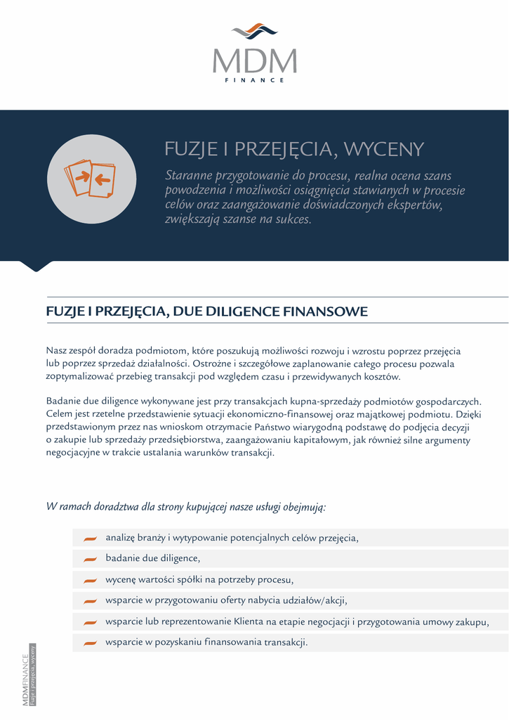 FUZJE I PRZEJĘCIA, WYCENY Staranne przygotowanie do procesu, realna ocena szans powodzenia i możliwości osiągnięcia stawianych w procesie celów oraz zaangażowanie doświadczonych ekspertów, zwiększają szanse na sukces. FUZJE I PRZEJĘCIA, DUE DILIGENCE FINANSOWE Nasz zespół doradza podmiotom, które poszukują możliwości rozwoju i wzrostu poprzez przejęcia lub poprzez sprzedaż działalności. Ostrożne i szczegółowe zaplanowanie całego procesu pozwala zoptymalizować przebieg transakcji pod względem czasu i przewidywanych kosztów. Badanie due diligence wykonywane jest przy transakcjach kupna-sprzedaży podmiotów gospodarczych. Celem jest rzetelne przedstawienie sytuacji ekonomiczno-finansowej oraz majątkowej podmiotu. Dzięki przedstawionym przez nas wnioskom otrzymacie Państwo wiarygodną podstawę do podjęcia decyzji o zakupie lub sprzedaży przedsiębiorstwa, zaangażowaniu kapitałowym, jak również silne argumenty negocjacyjne w trakcie ustalania warunków transakcji. W ramach doradztwa dla strony kupującej nasze usługi obejmują: analizę branży i wytypowanie potencjalnych celów przejęcia, badanie due diligence, wycenę wartości spółki na potrzeby procesu, wsparcie w przygotowaniu oferty nabycia udziałów/akcji, MDMFINANCE Fuzje i przejęcia, wyceny wsparcie lub reprezentowanie Klienta na etapie negocjacji i przygotowania umowy zakupu, wsparcie w pozyskaniu finansowania transakcji. W przypadku doradztwa stronie sprzedającej oferujemy: poszukiwanie inwestora, badanie due diligence („vendor due diligence”), przygotowanie memorandum informacyjnego, sporządzenie wyceny, koordynację badania spółki przez potencjalnych nabywców, a także opcję pozyskania refinansowania inwestycji dla nabywcy. Przy łączeniu lub podziale oferujemy następujące czynności: przygotowanie planów połączenia lub podziału, kalkulację skutków finansowych połączenia/podziału, badanie i sporządzenie opinii o planie połączenia/podziału przez biegłego rewidenta. WYCENY PRZEDSIĘBIORSTW Wiemy, że przygotowanie rzetelnych wycen wymaga wiedzy, doświadczenia i umiejętności, a przede wszystkim zrozumienia specyfiki biznesu klienta. Wycena wartości przedsiębiorstwa jest podstawowym narzędziem służącym do podejmowania decyzji inwestycyjnych zarówno przez inwestorów otrzymujących ofertę kupna udziałów/akcji, jak i właścicieli przedsiębiorstw, którzy uwzględniają ewentualną sprzedaż części lub całości przedsiębiorstwa. MDMFINANCE 2 Fuzje i przejęcia, wyceny Posiadamy wieloletnie, bardzo bogate doświadczenia zdobyte podczas obsługi szeregu projektów realizowanych dla Klientów z różnorodnych branż w zakresie szacowania wartości rynkowej przedsiębiorstw, zorganizowanych części przedsiębiorstwa, poszczególnych składników majątkowych oraz wartości niematerialnych i prawnych. dokonujemy niezależnej wyceny spółek lub zorganizowanych części przedsiębiorstw w oparciu o ich projekcje finansowe, analizę porównywalnych spółek notowanych oraz / lub analizę wartości skorygowanych aktywów netto sporządzamy wyceny nieruchomości, wskazujemy czynniki ryzyka występujące w poszczególnych obszarach biznesowych, wpływające na wartość przedsiębiorstwa, dostarczamy argumentów do negocjowania ceny i warunków transakcji, przygotowujemy analizę wrażliwości wartości spółki na kluczowe założenia przyjęte do wyceny, weryfikujemy wyceny przygotowane przez inne podmioty. Profesjonalnie przygotowana wycena odgrywa kluczową rolę w uzyskaniu najlepszej ceny za zakup lub sprzedaż przedsiębiorstwa. Odpowiednio przygotowane i jasno udokumentowane wnioski z wyceny wartości oraz jej wyniki pomagają zrozumieć potencjał i źródło wartości przedsiębiorstwa. Wykonujemy wyceny między innymi na potrzeby: transakcji kupna-sprzedaży akcji lub udziałów, fuzji i przejęć, wnoszenia aportów, podziału przedsiębiorstwa, podwyższania kapitału własnego, procesów prywatyzacyjnych, MDMFINANCE 3 Fuzje i przejęcia, wyceny przymusowego wykupu mniejszościowych akcjonariuszy. Wykonujemy wyceny między innymi na potrzeby: transakcji kupna-sprzedaży akcji lub udziałów, fuzji i przejęć, wnoszenia aportów, podziału przedsiębiorstwa, podwyższania kapitału własnego, procesów prywatyzacyjnych, przymusowego wykupu mniejszościowych akcjonariuszy. Kluczowym warunkiem sporządzenia obiektywnej wyceny jest dobór właściwych metod, który determinowany jest celem sporządzenia wyceny. Nasza firma wykorzystuje w swoich wycenach pełne spektrum dostępnych metod stosowanych w praktyce gospodarczej, w tym metody majątkowe, dochodowe, mnożnikowe i mieszane. W zależności od celu wyceny korzystamy z usług współpracujących z nami biegłych rewidentów i rzeczoznawców majątkowych. Zespół MDM Finance posiada szerokie umiejętności i doświadczenie w zakresie wycen i dlatego jest w stanie zapewnić możliwie najlepsze rezultaty procesu wyceny dla Klienta. WYCENY NIERUCHOMOŚCI MDMFINANCE 4 Fuzje i przejęcia, wyceny Trafność wyceny nieruchomości koncentruje się na umiejętnym doborze metodyki, której adekwatność winna być podyktowana skonkretyzowanym celem i funkcją wyceny, specyfiką nieruchomości oraz uwarunkowaniami otoczenia. Wykonujemy wyceny nieruchomości między innymi na potrzeby: zabezpieczenia kredytu, określenia wartości na potrzeby sprzedaży, ustalenia podatku od spadku i darowizny, ubezpieczenia, aktualizacji opłat z tytułu użytkowania wieczystego, podziału majątku, wykupu mieszkania spółdzielczego, określenia opłaty adiacenckiej i planistycznej, wyceny majątku przedsiębiorstw dla potrzeb sprawozdań finansowych, inne. W ramach współpracy z rzeczoznawcą majątkowym świadczymy usługi określania wartości rynkowej nieruchomości, a także maszyn i urządzeń trwale związanych z nieruchomością, w tym: nieruchomości gruntowych, nieruchomości lokalowych, nieruchomości zab