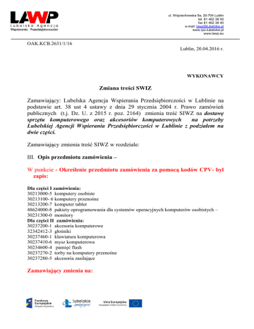 ul. Wojciechowska 9a, 20-704 Lublin tel. 81 462 38 00 fax 81 462 38 40 e-mail: [email protected] www.rpo.lubelskie.pl www.lawp.eu OAK.KCB.2631/1/16 Lublin, 20.04.2016 r. WYKONAWCY Zmiana treści SWIZ Zamawiający: Lubelska Agencja Wspierania Przedsiębiorczości w Lublinie na podstawie art. 38 ust 4 ustawy z dnia 29 stycznia 2004 r. Prawo zamówień publicznych (t.j. Dz. U. z 2015 r. poz. 2164) zmienia treść SIWZ na dostawę sprzętu komputerowego oraz akcesoriów komputerowych na potrzeby Lubelskiej Agencji Wspierania Przedsiębiorczości w Lublinie z podziałem na dwie części. Zamawiający zmienia treść SIWZ w rozdziale: III. Opis przedmiotu zamówienia – W punkcie - Określenie przedmiotu zamówienia za pomocą kodów CPV- był zapis: Dla części I zamówienia: 30213000-5 komputery osobiste 30213100- 6 komputery przenośne 30213200-7 komputer tablet 48624000-8 pakiety oprogramowania dla systemów operacyjnych komputerów osobistych – 30231300-0 monitory Dla części II zamówienia: 30237200-1 akcesoria komputerowe 32342412-3 głośniki 30237460-1 klawiatura komputerowa 30237410-6 mysz komputerowa 30234600-4 pamięć flash 30237270-2 torby na komputery przenośne 30237280-5 akcesoria zasilające Zamawiający zmienia na: ul. Wojciechowska 9a, 20-704 Lublin tel. 81 462 38 00 fax 81 462 38 40 e-mail: [email protected] www.rpo.lubelskie.pl www.lawp.eu Dla części I zamówienia: 30213000-5 komputery osobiste 30213100- 6 komputery przenośne 48624000-8 pakiety oprogramowania dla systemów operacyjnych komputerów osobistych – 30231300-0 monitory Dla części II zamówienia: 30237200-1 akcesoria komputerowe 30213200-7 komputer tablet 32342412-3 głośniki 30237460-1 klawiatura komputerowa 30237410-6 mysz komputerowa 30234600-4 pamięć flash 30237270-2 torby na komputery przenośne 30237280-5 akcesoria zasilające Pozostałe treści SIWZ pozostają bez zmian. Zamawiający na podstawie art. 38 ust. 4a ustawy wprowadza również stosowne zmiany w ogłoszeniu o zamówieniu. Zatwierdził Dyrektor LAWP w Lublinie Marceli Niezgoda