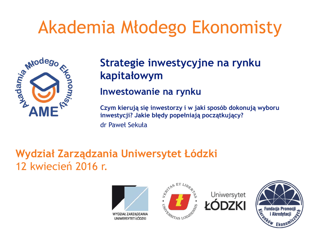 Akademia Młodego Ekonomisty Strategie inwestycyjne na rynku kapitałowym Inwestowanie na rynku Czym kierują się inwestorzy i w jaki sposób dokonują wyboru inwestycji? Jakie błędy popełniają początkujący? dr Paweł Sekuła Wydział Zarządzania Uniwersytet Łódzki 12 kwiecień 2016 r. Uruchamiamy biznes Kapitałodawcy Kapitałobiorcy Kapitałodawca Kapitałobiorca KAPITAŁ KAPITAŁ POMYSŁY ZYSKI Rynek finansowy Giełda Rynek finansowy (charakter globalny) rynek pieniężny; rynek kapitałowy; rynek instrumentów pochodnych; rynek walutowy New York Stock Exchange Chicago Board of Trade GPW w Warszawie SA GPW w Warszawie SA dealing room Rynek kapitałowy – podstawowe pojęcia • bessa – długotrwała, silna tendencja spadkowa na rynku. • hossa – długotrwała, silna tendencja wzrostowa na rynku. Cykl giełdowy – hossa i bessa • akcjonariusz – właściciel akcji. • akcja – instrument zaświadczający o udziale w kapitale spółki akcyjnej, uprawniający między innymi do otrzymywania dywidend i uczestnictwa w walnych zgromadzeniach akcjonariuszy. • obligacja – papier wartościowy, w którym emitent stwierdza, że jest dłużnikiem właściciela obligacji (obligatariusza) i zobowiązuje się wobec niego do spełnienia określonego świadczenia, najczęściej w formie pieniężnej (zwykle wypłacenia kuponów odsetkowych oraz zwrotu pełnej kwoty pożyczki w terminie wykupu – nominału obligacji). • dematerializacja obrotu papierami wartościowymi – obrót papierami wartościowymi zapisanymi w postaci impulsu elektronicznego (świadectwo depozytowe – dokument potwierdzający własność danego papieru wartościowego). • dom maklerski (biuro maklerskie) – podmiot, który może zajmować się oferowaniem papierów wartościowych, nabywaniem i sprzedażą papierów wartościowych na własny lub cudzy rachunek, zarządzaniem portfelem papierów wartościowych i doradztwem inwestycyjnym dla swoich klientów. • indeks giełdowy – wskaźnik informujący o zmianie cen spółek na rynku (WIG20, WIG, Dow Jones Average Industrial, S&P 500, Nasdaq, DAX30, FTS100, CAC40, Nikkei). • spółka giełdowa – spółka publiczna, której akcje są dopuszczone do obrotu giełdowego. • kapitalizacja rynkowa spółki – całkowita wartość wszystkich akcji spółki, notowanej na giełdzie, liczona według kursu giełdowego. Spółki APPLE INC. ALPHABET INC MICROSOFT CORPORATIO.. LENOX WEALTH MANAGEM.. BERKSHIRE HATHAWAY I.. EXXON MOBIL CORPORAT.. FACEBOOK INC JOHNSON & JOHNSON GENERAL ELECTRIC COM.. AMAZON.COM, INC. NESTLE SA WELLS FARGO & CO AT&T INC. Kapitalizacja w mln USD 602 474 515 737 430 424 408 168 347 842 345 551 314 884 300 935 285 889 280 408 242 491 238 045 236 822 • dywidenda – część zysku netto spółki, przeznaczona do wypłaty akcjonariuszom. • system notowań – system zawierania transakcji na rynku (notowania jednolite – fixing, notowania ciągłe). • wartość obrotów – łączna wartość wszystkich transakcji zawartych dla danego papieru wartościowego lub na całym rynku. • wolumen obrotów – łączna liczba papierów wartościowych, które zmieniły właściciela, liczona dla danego papieru wartościowego lub rynku. Strategia inwestycyjna W co inwestować? Jak dokonać wyboru? Inwestor, który wie, jak dokonywać wyboru spółek i wykorzystywać okazje inwestycyjne. Warren Buffett, majątek 60,8 mld USD, kontroluje Berkshire Hathaway Analiza fundamentalna Analiza światowej koniunktury Analiza makroekonomiczna państwa (tempo wzrostu, inflacja, sytuacja polityczna) (GDP, inflacja, polityka ekonomiczna) Analiza fundamentalna Analiza spółki Analiza branży (wzrost, konkurencja) (funkcjonowanie, organizacja, sytuacja finansowa, słabe i mocne stron) Poszukiwanie wartości przez analityków fundamentalnych Cena Cena giełdowa N Wartość wewnętrzna P N Akcje niedowartościowane – N; akcje przewartościowane - P P Czas Analiza techniczna Co jest źródłem sukcesów inwestycyjnych? Finanse behawioralne Człowiek nie jest doskonały Emocje w inwestowaniu Zmieniające się nastroje inwestorów wraz ze zmianą koniunktury giełdowej Cena iluzja chciwość entuzjazm rosnące zainteresowanie niedowierzanie strach kapitulacja desperacja Czas Warsztaty: Wybór portfela inwestycyjnego Co się wydarzyło w ciągu kolejnych 12 miesięcy? 80000 70000 60000 50000 40000 30000 20000 10000 0 Indeks WIG stracił 15,5 proc. 300 250 200 150 100 50 0 Akcje Banku PBP straciły 23,8 proc. 3000 2500 2000 1500 1000 500 0 Akcje LP-moda zyskały 77,1 proc. 120 100 80 60 40 20 0 Akcje Fincapital straciły 92 proc. 300 250 200 150 100 50 0 Akcje K-metale straciły 37,2 proc. Co się wydarzyło w ciągu kolejnych 8 lat? 80000 70000 60000 50000 40000 30000 20000 10000 0 Indeks WIG stracił 16,3 proc. 300 250 200 150 100 50 0 Akcje Banku PBP straciły 40,9 proc. 12000 10000 8000 6000 4000 2000 0 Akcje LP-moda zyskały 329,8 proc. 120 100 80 60 40 20 0 Akcje Fincapital straciły 97,2 proc. 350 300 250 200 150 100 50 0 Akcje K-metale zyskały 70,2 proc.
