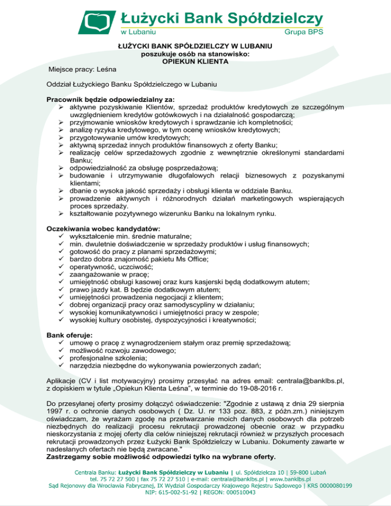 ŁUŻYCKI BANK SPÓŁDZIELCZY W LUBANIU poszukuje osób na stanowisko: OPIEKUN KLIENTA Miejsce pracy: Leśna Oddział Łużyckiego Banku Spółdzielczego w Lubaniu Pracownik będzie odpowiedzialny za: aktywne pozyskiwanie Klientów, sprzedaż produktów kredytowych ze szczególnym uwzględnieniem kredytów gotówkowych i na działalność gospodarczą; przyjmowanie wniosków kredytowych i sprawdzanie ich kompletności; analizę ryzyka kredytowego, w tym ocenę wniosków kredytowych; przygotowywanie umów kredytowych; aktywną sprzedaż innych produktów finansowych z oferty Banku; realizację celów sprzedażowych zgodnie z wewnętrznie określonymi standardami Banku; odpowiedzialność za obsługę posprzedażową; budowanie i utrzymywanie długofalowych relacji biznesowych z pozyskanymi klientami; dbanie o wysoka jakość sprzedaży i obsługi klienta w oddziale Banku. prowadzenie aktywnych i różnorodnych działań marketingowych wspierających proces sprzedaży. kształtowanie pozytywnego wizerunku Banku na lokalnym rynku. Oczekiwania wobec kandydatów: wykształcenie min. średnie maturalne; min. dwuletnie doświadczenie w sprzedaży produktów i usług finansowych; gotowość do pracy z planami sprzedażowymi; bardzo dobra znajomość pakietu Ms Office; operatywność, uczciwość; zaangażowanie w pracę; umiejętność obsługi kasowej oraz kurs kasjerski będą dodatkowym atutem; prawo jazdy kat. B będzie dodatkowym atutem; umiejętności prowadzenia negocjacji z klientem; dobrej organizacji pracy oraz samodyscypliny w działaniu; wysokiej komunikatywności i umiejętności pracy w zespole; wysokiej kultury osobistej, dyspozycyjności i kreatywności; Bank oferuje: umowę o pracę z wynagrodzeniem stałym oraz premię sprzedażową; możliwość rozwoju zawodowego; profesjonalne szkolenia; narzędzia niezbędne do wykonywania powierzonych zadań; Aplikacje (CV i list motywacyjny) prosimy przesyłać na adres email: [email protected], z dopiskiem w tytule „Opiekun Klienta Leśna”, w terminie do 19-08-2016 r. Do przesyłanej oferty prosimy dołączyć oświadczenie: "Zgodnie z ustawą z dnia 29 sierpnia 1997 r. o ochronie danych osobowych ( Dz. U. nr 133 poz. 883, z póżn.zm.) niniejszym oświadczam, że wyrażam zgodę na przetwarzanie moich danych osobowych dla potrzeb niezbędnych do realizacji procesu rekrutacji prowadzonej obecnie oraz w przypadku nieskorzystania z mojej oferty dla celów niniejszej rekrutacji również w przyszłych procesach rekrutacji prowadzonych przez Łużycki Bank Spółdzielczy w Lubaniu. Dokumenty zawarte w nadesłanych ofertach nie będą zwracane." Zastrzegamy sobie możliwość odpowiedzi tylko na wybrane oferty.