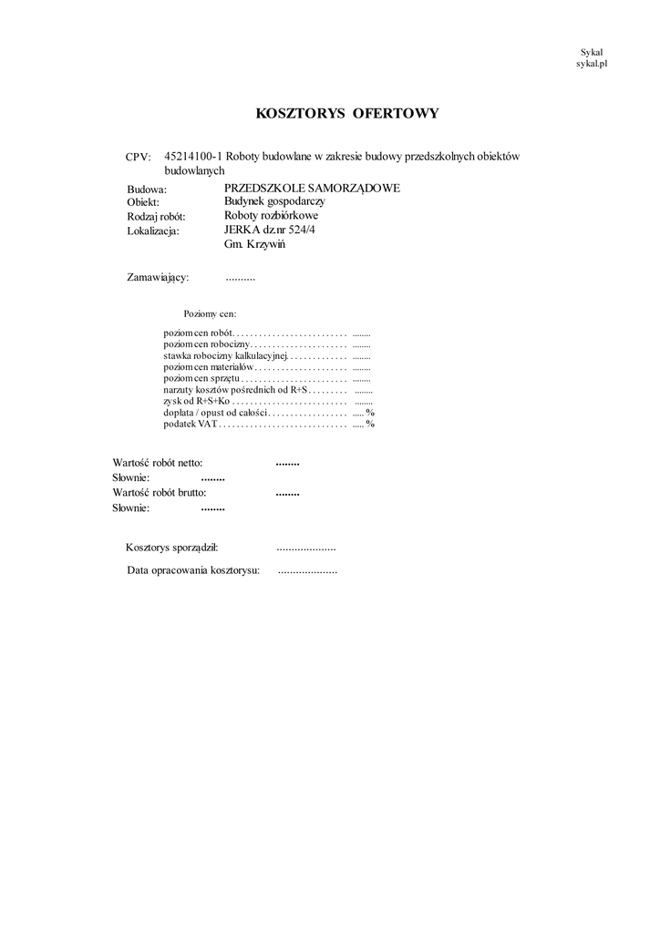 Sykal sykal.pl KOSZTORYS OFERTOWY 45214100-1 Roboty budowlane w zakresie budowy przedszkolnych obiektów budowlanych PRZEDSZKOLE SAMORZĄDOWE Budowa: Budynek gospodarczy Obiekt: Roboty rozbiórkowe Rodzaj robót: JERKA dz.nr 524/4 Lokalizacja: Gm. Krzywiń CPV: Zamawiający: .......... Poziomy cen: poziom . . . . . .cen . . . .robót .............................. poziom . . . . . .cen . . . .robocizny .............................. stawka . . . . . .robocizny . . . . . . . . . kalkulacyjnej ......................... poziom . . . . . .cen . . . .materiałów .............................. poziom . . . . . .cen . . . .sprzętu .............................. narzuty . . . . . . kosztów . . . . . . . . pośrednich . . . . . . . . . . .od . . R+S ............. zysk . . . .od . . .R+S+Ko ................................. dopłata . . . . . . /. .opust . . . . . od . . .całości ........................ podatek . . . . . . .VAT ................................. Wartość robót netto: ........ Słownie: Wartość robót brutto: ........ Słownie: ........ ........ Kosztorys sporządził: .................... Data opracowania kosztorysu: .................... ........ ........ ........ ........ ........ ........ ........ ..... % ..... % Sykal sykal.pl TABELA ELEMENTÓW SCALONYCH 45214100-1 Roboty budowlane w zakresie budowy przedszkolnych obiektów budowlanych PRZEDSZKOLE SAMORZĄDOWE Budowa: Budynek gospodarczy Obiekt: Roboty rozbiórkowe Rodzaj robót: JERKA dz.nr 524/4 Lokalizacja: Gm. Krzywiń CPV: Zamawiający: .......... poziom . . . . . .cen . . . .robót .............................. poziom . . . . . .cen . . . .robocizny .............................. stawka . . . . . .robocizny . . . . . . . . . kalkulacyjnej ......................... poziom . . . . . .cen . . . .materiałów .............................. poziom . . . . . .cen . . . .sprzętu .............................. narzuty . . . . . . kosztów . . . . . . . . pośrednich . . . . . . . . . . .od . . R+S ............. zysk . . . .od . . .R+S+Ko ................................. dopłata . . . . . . /. .opust . . . . . od . . .całości ........................ podatek . . . . . . .VAT ................................. KOSZTORYS ........ ........ ........ ........ ........ ........ ........ ..... % ..... % Strona 1 19-04-2016 SYKAL-002602 DZIAŁ 1 NAZWA DZIAŁU ROBOC MATERIAŁ SPRZĘT K.OGÓLNE ZYSK OGÓŁEM Roboty rozbiórkowe ........ ........ ........ ........ ........ ........ O GÓ ŁEM ........ ........ ........ ........ ........ ........ O GÓ ŁEM NETTO Podatek VAT O G Ó Ł E M Z P O D A T K I E M V A T ........ ........ ........ ........ Sykal sykal.pl PRZEDMIAR ROBÓT 45214100-1 Roboty budowlane w zakresie budowy przedszkolnych obiektów budowlanych PRZEDSZKOLE SAMORZĄDOWE Budowa: Budynek gospodarczy Obiekt: Roboty rozbiórkowe Rodzaj robót: JERKA dz.nr 524/4 Lokalizacja: Gm. Krzywiń CPV: Zamawiający: .......... Strona 1 PRZEDMIAR 19-04-2016 SYKAL-002602 DZ SYMBOL POZYCJ I POZ 1 Roboty rozbiórkowe 1 10 KNR Lp 1 1 20 KNR Lp 1 1 30 KNR 1 40 KNR Lp 1 1 50 KNR Lp 1 1 60 KNR Lp 1 1 70 KNR Lp 1 1 1 1 1 1 1 3,75*12,76+2,90*3,23+1,96*1,48+1,99*1,46 szt Obliczenie ilości 3 3,000 3,000 m³ 9,453 m³ 33,053 Obliczenie ilości 63,023*0,15 404-01-02-02-00 Rozebranie murów w budynkach z cegły na zaprawie cementowo-wapiennej Nazwa Obliczenie ilości (3,19*3+15,99*2+2,31+1,48+1,68+1,46+1,71)*0,6*0,8 Nazwa m³ 9,453+33,053+24,091+7,491 m³ 74,088 74,088 m³ 74,088 63,023 74,088 74,088 74,088 Obliczenie ilości Obliczenie ilości 74,088 74,088 m³ Obliczenie ilości 000-00-00-03-00+ Utylizacja papy 7,491 74,088 Obliczenie ilości 000-00-00-01-00+ Opłata za wysypisko - utylizacja 24,091 7,491 Obliczenie ilości 404-11-03-05-00 Dodatek za dalsze 10 km wywozu gruzu samochodem wywrotką Lp m³ (3,19*12,20+2,95*2,37+1,20*1,68+1,18*1,71)*0,15 404-11-03-04-00 Transport gruzu samochodem wywrotką na odległość do 1 km Nazwa 33,053 24,091 Obliczenie ilości 404-11-03-01-00 Załadunek gruzu koparko-ładowarką przy 3 samochodach wywrotkach na zmianę roboczą Nazwa m³ Obliczenie ilości 404-03-01-03-00 Rozebranie podłoża i posadzki z betonu żwirowego grub do 15 cm Nazwa 9,453 (3,19*3+15,99*2+2,31+1,48+1,68+1,46+1,71)*2,5*0,28-1,40*0,81*2*0,28-0,95 *2,10*2*0,28-0,83*1,41*0,28 404-03-02-01-00 Rozebranie betonowych ław fudamentów Nazwa Nazwa 1 63,023 404-03-05-02-00 Rozebranie stropów żelbetowych Nazwa Lp 120 63,023 2,000 Nazwa 1 m² szt Lp 110 ILOŚĆ 401-03-54-07-00 Wykucie z muru ościeżnic okiennych o powierzchni do 2 m² 100 KNR 1 JEDN MIARY Obliczenie ilości 401-03-54-04-00 Wykucie z muru ościeżnic drzwiowych o powierzchni do 2 m² Nazwa 90 KNR Lp 1 404-05-09-03-00 Rozebranie pokrycia dachowego z papy na betonie na zakład Nazwa 80 KNR Lp NAZWA POZYCJ I PRZE DMIAROWEJ 74,088 74,088 m² 63,023 63,023 Sykal sykal.pl KOSZTORYS OFERTOWY 45214100-1 Roboty budowlane w zakresie budowy przedszkolnych obiektów budowlanych PRZEDSZKOLE SAMORZĄDOWE Budowa: Budynek gospodarczy Obiekt: Roboty rozbiórkowe Rodzaj robót: JERKA dz.nr 524/4 Lokalizacja: Gm. Krzywiń CPV: Zamawiający: .......... KOSZTORYS Strona 1 19-04-2016 SYKAL-002602 SYMBOL I NAZWA POZYCJ I KOS ZTORYSOWE J DZ POZ 1 1 JEDN MIARY ILOŚĆ CENA WARTOŚĆ Roboty rozbiórkowe 10 KNR 404-05-09-03-00 Rozebranie pokrycia dachowego z papy na betonie na zakład m² 63,023 .............. .............. 20 KNR 401-03-54-04-00 Wykucie z muru ościeżnic drzwiowych o powierzchni do 2 m² szt 3,000 .............. .............. 30 KNR 401-03-54-07-00 Wykucie z muru ościeżnic okiennych o powierzchni do 2 m² szt 2,000 .............. .............. 40 KNR 404-03-05-02-00 Rozebranie stropów żelbetowych m³ 9,453 .............. .............. 50 KNR 404-01-02-02-00 Rozebranie murów w budynkach z cegły na zaprawie cementowo-wapiennej m³ 33,053 .............. .............. 60 KNR 404-03-02-01-00 Rozebranie betonowych ław fudamentów m³ 24,091 .............. .............. 1