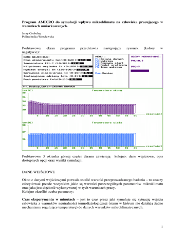 Program AMICRO do symulacji wpływu mikroklimatu na człowieka pracuj cego w warunkach umiarkowanych. Jerzy Grobelny Politechnika Wrocławska Podstawowy negatywie): ekran programu przedstawia nast puj cy Podstawowe 3 okienka górnej cz ci ekranu zawieraj dost pnych opcji oraz wyniki symulacji. rysunek (kolory w kolejno: dane wej ciowe, opis DANE WEJ CIOWE Okno z danymi wej ciowymi pozwala ustali warunki przeprowadzanego badania – to znaczy zdecydowa przede wszystkim jakie s warto ci poszczególnych parametrów mikroklimatu oraz jaka jest ci ko wykonywanej w tych warunkach pracy. Kolejno okre li trzeba parametry: Czas eksperymentu w minutach – jest to czas przez jaki symuluje si sytuacj wej cia człowieka z warunków neutralno ci termofizjologicznej (stanu w którym nie działaj adne mechanizmy reguluj ce temperatur ) do danych warunków mikroklimatycznych. 1 Temperatura w stopniach Celsjusza – jest to rednia temperatura jaka panuje w badanym rodowisku przez wyznaczony czas symulacji. Wilgotno wzgl dna w procentach – jest to procentowo wyra ona ilo pary wodnej w powietrzu w stosunku do ilo ci maksymalnej w danej temperaturze (czyli sytuacji tzw. pary nasyconej). Wydatek energii w Watach – okre la ilo energii jak musi wyzwoli pracuj cy organizm dla danego zadania. 120 W stanowi tzw. podstawow przemian materii i jest to energia niezb dna do podtrzymania procesów yciowych bez adnej dodatkowej aktywno ci organizmu. Sprawno ciepło-praca – okre la w procentach jaka cz energii organizmu wyzwalanej w danej sytuacji ( pracy) jest zamieniana bezpo rednio na prac (reszta zamienia si na ciepło). Ta wielko zale y od typu aktywno ci fizycznej. Generalnie im bardziej dynamiczne s wykonywane czynno ci tym wy szy współczynnik sprawno ci ale najwy szy wynosi ok 20 procent co oznacza e 80 procent energii zamienia si na ciepło w najsprawniej wykonywanych pracach fizycznych. Izolacyjno odzie y w umownych jednostkach clo oznacza generalnie stopie zatrzymywania ciepła przez odzie . Konkretne wielko ci uzyskane ze szczegółowych bada zestawione s w specjalnych tabelach i normach (przykłady poni ej). Ruch powietrza w metrach na sekund - okre la szybko przepływu cz stek powietrza w sytuacji gdy istnieje taki ruch (na przykład wentylacja) w badanym rodowisku. Mierzy si te warto ci za pomoc anemometrów. Wprowadzanie danych odbywa si za pomoc klawiatury co zaznaczono w dolnej linii okna danych. Strzałki pozwalaj przemieszcza si mi dzy polami danych, klawisz Backspace wymazuje dane istniej ce, a Enter zatwierdza dane wpisane. OKNO MENU Okno menu wy wietla dost pne w danym momencie opcje programu. Opcje dost pne s za pomoc odpowiednich przycisków funkcyjnych z klawiatury komputera. Podstawowe z nich to: F1 – Zmiana danych - pozwala wł czy okno wprowadzania danych i wprowadza nowe warto ci do odpowiednich pól, F2 – Wykresy - generuje wykresy podstawowych parametrów termofizjologicznych (temperatur i wilgotno ci) ciała człowieka w badanych warunkach w czasie symulowanego okresu, F3 – Ponowny start - przywraca domy lne warto ci optymalnych parametrów dla pracy biurowej, F4 – Model graficzny - zmienia okno wykresów na okno graficznego modelu, pokazuj cego zale no ci termofizjologiczne na analogii przepływu cieczy w poł czonych zbiornikach, 2 F5 – Inne wykresy - pozwala w oknie WYKRESY wybra dost pnych, 2 parametry z czterech End – oznacza zako czenie wprowadzania danych, Esc – całkowite wyj cie z programu. OKNO MENU PO WPROWADZENIU DANYCH Po wprowadzeniu danych i wci ni ciu End ( i F2 – wykresy, je li były ju przeprowadzone symulacje) w oknie menu dost pne s opcje: DOWOLNY – oznacza e wci ni cie dowolnego przycisku spowoduje obliczenie jednego kroku symulacji, F5 – obliczenie całego cyklu, F6 – przej cie do wprowadzania danych. PRAKTYCZNY SPOSÓB PRZEPROWADZENIA OBLICZE Przeprowadzanie oblicze nast puj cym cyklu: 1. 2. 3. 4. 5. 6. 7. 8. 9. dla ró nych zestawów parametrów najlepiej wykonywa w Wprowadzi dane w oknie danych Wcisn End Wcisn F5 Zanotowa wyniki F1 – pozwoli wprowadza nowe dane End zako czy wprowadzanie F2 – przeł czy menu na wykresy F5 – wł czy symulacj Przej do punktu 5 OKNO OCENY NORMATYWNE Po wykonaniu oblicze symulacyjnych w tym oknie wy wietlane s oceny zgodne z normami w tym zakresie (takie same ISO i PN). PMV – predicted mean vote (przewidywana rednia ocena) i PPD predicted percentage of dissatisfied – przewidywany odsetek niezadowolonych (z warunków mikroklimatu). Je li obliczone parametry odbiegaj od normy wyniki wy wietlane s na czerwono. W normie mieszcz si warunki dla których PPD jest mniejsze ni 10 – oznacza to e mniej ni 10 procent osób w populacji b dzie niezadowolonych (z powodu odczuwania zbytniego ciepła lub zimna) MODEL GRAFICZNY Poni ej pokazane jest okno (negatyw) modelu graficznego uzyskiwanego z podstawowego menu za pomoc przycisku F4: 3 Model ten wyja nia przepływy ciepła w organizmie człowieka przez analogi do przepływu cieczy w zbiornikach. Ciało człowieka jest odwzorowane przez dwa zbiorniki – WN TRZE i SKÓR . Pojemno ci tych zbiorników odpowiadaj pojemno ci cieplnej przeci tnego człowieka (o przeci tnym wzro cie i przeci tnych własno ciach wszystkich istotnych parametrów fizycznych). Przyj te oznaczenia s nast puj ce: MET – Całkowity metabolizm czyli ł czna ilo sytuacji roboczej. (strumie ) ciepła produkowana w danej R+C – ł czny strumie ciepła traconego lub zyskiwanego na drodze radiacji i konwekcji (promieniowanie i ogrzewanie cz stek powietrza). EVAP – strumie ciepła traconego poprzez parowanie cz stek wody (potu) z powierzchni ciała. R1 - R5 - zawory symbolizuj ce akcje termoregulacyjne organizmu sterowane przez mechanizm termoregulacji znajduj cy si w mózgu (w podwzgórzu). 4 TABLICE WARTO CI PODSTAWOWYCH PARAMETRÓW MODELU TAB 1. Orientacyjne dane z laboratoryjnych pomiarów metabolizmu w ró nych rodzajach obci enia prac Poziom ci ko ci pracy Spoczynek Metabolizm w Watach