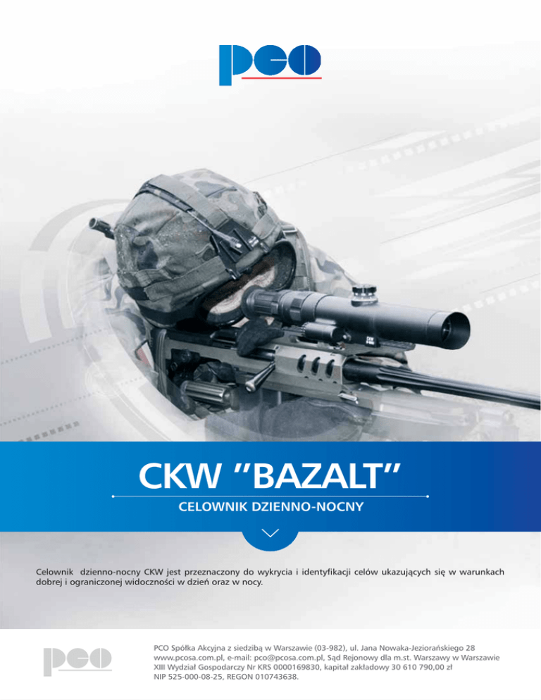 CKW ”BAZALT” CELOWNIK DZIENNO-NOCNY Celownik dzienno-nocny CKW jest przeznaczony do wykrycia i identyfikacji celów ukazujących się w warunkach dobrej i ograniczonej widoczności w dzień oraz w nocy. PCO Spółka Akcyjna z siedzibą w Warszawie (03-982), ul. Jana Nowaka-Jeziorańskiego 28 www.pcosa.com.pl, e-mail: [email protected], Sąd Rejonowy dla m.st. Warszawy w Warszawie XIII Wydział Gospodarczy Nr KRS 0000169830, kapitał zakładowy 30 610 790,00 zł NIP 525-000-08-25, REGON 010743638. CKW ”BAZALT” Celownik jest przeznaczony do broni indywidualnej i zespołowej – karabinów, karabinów maszynowych, karabinów wyborowych (w tym wielkokalibrowych) i granatników. Celownik daje możliwość nanoszenia poprawek strzeleckich w pionie i w poziomie przy zmianie odległości celowania w trakcie przestrzeliwania broni. Pozwala na podświetlenie znaku celowego oraz wygodną zmianę funkcji pracy dzień-noc poprzez szybką wymianę okularu do pracy w dzień na moduł ze wzmacniaczem jak również wygodne zdejmowanie i zakładanie celownika na broń, bez naruszania ustawionej osi celownika. Cechy wyróżniające produkt: Dane Techniczne • wygodna zmiana funkcji pracy dzień-noc poprzez szybką wymianę okularu do pracy w dzień na moduł ze wzmacniaczem obrazu, • zamiana trybu pracy z dziennego na nocny nie wymaga ponownego przestrzelania celownika, • funkcja zoom – płynna zmiana powiększenia, • funkcja przeogniskowania obiektywu – płynna zmiana ostrości obserwowanego celu, • podświetlenie znaku celowego, • nie wymaga długich szyn montażowych. Typ wzmacniacza obrazu XD4/XR5 Powiększenie Dzień: 1,5x – 6x / Noc: 1,8x – 7,5x Pola widzenia Dzień: 9,00°- 4,10° / Noc: 7,00°-1,25° Ruch dioptryjny od -6 dptr do +2 dptr Zasilanie jedna bateria litowa 3,6 V (rozmiar R6/AA) Zakres temperatur pracy od -30ºC do +50ºC Odległość źrenicy wyjściowej od okularu 70 mm