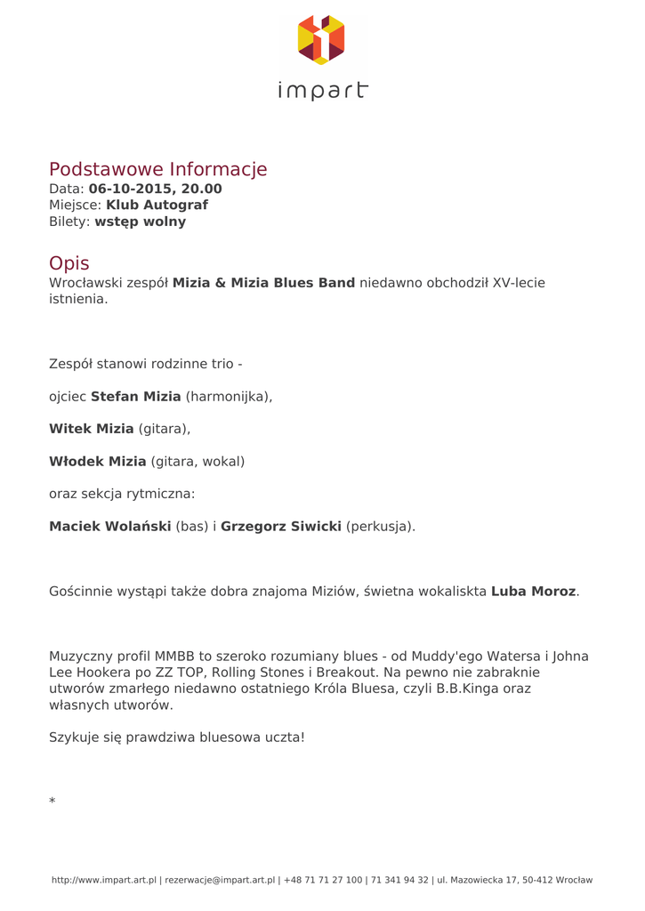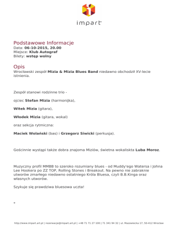 Podstawowe Informacje Data: 06-10-2015, 20.00 Miejsce: Klub Autograf Bilety: wstęp wolny Opis Wrocławski zespół Mizia & Mizia Blues Band niedawno obchodził XV-lecie istnienia. Zespół stanowi rodzinne trio ojciec Stefan Mizia (harmonijka), Witek Mizia (gitara), Włodek Mizia (gitara, wokal) oraz sekcja rytmiczna: Maciek Wolański (bas) i Grzegorz Siwicki (perkusja). Gościnnie wystąpi także dobra znajoma Miziów, świetna wokaliskta Luba Moroz. Muzyczny profil MMBB to szeroko rozumiany blues - od Muddy'ego Watersa i Johna Lee Hookera po ZZ TOP, Rolling Stones i Breakout. Na pewno nie zabraknie utworów zmarłego niedawno ostatniego Króla Bluesa, czyli B.B.Kinga oraz własnych utworów. Szykuje się prawdziwa bluesowa uczta! * http://www.impart.art.pl | [email protected] | +48 71 71 27 100 | 71 341 94 32 | ul. Mazowiecka 17, 50-412 Wrocław Zespół w obecnym, pięcioosobowym składzie istnieje od maja 2006 roku. Wtedy to Witek namówił do współpracy i wspólnego grania bluesów przyjaciela z lat szkolnych, Roberta, który wraz z Grzegorzem stworzył sekcję rytmiczną Mizia & Mizia Blues Band. W październiku 2007 roku zespół zagrał na Małej Scenie na Rawa Blues Festival. W ciągu roku zespół okazjonalnie koncertuje w różnych klubach we Wrocławiu (Łykend, Kredens, Alive), a także w całkiem odległych miejscach jak Orle w Górach Izerskich, klub Korona w Kłodzku czy 4 Róże dla Lucienne w Zielonej Górze. W marcu 2008 zespół nagrał płytę Mizia&Mizia Blues Band zawierającą standardy bluesowe mistrzów gatunku (Muddy Waters, John Lee Hooker, ZZ TOP), a także własne utwory z przymrużeniem oka traktujące o tym, co jest głównym polem działalności Stefana i Włodka, czyli o szkole. W lipcu 2008 roku w roli basisty zespołu Roberta zastąpił Maciek Wolański, znany bluesowej publiczności z zespołu Sufit. Oczywiście zespół nie rezygnuje też z akustycznego oblicza i bardziej archaicznego repertuaru. W ciągu 9 lat od założenia zespołu przez duet Stefana i Włodka Miziów i premierowego występu na festiwalu WYBRYK w III LO w 2000 roku zespół Mizia & Mizia razem z Witkiem, który nieco później dołączył do składu, czterokrotnie grał na Małej Scenie Rawy Blues, uczestniczył z sukcesami w takich festiwalach jak Blues Na Kujawach, Bluestracje, Noc Bluesowa w Rawie Mazowieckiej i Blues Brothers Day oraz koncertował w wielu miejscach w Polsce (Blues Club w Gdyni, Lizard King w Łodzi, kluby w Elblągu, Kłodzku) i oczywiście we wrocławskich klubach (4 Pory Roku, Gawra, Kaktus, Łykend, Rura, Kolor, Celtic). Ciekawostką mogą być występy akustycznego duetu Mizia&Mizia podczas podróży Miziównauczycieli po Rosji i Ukrainie razem z uczniami. Występy w Kijowie (Buddy Guy Blues Club, Blues Cafe i … występ uliczny na Chryszcziatiku) oraz w Sankt Petersburgu (Jimi Hendrix Blues Club) były naprawdę niesamowitym przeżyciem dla muzyków, ich uczniów i także niezwykle chłonnej na bluesa miejscowej publiczności. Zobacz film z XV-lecia MMBB http://www.impart.art.pl | [email protected] | +48 71 71 27 100 | 71 341 94 32 | ul. Mazowiecka 17, 50-412 Wrocław Powered by TCPDF (www.tcpdf.org)