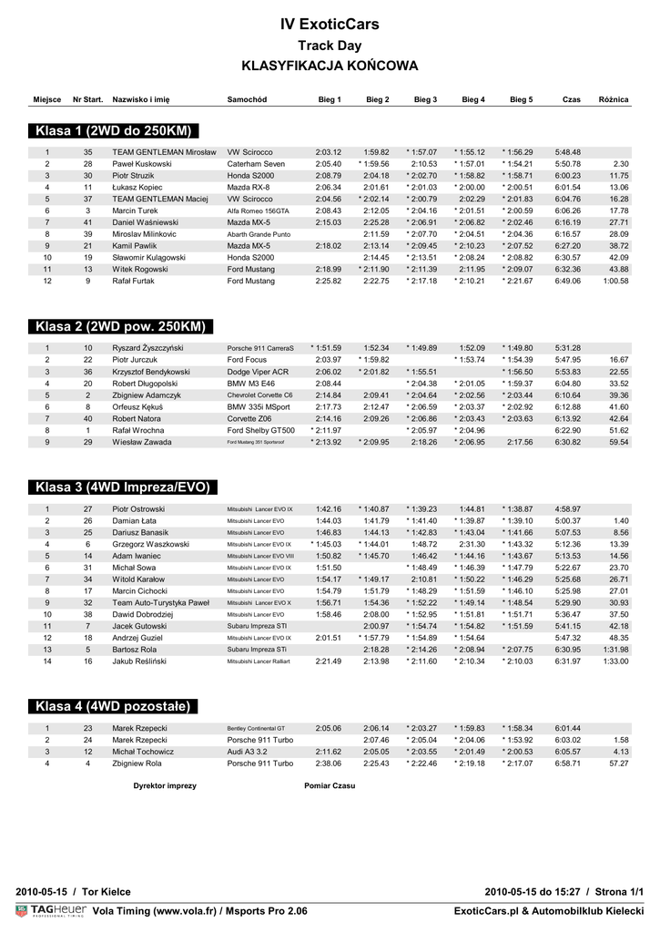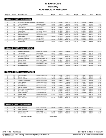 IV ExoticCars Track Day KLASYFIKACJA KOŃCOWA Miejsce Nr Start. Nazwisko i imię Samochód Bieg 1 Bieg 2 Bieg 3 Bieg 4 Bieg 5 Czas Różnica Klasa 1 (2WD do 250KM) 1 35 TEAM GENTLEMAN Mirosław VW Scirocco 2:03.12 1:59.82 * 1:57.07 * 1:55.12 * 1:56.29 5:48.48 2 28 Paweł Kuskowski Caterham Seven 2:05.40 * 1:59.56 2:10.53 * 1:57.01 * 1:54.21 5:50.78 2.30 3 30 Piotr Struzik Honda S2000 2:08.79 2:04.18 * 2:02.70 * 1:58.82 * 1:58.71 6:00.23 11.75 4 11 Łukasz Kopiec Mazda RX-8 2:06.34 2:01.61 * 2:01.03 * 2:00.00 * 2:00.51 6:01.54 13.06 5 37 TEAM GENTLEMAN Maciej VW Scirocco 2:04.56 * 2:02.14 * 2:00.79 2:02.29 * 2:01.83 6:04.76 16.28 6 3 Marcin Turek Alfa Romeo 156GTA 2:08.43 2:12.05 * 2:04.16 * 2:01.51 * 2:00.59 6:06.26 17.78 7 41 Daniel Waśniewski Mazda MX-5 2:15.03 2:25.28 * 2:06.91 * 2:06.82 * 2:02.46 6:16.19 27.71 8 39 Miroslav Milinkovic Abarth Grande Punto 2:11.59 * 2:07.70 * 2:04.51 * 2:04.36 6:16.57 28.09 9 21 Kamil Pawlik Mazda MX-5 2:13.14 * 2:09.45 * 2:10.23 * 2:07.52 6:27.20 38.72 10 19 Sławomir Kulągowski Honda S2000 2:14.45 * 2:13.51 * 2:08.24 * 2:08.82 6:30.57 42.09 11 13 Witek Rogowski Ford Mustang 2:18.99 * 2:11.90 * 2:11.39 2:11.95 * 2:09.07 6:32.36 43.88 12 9 Rafał Furtak Ford Mustang 2:25.82 2:22.75 * 2:17.18 * 2:10.21 * 2:21.67 6:49.06 1:00.58 * 1:49.89 1:52.09 * 1:49.80 5:31.28 * 1:53.74 * 1:54.39 5:47.95 16.67 * 1:56.50 5:53.83 22.55 2:18.02 Klasa 2 (2WD pow. 250KM) 1 10 Ryszard Żyszczyński Porsche 911 CarreraS * 1:51.59 1:52.34 2 22 Piotr Jurczuk Ford Focus 2:03.97 * 1:59.82 3 36 Krzysztof Bendykowski Dodge Viper ACR 2:06.02 * 2:01.82 4 20 Robert Długopolski BMW M3 E46 2:08.44 5 2 Zbigniew Adamczyk Chevrolet Corvette C6 2:14.84 6 8 Orfeusz Kękuś BMW 335i MSport 7 40 Robert Natora Corvette Z06 8 1 Rafał Wrochna Ford Shelby GT500 * 2:11.97 9 29 Wiesław Zawada Ford Mustang 351 Sportsroof * 2:13.92 * 1:55.51 * 2:04.38 * 2:01.05 * 1:59.37 6:04.80 33.52 2:09.41 * 2:04.64 * 2:02.56 * 2:03.44 6:10.64 39.36 2:17.73 2:12.47 * 2:06.59 * 2:03.37 * 2:02.92 6:12.88 41.60 2:14.16 2:09.26 * 2:06.86 * 2:03.43 * 2:03.63 6:13.92 42.64 * 2:05.97 * 2:04.96 6:22.90 51.62 * 2:09.95 2:18.26 * 2:06.95 2:17.56 6:30.82 59.54 Klasa 3 (4WD Impreza/EVO) 1 27 Piotr Ostrowski Mitsubishi Lancer EVO IX 1:42.16 * 1:40.87 * 1:39.23 1:44.81 * 1:38.87 4:58.97 2 26 Damian Łata Mitsubishi Lancer EVO 1:44.03 1:41.79 * 1:41.40 * 1:39.87 * 1:39.10 5:00.37 3 25 Dariusz Banasik Mitsubishi Lancer EVO 1:46.83 1:44.13 * 1:42.83 * 1:43.04 * 1:41.66 5:07.53 8.56 4 6 Grzegorz Waszkowski Mitsubishi Lancer EVO IX * 1:45.03 * 1:44.01 1:48.72 2:31.30 * 1:43.32 5:12.36 13.39 5 14 Adam Iwaniec Mitsubishi Lancer EVO VIII 1:50.82 * 1:45.70 6 31 Michał Sowa Mitsubishi Lancer EVO IX 1:51.50 7 34 Witold Karałow Mitsubishi Lancer EVO 1:54.17 8 17 Marcin Cichocki Mitsubishi Lancer EVO 9 32 Team Auto-Turystyka Paweł 10 38 11 1.40 1:46.42 * 1:44.16 * 1:43.67 5:13.53 14.56 * 1:48.49 * 1:46.39 * 1:47.79 5:22.67 23.70 * 1:49.17 2:10.81 * 1:50.22 * 1:46.29 5:25.68 26.71 1:54.79 1:51.79 * 1:48.29 * 1:51.59 * 1:46.10 5:25.98 27.01 Mitsubishi Lancer EVO X 1:56.71 1:54.36 * 1:52.22 * 1:49.14 * 1:48.54 5:29.90 30.93 Dawid Dobrodziej Mitsubishi Lancer EVO 1:58.46 2:08.00 * 1:52.95 * 1:51.81 * 1:51.71 5:36.47 37.50 7 Jacek Gutowski Subaru Impreza STI 2:00.97 * 1:54.74 * 1:54.82 * 1:51.59 5:41.15 42.18 12 18 Andrzej Guziel Mitsubishi Lancer EVO IX * 1:57.79 * 1:54.89 * 1:54.64 13 5 Bartosz Rola Subaru Impreza STi 2:18.28 * 2:14.26 * 2:08.94 14 16 Jakub Reśliński Mitsubishi Lancer Ralliart 2:21.49 2:13.98 * 2:11.60 2:05.06 2:06.14 2:07.46 2:01.51 5:47.32 48.35 * 2:07.75 6:30.95 1:31.98 * 2:10.34 * 2:10.03 6:31.97 1:33.00 * 2:03.27 * 1:59.83 * 1:58.34 6:01.44 * 2:05.04 * 2:04.06 * 1:53.92 6:03.02 Klasa 4 (4WD pozostałe) 1 23 Marek Rzepecki Bentley Continental GT 2 24 Marek Rzepecki Porsche 911 Turbo 3 12 Michał Tochowicz Audi A3 3.2 2:11.62 2:05.05 * 2:03.55 * 2:01.49 * 2:00.53 6:05.57 4.13 4 4 Zbigniew Rola Porsche 911 Turbo 2:38.06 2:25.43 * 2:22.46 * 2:19.18 * 2:17.07 6:58.71 57.27 Dyrektor imprezy 1.58 Pomiar Czasu 2010-05-15 / Tor Kielce Vola Timing (www.vola.fr) / Msports Pro 2.06 2010-05-15 do 15:27 / Strona 1/1 VolaSoftControlPdf ExoticCars.pl & Automobilklub Kielecki