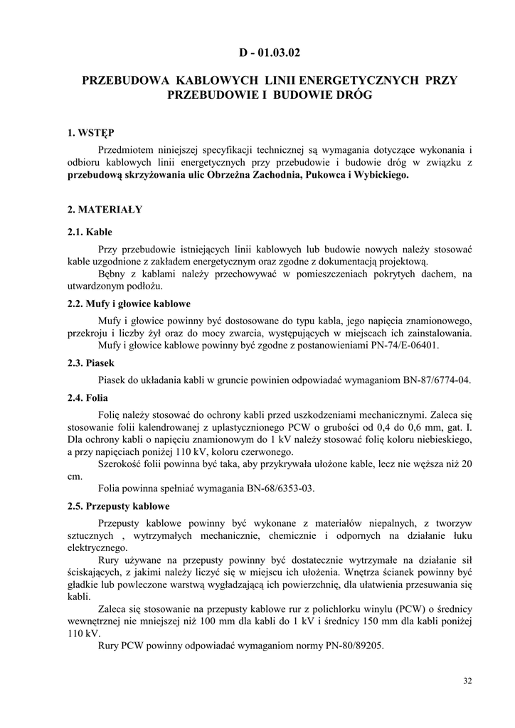 D - 01.03.02 PRZEBUDOWA KABLOWYCH LINII ENERGETYCZNYCH PRZY PRZEBUDOWIE I BUDOWIE DRÓG 1. WSTĘP Przedmiotem niniejszej specyfikacji technicznej są wymagania dotyczące wykonania i odbioru kablowych linii energetycznych przy przebudowie i budowie dróg w związku z przebudową skrzyŜowania ulic ObrzeŜna Zachodnia, Pukowca i Wybickiego. 2. MATERIAŁY 2.1. Kable Przy przebudowie istniejących linii kablowych lub budowie nowych naleŜy stosować kable uzgodnione z zakładem energetycznym oraz zgodne z dokumentacją projektową. Bębny z kablami naleŜy przechowywać w pomieszczeniach pokrytych dachem, na utwardzonym podłoŜu. 2.2. Mufy i głowice kablowe Mufy i głowice powinny być dostosowane do typu kabla, jego napięcia znamionowego, przekroju i liczby Ŝył oraz do mocy zwarcia, występujących w miejscach ich zainstalowania. Mufy i głowice kablowe powinny być zgodne z postanowieniami PN-74/E-06401. 2.3. Piasek Piasek do układania kabli w gruncie powinien odpowiadać wymaganiom BN-87/6774-04. 2.4. Folia Folię naleŜy stosować do ochrony kabli przed uszkodzeniami mechanicznymi. Zaleca się stosowanie folii kalendrowanej z uplastycznionego PCW o grubości od 0,4 do 0,6 mm, gat. I. Dla ochrony kabli o napięciu znamionowym do 1 kV naleŜy stosować folię koloru niebieskiego, a przy napięciach poniŜej 110 kV, koloru czerwonego. Szerokość folii powinna być taka, aby przykrywała ułoŜone kable, lecz nie węŜsza niŜ 20 cm. Folia powinna spełniać wymagania BN-68/6353-03. 2.5. Przepusty kablowe Przepusty kablowe powinny być wykonane z materiałów niepalnych, z tworzyw sztucznych , wytrzymałych mechanicznie, chemicznie i odpornych na działanie łuku elektrycznego. Rury uŜywane na przepusty powinny być dostatecznie wytrzymałe na działanie sił ściskających, z jakimi naleŜy liczyć się w miejscu ich ułoŜenia. Wnętrza ścianek powinny być gładkie lub powleczone warstwą wygładzającą ich powierzchnię, dla ułatwienia przesuwania się kabli. Zaleca się stosowanie na przepusty kablowe rur z polichlorku winylu (PCW) o średnicy wewnętrznej nie mniejszej niŜ 100 mm dla kabli do 1 kV i średnicy 150 mm dla kabli poniŜej 110 kV. Rury PCW powinny odpowiadać wymaganiom normy PN-80/89205. 32 Rury na przepusty kablowe naleŜy przechowywać na utwardzonym placu, w miejscach zabezpieczonych przed działaniem sił mechanicznych. 3. SPRZĘT 3.1. Ogólne wymagania Wykonawca jest zobowiązany do uŜywania jedynie takiego sprzętu, który nie spowoduje niekorzystnego wpływu na jakość wykonywanych robót, zarówno w miejscu tych robót, jak teŜ przy wykonywaniu czynności pomocniczych oraz w czasie transportu, załadunku i wyładunku materiałów, sprzętu itp. Sprzęt uŜywany przez Wykonawcę powinien uzyskać akceptację InŜyniera. Liczba i wydajność sprzętu powinna gwarantować wykonanie robót zgodnie z zasadami określonymi w dokumentacji projektowej, SST i wskazaniach InŜyniera w terminie przewidzianym kontraktem. 3.2. Sprzęt do wykonania linii kablowej Wykonawca przystępujący do przebudowy linii kablowej winien wykazać się moŜliwością korzystania z następujących maszyn i sprzętu, gwarantujących właściwą jakość robót: − spawarki transformatorowej, − zagęszczarki wibracyjnej spalinowej, − ręcznego zestawu świdrów do wiercenia poziomego otworów do ∅ 15 cm, − wciągarki mechanicznej z napędem elektrycznym od 5 do 10 t., − zespołu prądotwórczego trójfazowego, przewoźnego 20 kVA. 4. WYKONANIE ROBÓT 4.1. Przebudowa linii kablowych Przy przebudowie i budowie dróg, występujące elektroenergetyczne lub sygnalizacyjne linie kablowe, które nie spełniają wymagań PN-76/E-05125 powinny być przebudowane. Metoda przebudowy uzaleŜniona jest od warunków technicznych wydawanych przez uŜytkownika linii. Warunki te określają ogólne zasady przebudowy i okres, w którym moŜliwe jest odłączenie napięcia w linii przebudowywanej. Wykonawca powinien opracować i przedstawić do akceptacji InŜyniera harmonogram robót, zawierający uzgodnione z uŜytkownikiem okresy wyłączenia napięcia w przebudowywanych liniach kablowych. Przebudowę linii naleŜy wykonywać zgodnie z normami i przepisami budowy oraz bezpieczeństwa i higieny pracy. 4.2. DemontaŜ linii kablowej DemontaŜ kolizyjnego odcinka linii kablowej naleŜy wykonać zgodnie z dokumentacją projektową, SST oraz zaleceniami uŜytkownika tej linii. Wykonawca ma obowiązek wykonania demontaŜu linii kablowej w moŜliwie taki sposób, aby jej elementy nie zostały uszkodzone lub zniszczone. W przypadku niemoŜności zdemontowania elementów linii bez ich uszkodzenia, Wykonawca powinien powiadomić o tym InŜyniera i uzyskać od niego zgodę na jej uszkodzenie lub zniszczenie. W szczególnych przypadkach Wykonawca moŜe pozostawić element linii bez jego demontaŜu, o ile uzyska na to zgodę InŜyniera. Wszelkie wykopy związane z odkopaniem linii kablowej powinny być zasypane gruntem zagęszczanym warstwami co 20 cm i wyrównane do poziomu istniejącego terenu. 33 Wykonawca zobowiązany jest do nieodpłatnego przekazania Zamawiającemu wszystkich materiałów pochodzących z demontaŜu i dostarczenie ich do wskazanego miejsca. 4.3. Rowy pod kable Rowy pod kable naleŜy wykonywać za pomocą sprzętu mechanicznego lub ręcznie w zaleŜności od warunków terenowych i podziemnego uzbrojenia terenu, po uprzednim wytyczeniu ich tras przez słuŜby geodezyjne. Wymiary poprzeczne rowów uzaleŜnione są od rodzaju kabli i ich ilości układanych w jednej warstwie. Głębokość rowu określona jest głębokością ułoŜenia kabla wg p. 5.4.4 powiększoną o 10 cm, natomiast szerokość dna rowu obliczamy ze wzoru: S = nd + (n-1) a + 20 [cm] gdzie: n - ilość kabli w jednej warstwie, d - suma średnic zewn. Wszystkich kabli w warstwie, a - suma odległości pomiędzy kablami wg tablicy 1. Tablica 1. Odległości między kablami ułoŜonymi w gruncie przy skrzyŜowaniach