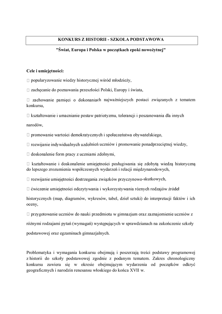 KONKURS Z HISTORII - SZKOŁA PODSTAWOWA "Świat, Europa i Polska w początkach epoki nowożytnej" Cele i umiejętności: popularyzowanie wiedzy historycznej wśród młodzieży, zachęcanie do poznawania przeszłości Polski, Europy i świata, ch najważniejszych postaci związanych z tematem konkursu, narodów, lnień uczniów i promowanie ponadprzeciętnej wiedzy, do lepszego zrozumienia współczesnych wydarzeń i relacji międzynarodowych, -skutkowych, historycznych (map, diagramów, wykresów, tabel, dzieł sztuki) do interpretacji faktów i ich oceny, różnymi rodzajami pytań (wymagań) występujących w sprawdzianach na zakończenie szkoły podstawowej oraz egzaminach gimnazjalnych. Problematyka i wymagania konkursu obejmują i poszerzają treści podstawy programowej z historii do szkoły podstawowej zgodnie z podanym tematem. Zakres chronologiczny konkursu zawiera się w okresie obejmującym wydarzenia od początków odkryć geograficznych i narodzin renesansu włoskiego do końca XVII w. Większość pytań konkursowych związanych będzie z historią Polski, ale uczestnicy powinni również wykazać się znajomością najważniejszych wydarzeń i postaci z zakresu historii powszechnej związanych z tematami podanych zagadnień. Na każdym etapie test sprawdzający wiedzę i umiejętności zawierać będzie różne typy zadań zamkniętych i otwartych. Uczestników kolejnych etapów konkursu obowiązują również zagadnienia z etapów wcześniejszych. Zagadnienia do etapu I: 1) Odkrycia geograficzne. - cywilizacje amerykańskie przed Kolumbem, - przyczyny, przebieg i skutki wielkich odkryć geograficznych, - polityczne następstwa wielkich odkryć, powstanie mocarstw kolonialnych. 2) Humanizm i odrodzenie w Europie. - literatura, sztuka i architektura epoki renesansu, - najwybitniejsi twórcy europejskiego renesansu. 3) Rozwój reformacji w Europie zachodniej. - główne wyznania reformacyjne i ich twórcy, - wojny religijne w Europie (we Francji i Niemczech) i ich skutki. 4) Kontrreformacja. - Kościół katolicki wobec reformacji (sobór trydencki i jego postanowienia). 5) Renesans w Polsce. - kultura, nauka, sztuka i architektura polskiego renesansu, - czołowi przedstawiciele polskiej literatury, nauki i sztuki renesansowej. 6) Reformacja w Polsce. -główne wyznania reformacyjne w Polsce, - Polska krajem tolerancji religijnej. 7) Demokracja szlachecka w Polsce. - ukształtowanie się parlamentaryzmu polskiego. - "Złota wolność szlachecka", rozwój przywilejów szlacheckich. Zagadnienia dodatkowe do etapu II i III: 1) Rządy ostatnich Jagiellonów na tronie polskim. - polityka wewnętrzna i zagraniczna (rozwiązanie problemu krzyżackiego, polityka morska Zygmunta Augusta), - gospodarka Polski "złotego wieku", - Unia Lubelska i powstanie Rzeczpospolitej Obojga Narodów (obszar, ludność i organizacja państwa). 2) Rzeczpospolita pod rządami pierwszych królów elekcyjnych. - pierwsze wolne elekcje i ich konsekwencje (Henryk Walezy, Stefan Batory, Zygmunt III Waza). 3) Wojny Rzeczpospolitej w XVII w. - wojny z Rosją, Szwecją i Turcją, - powstanie Chmielnickiego na Ukrainie, - wielcy hetmani Rzeczpospolitej, - siły zbrojne Rzeczpospolitej w XVII w. - skutki gospodarcze, polityczne i społeczne wojen. 4) Początki rządów oligarchii magnackiej w Polsce. - kryzys ustroju demokracji szlacheckiej i wzrost znaczenia magnaterii. - próby reform ustrojowych. 5) Kultura europejskiego baroku. - cechy charakterystyczne epoki, - najważniejsze dokonania w dziedzinie kultury, architektury i sztuki i ich autorzy. 6) Barok w Polsce. - ideologia polskiego baroku - sarmatyzm, - literatura, architektura i sztuka barokowa w Polsce. Zalecana literatura do I, II i III etapu: 1. Podręcznik do historii i społeczeństwa dla klasy 6 szkół podstawowych "Dzień dobry historio", Nowa Era, Warszawa 2011 r. 2. Ilustrowany atlas historii Polski, Wydawnictwo DEMART, Warszawa 2006 r. 3. Atlas Historyczny. Od starożytności do współczesności, Wydawnictwo PPWK 2000 r. 4. Encyklopedia szkolna. Historia, WSiP, Warszawa 2005 r. 5. J. Pilikowski, Szkolny Słownik Historii Polski, Wydawnictwo Zielona Sowa, Kraków 2001 r. 6. B. Snoch, Słownik Szkolny. Terminy i pojęcia historyczne, WSiP, Warszawa 1990 r. 7. R. Antosik, E. Pustuła, Historia. Vademecum. Egzamin Gimnazjalny 2012, Operon 2011 r. W wyżej wymienionych wydawnictwach encyklopedycznych obowiązują tylko hasła (pojęcia i postacie) związane z tematyką konkursu.