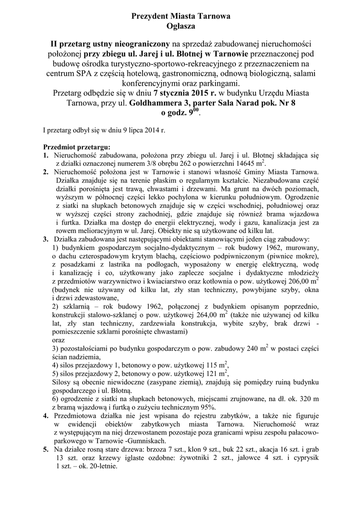 Prezydent Miasta Tarnowa Ogłasza II przetarg ustny nieograniczony na sprzedaż zabudowanej nieruchomości położonej przy zbiegu ul. Jarej i ul. Błotnej w Tarnowie przeznaczonej pod budowę ośrodka turystyczno-sportowo-rekreacyjnego z przeznaczeniem na centrum SPA z częścią hotelową, gastronomiczną, odnową biologiczną, salami konferencyjnymi oraz parkingami. Przetarg odbędzie się w dniu 7 stycznia 2015 r. w budynku Urzędu Miasta Tarnowa, przy ul. Goldhammera 3, parter Sala Narad pok. Nr 8 o godz. 900. I przetarg odbył się w dniu 9 lipca 2014 r. Przedmiot przetargu: 1. Nieruchomość zabudowana, położona przy zbiegu ul. Jarej i ul. Błotnej składająca się z działki oznaczonej numerem 3/8 obrębu 262 o powierzchni 14645 m2. 2. Nieruchomość położona jest w Tarnowie i stanowi własność Gminy Miasta Tarnowa. Działka znajduje się na terenie płaskim o regularnym kształcie. Niezabudowana część działki porośnięta jest trawą, chwastami i drzewami. Ma grunt na dwóch poziomach, wyższym w północnej części lekko pochylona w kierunku południowym. Ogrodzenie z siatki na słupkach betonowych znajduje się w części wschodniej, południowej oraz w wyższej części strony zachodniej, gdzie znajduje się również brama wjazdowa i furtka. Działka ma dostęp do energii elektrycznej, wody i gazu, kanalizacja jest za rowem melioracyjnym w ul. Jarej. Obiekty nie są użytkowane od kilku lat. 3. Działka zabudowana jest następującymi obiektami stanowiącymi jeden ciąg zabudowy: 1) budynkiem gospodarczym socjalno-dydaktycznym – rok budowy 1962, murowany, o dachu czterospadowym krytym blachą, częściowo podpiwniczonym (piwnice mokre), z posadzkami z lastrika na podłogach, wyposażony w energię elektryczną, wodę i kanalizację i co, użytkowany jako zaplecze socjalne i dydaktyczne młodzieży z przedmiotów warzywnictwo i kwiaciarstwo oraz kotłownia o pow. użytkowej 206,00 m2 (budynek nie używany od kilku lat, zły stan techniczny, powybijane szyby, okna i drzwi zdewastowane, 2) szklarnią – rok budowy 1962, połączonej z budynkiem opisanym poprzednio, konstrukcji stalowo-szklanej o pow. użytkowej 264,00 m2 (także nie używanej od kilku lat, zły stan techniczny, zardzewiała konstrukcja, wybite szyby, brak drzwi pomieszczenie szklarni porośnięte chwastami) oraz 3) pozostałościami po budynku gospodarczym o pow. zabudowy 240 m2 w postaci części ścian nadziemia, 4) silos przejazdowy 1, betonowy o pow. użytkowej 115 m2, 5) silos przejazdowy 2, betonowy o pow. użytkowej 121 m2, Silosy są obecnie niewidoczne (zasypane ziemią), znajdują się pomiędzy ruiną budynku gospodarczego i ul. Błotną. 6) ogrodzenie z siatki na słupkach betonowych, miejscami zrujnowane, na dł. ok. 320 m z bramą wjazdową i furtką o zużyciu technicznym 95%. 4. Przedmiotowa działka nie jest wpisana do rejestru zabytków, a także nie figuruje w ewidencji obiektów zabytkowych miasta Tarnowa. Nieruchomość wraz z występującym na niej drzewostanem pozostaje poza granicami wpisu zespołu pałacowoparkowego w Tarnowie -Gumniskach. 5. Na działce rosną stare drzewa: brzoza 7 szt., klon 9 szt., buk 22 szt., akacja 16 szt. i grab 13 szt. oraz krzewy iglaste ozdobne: żywotniki 2 szt., jałowce 4 szt. i cyprysik 1 szt. – ok. 20-letnie. 6. Działka nr 3/8 obrębu 262 objęta jest księgą wieczystą TR1T/00096869/4 prowadzoną przez Sąd Rejonowy w Tarnowie. 7. Na terenie obejmującym przedmiotową nieruchomość brak jest miejscowego planu zagospodarowania przestrzennego. Zgodnie z decyzją Wójta Gminy Tarnów nr 179/2013 z dnia 26 września 2013 r. została wydana decyzja o warunkach zabudowy, na budowę ośrodka turystyczno – sportowo – rekreacyjnego z przeznaczeniem na centrum SPA z częścią hotelową, gastronomiczną, odnową biologiczną, salami konferencyjnymi oraz parkingami. 8. Termin do złożenia wniosku osobom, którym przysługuje pierwszeństwo w nabyciu nieruchomości na podstawie art. 34 ust.1 pkt 1 pkt 2 ustawy z dnia 21 sierpnia 1997 r. o gospodarce nieruchomościami upłynął w dniu 05.05.2014 r. 9. Nieruchomość jest wolna od obciążeń i nie stanowi przedmiotu żadnych zobowiązań. Warunki przetargu: Cena wywoławcza dla nieruchomości wynosi: 3 000 000 zł (słownie: trzy miliony złotych). Nieruchomość zwolniona z podatku od towarów i usług. W przetargu mogą brać udział osoby fizyczne i prawne, które wpłacą wadium w pieniądzu w wysokości 450 000 zł (słownie: czterysta pięćdziesiąt tysięcy złotych) na konto Urzędu Miasta Tarnowa Bank Handlowy w Warszawie Oddział w Rzeszowie Nr 76 1030 1250 0000 0000 8800 0099 w taki sposób, aby najpóźniej w dniu 30 grudnia 2014 roku wadium znajdowało się na rachunku bankowym organizującego przetarg ustny nieograniczony. Za dokonanie wpłaty uważa się dzień wpływu środków pieniężnych na rachunek bankowy tut. Urzędu. 1. Wadium wpłacone przez uczestników przetargu po zakończeniu przetargu zostanie niezwłocznie zwrócone na konto oferenta. 2. Wadium wpłacone przez uczestnika, który przetarg wygrał, zalicza się na poczet ceny nabycia nieruchomości w dniu zapłaty pełnej ceny należności. 3. Wadium wpłacone przez uczestnika, który przetarg wygrał ulega przepadkowi w razie uchylenia się uczestnika od zawarcia umowy. 4. Minimalne postąpienie wynosi 1 % ceny wywoławczej z zaokrągleniem wzwyż do pełnych dziesiątek złotych tj. kwotę 30 000 zł. 5. Przetarg będzie ważny bez względu na liczbę uczestników przetargu, a rozstrzygnięcie jego pozytywne, jeżeli przynajmniej jeden uczestnik zaoferuje co najmniej jedno postąpienie powyżej ceny wywoławczej. 6. Cena nieruchomości uzyskana w przetargu podlega zapłacie przez kupującego w taki sposób, aby najpóźniej na trzy dni przed zawarciem umowy notarialnej znajdowały się na rachunku bankowym organizującego przetarg ustny nieograniczony. 7. Przetarg ustny ma na celu uzyskanie najwyższej ceny. 