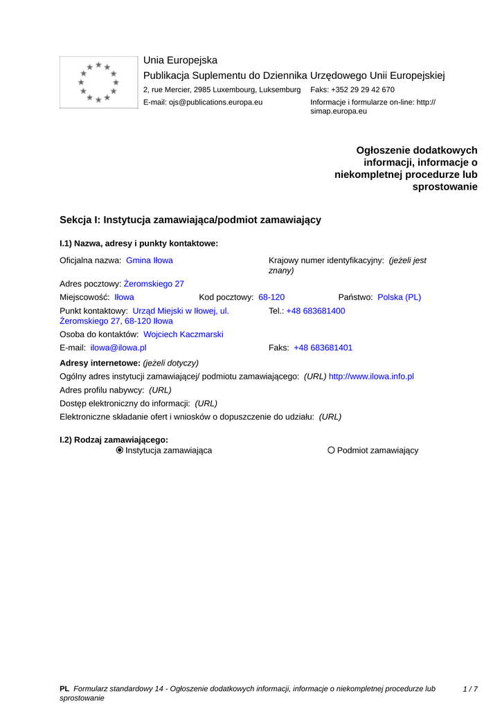 Unia Europejska Publikacja Suplementu do Dziennika Urzędowego Unii Europejskiej 2, rue Mercier, 2985 Luxembourg, Luksemburg Faks: +352 29 29 42 670 E-mail: [email protected] Informacje i formularze on-line: http:// simap.europa.eu Ogłoszenie dodatkowych informacji, informacje o niekompletnej procedurze lub sprostowanie Sekcja I: Instytucja zamawiająca/podmiot zamawiający I.1) Nazwa, adresy i punkty kontaktowe: Krajowy numer identyfikacyjny: (jeżeli jest znany) _____ Oficjalna nazwa: Gmina Iłowa Adres pocztowy: Żeromskiego 27 Miejscowość: Iłowa Kod pocztowy: 68-120 Punkt kontaktowy: Urząd Miejski w Iłowej, ul. Żeromskiego 27, 68-120 Iłowa Państwo: Polska (PL) Tel.: +48 683681400 Osoba do kontaktów: Wojciech Kaczmarski E-mail: [email protected] Faks: +48 683681401 Adresy internetowe: (jeżeli dotyczy) Ogólny adres instytucji zamawiającej/ podmiotu zamawiającego: (URL) http://www.ilowa.info.pl Adres profilu nabywcy: (URL) _____ Dostęp elektroniczny do informacji: (URL) _____ Elektroniczne składanie ofert i wniosków o dopuszczenie do udziału: (URL) _____ I.2) Rodzaj zamawiającego: Instytucja zamawiająca Podmiot zamawiający PL Formularz standardowy 14 - Ogłoszenie dodatkowych informacji, informacje o niekompletnej procedurze lub sprostowanie 1/7 Sekcja II: Przedmiot zamówienia II.1.1) Nazwa nadana zamówieniu: Usługi związane z odbiorem i zagospodarowaniem odpadów komunalnych od właścicieli nieruchomości zamieszkałych na terenie Gminy Iłowa II.1.2) Krótki opis zamówienia lub zakupu: (podano w pierwotnym ogłoszeniu) Przedmiotem zamówienia jest usługa związana z odbiorem i zagospodarowaniem odpadów komunalnych od właścicieli nieruchomości zamieszkałych oraz prowadzenie punku selektywnej zbiórki odpadów na terenu gminy Iłowa. Przedmiot mowy ma być realizowany z zachowaniem harmonogramu i sposobu określonego w Uchwale 86/7/ XVI/15 Rady Miejskiej w Iłowej z dnia 1 grudnia 2015r. w sprawie uchwalenia regulaminu utrzymania czystości i porządku na terenie Gminy Iłowa, uchwale 113/7/XIX/16 Rady Miejskiej w Iłowej z dnia 9 lutego 2016 r. w sprawie szczegółowego sposobu i zakresu świadczenia usług w zakresie odbierania odpadów komunalnych od właścicieli nieruchomości i zagospodarowania tych odpadów, oraz pozostałych przepisów prawa. Przedmiot zamówienia obejmuje: a) wyposażenie obsługiwanych nieruchomości w pojemnik/pojemniki na odpady zmieszane lub w pojemnik/ pojemniki i worek/worki z tworzyw sztucznych do selektywnej zbiórki odpadów w kolorach zgodnych z wymogami unijnymi w terminie do 31.12.2016r. Obowiązek mycia i dezynfekcji pojemników ustawionych na nieruchomościach spoczywa na Wykonawcy. b) transport odpadów zebranych z zamieszkałych nieruchomości bądź z punktu selektywnego zbierania odpadów komunalnych: - podlegających selektywnej zbiórce: do instalacji odzysku i unieszkodliwiania odpadów, - zmieszanych odpadów komunalnych, odpadów zielonych: do regionalnych instalacji do przetwarzania odpadów komunalnych (bądź instalacji zastępczych) regionu gospodarki odpadami komunalnymi. Zgodnie z Planem gospodarki odpadami dla województwa lubuskiego (Uchwała nr XXX/281/12 Sejmiku Województwa Lubuskiego z dnia 19 grudnia 2012 w sprawie wykonania Planu gospodarki odpadami dla województwa lubuskiego na lata 2012-2017 z perspektywą do 2020r. – Dz. Urz. Woj. Lubuskiego z 2012r. poz. 1835 i 2866 oraz z 2015r. poz. 301) regionalną instalację do mechaniczno-biologicznego przetwarzania odpadów komunalnych stanowi Zakład Zagospodarowania Odpadów Sp. z o.o. Marszów 50a, 68-200 Żary. Zamawiający wymaga, aby odbiorowi odpadów podlegały odpady zebrane selektywnie wymienione w art. 3 ust. 2 pkt 5 ustawy o utrzymaniu czystości i porządku w gminach a także: - odpady zielone, - przeterminowane leki i chemikalia, - zużyte baterie i akumulatory, - zużyty sprzęt elektryczny i elektroniczny, - meble i inne odpady wielkogabarytowe, - odpady budowlane i rozbiórkowe, - zużyte opony oraz zmieszane odpady komunalne i pozostałości z sortowania przeznaczone do składowania. Przybliżona liczba mieszkańców, która powinna być objęta systemem to 5659 osób. (wg danych uzyskanych na podstawie złożonych deklaracji stan na koniec czerwca 2016r). Ilość wytworzonych odpadów komunalnych na terenie gminy (dane ze sprawozdania za 2015r.): - odpady komunalne - 1363,3 Mg/rok - odpady zebrane selektywnie – 210,7 Mg/rok - odpady wielkogabarytowe – 51,2 Mg/rok Łączna ilość odpadów komunalnych odebranych od właścicieli nieruchomości w 2015r. – 1625,2 Mg/rok. Ilość wytworzonych na terenie Gminy Iłowa odpadów nie jest zależna od Zamawiającego. Ustalone ilości są szacunkowe i mogą ulec zmianie stosownie do rzeczywistych potrzeb Zamawiającego uwzględniając ilość PL Formularz standardowy 14 - Ogłoszenie dodatkowych informacji, informacje o niekompletnej procedurze lub sprostowanie 2/7 odpadów wytworzonych przez producentów. Szacunkowa ilość odpadów przewidzianych do odbioru i transportu wynosi 1625,2 Mg/12 miesięcy. Podane wyżej ilości odpadów należy traktować jako orientacyjne i Wykonawcy nie przysługuje prawo dodatkowego wynagrodzenia i/lub odszkodowania za osiągnięcie innych wielkości. Wykonawca winien obliczyć cenę w oparciu o wszystkie dostępne informacje oraz sprawdzić charakterystykę terenową, gęstość zabudowy, odległości pomiędzy miejscowościami na terenie Gminy Iłowa. Wykaz nieruchomości, z których przewiduje się odbieranie odpadów komunalnych stanowi załącznik nr 8 do SIWZ Szczegółowy wykazy nieruchomości wraz z liczbą mieszkańców zamieszkujących daną nieruchomość będą przekazywane Wykonawcy w toku realizacji umowy (zamówienia). Powyższe dane mogą ulec zmianie na skutek ruchu ludności. c) wyposażenie oraz prowadzenie punktu selektywnej zbiórki odpadów w miejscu wskazanym przez Zamawiającego, na zasadach określonych w załączniku do uch