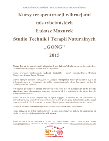 www.studiogong.szczecin.pl · www.gongstands.eu · www.nepalshop.pl Kursy terapeutyzacji wibracjami mis tybetańskich Łukasz Mazurek Studio Technik i Terapii Naturalnych „GONG” 2015 Nasze kursy terapeutyzacji wibracjami mis tybetańskich bazują na bezpośrednim przekazie zaczerpniętym od terapeutów nepalskich. Kursy prowadzi fizjoterapeuta Łukasz Mazurek - uczeń mistrzów Shree Krishna Shahi oraz Shanta Ratna Shakya. Wbrew różnym opiniom, panującym w Europie, dźwiękowe misy tybetańskie były i są wykorzystywane w Himalajach do celów terapeutycznych, choć faktycznie wiedzę tę posiadają bardzo nieliczni. Himalajskie podejście w bardzo znaczny sposób różni się od europejskich szkół masażu dźwiękiem mis tybetańskich, zarówno mentalnie jak i w odniesieniu do samej techniki wykonywania masażu. Nabór na nasze kursy odbywa się w trybie ciągłym, a terminy są tak dobierane by satysfakcjonowały wszystkich uczestników. Niewielka grupa, przy dużej liczbie godzin zajęć praktycznych (ok. 15 h), pozwala na pewne i bezstresowe opanowanie poznanych metod. Uczestnicy szkolenia otrzymują dwujęzyczne (polsko-angielskie) certyfikaty. Kursy odbywają się trybie weekendowym - 2 pełne dni z reguły od soboty do niedzieli lub od piątku do soboty - w Szczecinie lub w Krakowie. Studio Technik i Terapii Naturalnych “GONG”, ul. Szymanowskiego 18c/1, 71-416 Szczecin. E-mail: [email protected], telefon: + 48-691279923, +48-914226942, facebook: https://www.fb.com/NepalShopPL Terminy kursów w 2015 r.: SZCZECIN: 30-31 maja 2015 r. - kurs II stopnia - Szczecin - organizator STiTN "GONG" - e-mail: [email protected], tel. 691 279923 13-14 czerwca 2015 r. - kurs I stopnia - Szczecin - organizator STiTN "GONG" - e-mail: [email protected], tel. 691 279923 KRAKÓW: 14-15 lutego 2015 r. - kurs II stopnia - Kraków - organizator Izabela Paletko: strona www, tel. 796 871888 18-19 kwietnia 2015 r. - kurs III stopnia - Kraków - organizator Izabela Paletko: strona www, tel. 796 871888 3-4 października 2015 r. - kurs I stopnia - Kraków - organizator Izabela Paletko: strona www, tel. 796 871888 Cena kursu: 600,00 zł brutto (wystawiamy faktury VAT). Cena nie obejmuje zakwaterowania i wyżywienia. Niezwłocznie, tj. w ciągu 3 dni, od zgłoszenia rezerwacji, wymagana jest wpłata zaliczki (dot. tylko kursu w Szczecinie) w wysokości 50% tj. 300,00 zł na konto: Alior Bank 97 2490 0005 0000 4500 6966 2868 Studio Technik i Terapii Naturalnych "Gong" Łukasz Mazurek ul. Szymanowskiego 18c/1, 71-416 Szczecin tytuł przelewu: imię i nazwisko kursanta, misy - kurs (I, II lub III) stopnia Szczecin Uwaga! Studio Technik i Terapii Naturalnych "GONG" Łukasz Mazurek przyjmuje wpłaty jedynie na kursy odbywające się w Szczecinie. W sprawie kursów odbywających się w Krakowie proszę kontaktować się z organizatorem Panią Izabelą Paletko - e-mail:[email protected], tel. 796 871888. Uwaga! Potwierdzenie rezerwacji na wzięcie udziału w kursie nastąpi tylko po wpłacie zaliczki. Ze względu na ograniczoną ilość miejsc, zaliczka jest bezzwrotna. Jeżeli kurs zostanie odwołany (ze względów technicznych, bądź z powodu za małej ilości rezerwacji) zaliczka oczywiście zostanie zwrócona w całości. Przed wpłaceniem zaliczki - wyślij e-mail, aby zarezerwować miejsce na najbliższy termin kursu. Po wpłaceniu zaliczki - wyślij e-mail z informacją o wpłacie oraz swoimi danymi i nr telefonu. Kurs I stopnia - techniki podstawowe o o o o o o o o o o o o o o anatomiczne i fizjologiczne uwarunkowania skutecznej terapii wibracjami akustycznymi tybetańskich mis dźwiękowych geneza i kulturowe osadzenie mis dźwiękowych w regionie Himalajów technika wytwarzania i rodzaje mis dźwiękowych, skład stopu, przyporządkowanie energii poszczególnych metali, planet i tonów - czakrom w systemie wedyjskim i himalajskim jak wybrać misę dźwiękową na własny użytek, jak skompletować zestaw; ocena jakości mis dźwiękowych; ABC przechowywania, transportu i konserwacji mis techniki emisji dźwięku przy wykorzystaniu mis dźwiękowych oraz innych tradycyjnych, terapeutycznych instrumentów Nepalu BHP masażu dźwiękiem; wskazania i przeciwwskazania; etyka wykorzystanie misy w medytacji indywidualnej osobisty rytuał ochronny i oczyszczający (również jako element terapii przeciwmigrenowej) z zastosowaniem misy dźwiękowej technika oczyszczania pomieszczeń i gospodarstw z wykorzystaniem misy dźwiękowej technika regulacji czakr/y z użyciem misy i mantr nasiennych technika uzdrawiającej komory dźwiękowej wg Mistrza Dorje Thingo z Kimathanka (jako autoterapia oraz z asystą terapeuty) autoterapia w obszarze podbrzusza techniki terapeutyczne dla stóp (jako autoterapia oraz z asystą terapeuty) kompleksowe terapie z wykorzystaniem mis: a) terapia relaksacyjna jako terapia podstawowa oraz wprowadzająca b) terapia równoważąca (szczególnie polecana w uzależnieniach, przy zmiennym ciśnieniu, w stanach depresyjnych) c) terapia dolegliwości kręgosłupa z wykorzystaniem wody Kurs II stopnia - techniki celowane Kompleksowe terapie z wykorzystaniem mis: o czakroterapia z wykorzystaniem wody o terapia przeciwstresowa i przeciwdepresyjna o terapia w stanach agresji, złości, przy wysokim ciśnieniu tętniczym, w stanach reumatycznych o terapia w zaburzeniach słuchu o zastosowanie odlewanych mis dźwiękowych z 5 metali w niektórych wcześniej poznanych terapiach o inne zastosowania tybetańskich mis dźwiękowych Kurs III stopnia - zaawansowane techniki - praca intuicyjna i zachowawcza o o o o o o o o autoterapia z wykorzystaniem gorących mis masaż całego ciała za pomocą (bardzo) gorących mis znajdowanie blokad energetycznych (z wykorzystaniem mis) tybetańską techniką przymkniętych powiek usuwanie blokad systemem księżycowym (system 100 technik) techniki gry na tingsh'ach w medytacji nauka wykonywania niestandardowych akcesoriów do gry na misach technika emisji 1