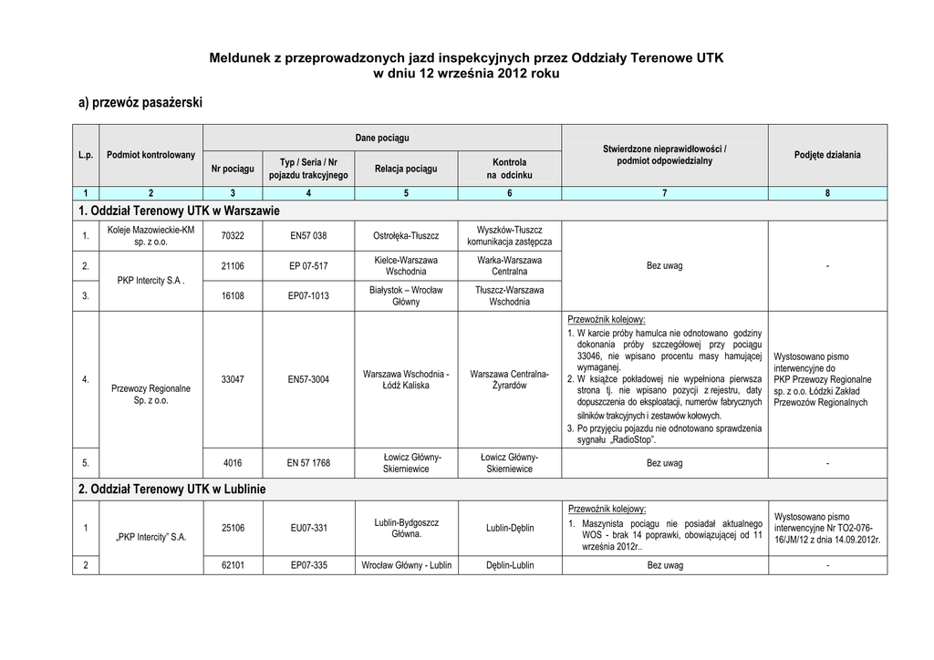 Meldunek z przeprowadzonych jazd inspekcyjnych przez Oddziały Terenowe UTK w dniu 12 września 2012 roku a) przewóz pasaŜerski Dane pociągu L.p. 1 Podmiot kontrolowany 2 Nr pociągu Typ / Seria / Nr pojazdu trakcyjnego Relacja pociągu Kontrola na odcinku 3 4 5 6 70322 EN57 038 Ostrołęka-Tłuszcz Wyszków-Tłuszcz komunikacja zastępcza 21106 EP 07-517 Kielce-Warszawa Wschodnia Warka-Warszawa Centralna 16108 EP07-1013 Białystok – Wrocław Główny Tłuszcz-Warszawa Wschodnia Stwierdzone nieprawidłowości / podmiot odpowiedzialny Podjęte działania 7 8 Bez uwag - 1. Oddział Terenowy UTK w Warszawie 1. Koleje Mazowieckie-KM sp. z o.o. 2. PKP Intercity S.A . 3. 4. Przewozy Regionalne Sp. z o.o. 5. Warszawa Centralnaśyrardów Przewoźnik kolejowy: 1. W karcie próby hamulca nie odnotowano godziny dokonania próby szczegółowej przy pociągu 33046, nie wpisano procentu masy hamującej wymaganej. 2. W ksiąŜce pokładowej nie wypełniona pierwsza strona tj. nie wpisano pozycji z rejestru, daty dopuszczenia do eksploatacji, numerów fabrycznych silników trakcyjnych i zestawów kołowych. 3. Po przyjęciu pojazdu nie odnotowano sprawdzenia sygnału „RadioStop”. Łowicz GłównySkierniewice Bez uwag - EU07-331 Lublin-Bydgoszcz Główna. Lublin-Dęblin Przewoźnik kolejowy: 1. Maszynista pociągu nie posiadał aktualnego WOS - brak 14 poprawki, obowiązującej od 11 września 2012r.. Wystosowano pismo interwencyjne Nr TO2-07616/JM/12 z dnia 14.09.2012r. EP07-335 Wrocław Główny - Lublin Dęblin-Lublin Bez uwag - Warszawa Wschodnia Łódź Kaliska 33047 EN57-3004 4016 EN 57 1768 Łowicz GłównySkierniewice 25106 62101 Wystosowano pismo interwencyjne do PKP Przewozy Regionalne sp. z o.o. Łódzki Zakład Przewozów Regionalnych 2. Oddział Terenowy UTK w Lublinie 1 2 „PKP Intercity” S.A. 1 2 3 3 4 115 EN57AL-3010 5 6 7 Lublin-Rejowiec Przewoźnik kolejowy: 1. Maszynista pociągu nie posiadał aktualnego WOS - brak 14 poprawki, obowiązującej od 11 września 2012r.. Wystosowano Pismo interwencyjne Nr TO2-07617/JM/12 z dnia 14.09.2012r. Zamość - Lublin Rejowiec-Lublin Przewoźnik kolejowy: 1. Maszynista pociągu nie posiadał aktualnego WOS - brak 14 poprawki, obowiązującej od 11 września 2012r. Wystosowano pismo interwencyjne Nr TO2-07617/JM/12 z dnia 14.09.2012r. Dęblin-Radom Dęblin - Radom Radom-Dęblin Radom - Dęblin Lublin - Chełm Przewozy Regionalne Sp. z o. o. 4 5 6 234 „Koleje MazowieckieKM” Sp. z o.o. SA 134 - 018 527 EN57 1813 528 Bez uwag 8 - 3. Oddział Terenowy UTK w Krakowie 1 3426 EN57- 1420/5B- 6B5B /Brak EVN Kraków Gł. - Katowice Kraków Gł. - Trzebinia Zarządca Infrastruktury: 1. wygaśnięcie sem. wyj. ze st. Kraków Mydlniki jazda na sygnat zastępczy. 2 4327 EN57- 635/5B-6B5B/Brak EVN Katowice - Kraków Gł. Trzebinia- Kraków Gł. Przewoźnik kolejowy: 1. wjazd do st. Mydniki na opuszczonym pantografie. 33121 EN77- 001/32WE/ Brak EVN Zakopane - Kraków Gł. Kraków Pt. - Sucha Beskidzka Przewoźnik kolejowy: 1. brak lewego lusterka w ezt. 5806 EN57- 1075/5B- 6B5B/Brak EVN Kraków Gł. - Zakopane Sucha Beskidzka Kraków Pt. Zarządca Infrastruktury: 1. niewidoczny sem. W km 10.300 - zarośla, 2. opadnięta tablica hektometryczna w km 11.200. TLK 38108 EU07-077/ Brak EVN Kraków Gł. - Kołobrzeg Kraków Gł.- Tunel Zarządca Infrastruktury: 1. jazda na sygnał zastępczy na stacji Niedźwiedź 2. zarośla wchodzące w skrajnię. TLK 23100 EU07-173/ Brak EVN Lublin - Kraków Gł. Tunel- Kraków Gł. Zarządca Infrastruktury: 1. jazda na sygnał zastępczy na stacji Niedźwiedź 2. zarośla wchodzące w skrajnię. Bielsko Biała Gł. Katowice Zarządca infrastruktury: 1. niewidoczny semafor wjazdowy do st. Pszczyna (szpaler drzew), 2. brak wskaźnika W9 w km. 4,600 3. niewłaściwa lokalizacja SHP w st. Tychy 3 Przewozy Regionalne Sp. z o.o. 4 5 PKP Intercity S.A. 6 Wystosowano pismo do zarządcy infrastruktury, polecające usunięcie stwierdzonych nieprawidłowości Wystosowano pismo do przewoźnika polecające usunięcie stwierdzonych nieprawidłowości 4. Oddział Terenowy UTK w Katowicach 1 PKP Intercity S.A. 4112 EP08-12 Bielsko Biała Gł. Warszawa Wsch. 2 Przewozy Regionalne sp. z o.o. 423 EN57-997 Katowice - Zwardoń Katowice - Bielsko Biała Gł. Bez uwag Wystosowano pismo do zarządcy infrastruktury, polecające usunięcie stwierdzonych nieprawidłowości - 2 1 2 3 4 5 6 7 8 5. Oddział Terenowy UTK w Gdańsku 1 85102 EP 07 - 338 Szczecin Gł. – Olsztyn Gł. Odcinek Gdańsk Gł. Tczew Przewoźnik kolejowy: 1. brak w Wykazie OstrzeŜeń Stałych poprawki nr 14 z 7. 9. 2012 r. Nr 83108 EU 07-355 Kołobrzeg - Kraków Gdynia – Gdańsk, Gdańsk - Tczew Bez uwag PKP Intercity S.A. 2 3 1126 Zastępcza komunikacja autobusowa Bydgoszcz Główna .ChełmŜa ChełmŜa Bydgoszcz Główna. Przewoźnik kolejowy: 1. brak właściwego sposobu wykonywania autobusowej komunikacji zastępczej . 2. obsługa przewoźnika kolejowego i kierowca autobusu nie zna topografii miasta Bydgoszcz i terenów wokół linii kolejowej nr 209 w wyniku czego nie dojeŜdŜa do wszystkich przystanków kolejowych. 3. błędnie podana ulica przy której podstawiono autobus komunikacji zastępczej. 4. brak widocznego logo przewoźnika. Wystosowano pismo interwencyjne do Arriva RP Sp.z o.o. Biuro w Toruniu nr TO5-521a-89/PK/12/863 ChełmŜa Bydgoszcz Główna. Przewoźnik kolejowy: 1. wykaz pracy maszynisty i pojazdu trakcyjnego nr 316 godzina rozpoczęcia pracy 3.50. W chwili kontroli rozpisane czas pracy do godziny 13.18 Wykaz OstrzeŜeń Stałych: stan nieaktualny 9 naniesionych poprawek , ostatnia z 14.08.2012, brak poprawek nr 11,12,13 i 14 Zarządca Infrastruktury: 1. na ławach torowiska ze strony lewej i prawej rosnące chwasty, krzewy i gałęzie drzew utrudniają obserwację szlaku, w tym przejazdów kolejowych, a takŜe ograniczają widoczność wskaźników i sygnałów ustawionych wzdłuŜ linii 207 Brodnica-Bydgoszcz Pismo interwencyjne do Arriva RP Sp. 