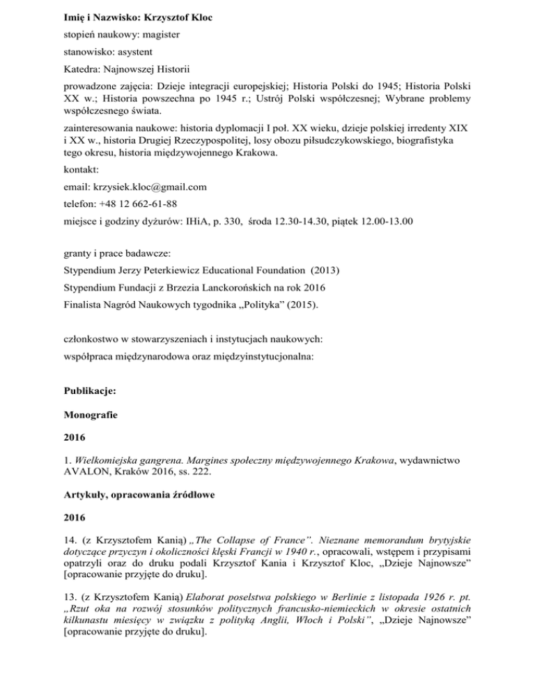 Imię i Nazwisko: Krzysztof Kloc stopień naukowy: magister stanowisko: asystent Katedra: Najnowszej Historii prowadzone zajęcia: Dzieje integracji europejskiej; Historia Polski do 1945; Historia Polski XX w.; Historia powszechna po 1945 r.; Ustrój Polski współczesnej; Wybrane problemy współczesnego świata. zainteresowania naukowe: historia dyplomacji I poł. XX wieku, dzieje polskiej irredenty XIX i XX w., historia Drugiej Rzeczypospolitej, losy obozu piłsudczykowskiego, biografistyka tego okresu, historia międzywojennego Krakowa. kontakt: email: [email protected] telefon: +48 12 662-61-88 miejsce i godziny dyżurów: IHiA, p. 330, środa 12.30-14.30, piątek 12.00-13.00 granty i prace badawcze: Stypendium Jerzy Peterkiewicz Educational Foundation (2013) Stypendium Fundacji z Brzezia Lanckorońskich na rok 2016 Finalista Nagród Naukowych tygodnika „Polityka” (2015). członkostwo w stowarzyszeniach i instytucjach naukowych: współpraca międzynarodowa oraz międzyinstytucjonalna: Publikacje: Monografie 2016 1. Wielkomiejska gangrena. Margines społeczny międzywojennego Krakowa, wydawnictwo AVALON, Kraków 2016, ss. 222. Artykuły, opracowania źródłowe 2016 14. (z Krzysztofem Kanią) „The Collapse of France”. Nieznane memorandum brytyjskie dotyczące przyczyn i okoliczności klęski Francji w 1940 r., opracowali, wstępem i przypisami opatrzyli oraz do druku podali Krzysztof Kania i Krzysztof Kloc, „Dzieje Najnowsze” [opracowanie przyjęte do druku]. 13. (z Krzysztofem Kanią) Elaborat poselstwa polskiego w Berlinie z listopada 1926 r. pt. „Rzut oka na rozwój stosunków politycznych francusko-niemieckich w okresie ostatnich kilkunastu miesięcy w związku z polityką Anglii, Włoch i Polski”, „Dzieje Najnowsze” [opracowanie przyjęte do druku]. 12. Przygotowania i uroczystości pogrzebowe Pierwszego Marszałka Polski Józefa Piłsudskiego w Krakowie 18 maja 1935 r., [w:] Józef Piłsudski. Człowiek, żołnierz, polityk, red. Z. Girzyński, J. Kłaczkow, Toruń 2016, s. 133-144. 2015 11. Unemployment in Inter-war Cracow and the Great Economic Crisis: Conditions, Consequences and Couneraction, „Remembrance and Solidarity Studies in 20th Century European History” 2015, vol. 4, s. 47-68. 10. Gra pamięcią, czy gra o pamięć? „Polityka pamięci” obozu piłsudczykowskiego w okresie Drugiej Rzeczypospolitej. Zarys problematyki, [w:] Pamięć człowieka – pamięć miejsca – miejsca pamięci, red. B. Popiołek, A. Chłosta-Sikorska, A. Słaby, Kraków 2015, s. 83-94. 9. Protokół z przesłuchania majora Franciszka Sarnka, dyrektora technicznego firmy „Protekta” z dnia 2 października 1926 r. Przyczynek do sprawy generała Michała Żymierskiego, opracował i do druku podał Krzysztof Kloc, „Niepodległość” (Warszawa) 2015, t. LXIV, s. 279-290. 8. Michał Sokolnicki – współpracownik londyńskich „Wiadomości” Mieczysława Grydzewskiego 1946-1963, „Archiwum Emigracji” 2013 [druk: 2015], nr 19, z. 2, s. 29-47. 7. Przestępczość na tle seksualnym w przedwojennym Krakowie 1918-1939, [w:] Ciało, Seksualność, Pornografia – kontekst historyczny, red. P. Jędrzejewski, K. Szlęzak, G. Szuster, Kraków 2015, s. 128-143. 2014 6. Prostytucja w Krakowie międzywojennym, „Klio. Czasopismo poświęcone dziejom Polski i powszechnym” 2014, t. 31, z. 4, s. 87-129. 5. Z dziejów krakowskiego marginesu społecznego: pijaństwo, awanturnictwo i wandalizm w Krakowie 1918-1939, „Zeszyty Naukowe Uniwersytetu Jagiellońskiego” 2014, Prace Historyczne, t. 141, z. 3, s. 701-718. 4. Michał Sokolnicki. Portret ambasadora Rzeczypospolitej Polskiej w Turcji (1936-1945), „Niepodległość” (Warszawa) 2014, t. LXIII, s. 247-262. 2013 3. Przyjazd Naczelnika Państwa i Naczelnego Wodza do Krakowa w dniu 5. sierpnia 1922, opracował oraz wstępem i przypisami opatrzył Krzysztof Kloc, „Niepodległość” (Warszawa) 2013, t. LXII, s. 273-286. 2012 2. Konserwatyści krakowscy wobec sporów niepodległościowych w latach 1918-1926, „Pro Fide Rege et Lege” 2012/2013, nr 70, s. 211-227. 2011 1.Marksistowskie interpretacje, czyli II Rzeczpospolita oczami Polski Ludowej, [w:] Materiały z sesji studenckiej – Konferencja „Janusz Kurtyka. Rzeczypospolitej historyk i urzędnik”, red. P. Wiater, Kraków 2011, s. 43-55. Artykuły recenzyjne i recenzje 2016 5. (z Krzysztofem Kanią) Druga strona sojuszu. Ale jakiego? Garść uwag i refleksji na temat najnowszej książki Anny Zapalec, „Res Gestae” 2016, nr 2 [artykuł recenzyjny złożony do druku] 2015 4. Generała pomnik ze spiżu… Uwagi i refleksje na marginesie lektury biografii Juliana Stachiewicza, „Dzieje Najnowsze” 2015, nr 4, s. 183-192. 3. [rec.] M. A. Peszke, Polskie Siły Zbrojne na Zachodzie 1939-1946. Koncepcje strategiczne i realia geopolityki, Poznań 2014, „Res Gestae” 2015, nr 1, s. 374-381. 2. [rec.] K. Kania, Edward Bernard Raczyński 1891-1993. Dyplomata i polityk, Warszawa 2014, „Dzieje Najnowsze” 2015, nr 1, s. 267-274. 2014 1. [rec.] J. Cisek, Granice Rzeczypospolitej i konflikt polsko-bolszewicki w świetle amerykańskich raportów dyplomatycznych i wojskowych 1919-1921, Kraków 2012, „Dzieje Najnowsze” 2014, nr 4, s. 157-163. Teksty popularnonaukowe 5. Premiera Sławoja Felicjana Składkowskiego potyczki z rzeczywistością, „Konspekt” (Kraków) 2014, nr 4/53, s. 95-98. 4. Kto piłsudczykom po zamachu majowym kampanię wyborczą BBWR w dębickiem robił, „Obserwator Lokalny” (Dębica) 2014, nr 46, s. XXVII. 3. Etos powstania styczniowego a polityka obozu piłsudczyków na łamach prasy krakowskiej, „Konspekt” (Kraków) 2013, nr 4/49, s. 1-5. 2. „Nędza, zbrodnia i moralna gangrena”. Kilka słów o marginesie społecznym w międzywojennym Krakowie, „Konspekt” (Kraków) 2013, nr 1/46, s. 93-96. 1. Moralizatorstwo i dydaktyka w starym krakowskim wydaniu, czyli Michał Bobrzyński a spory niepodległościowe po 1918 roku, „Ko