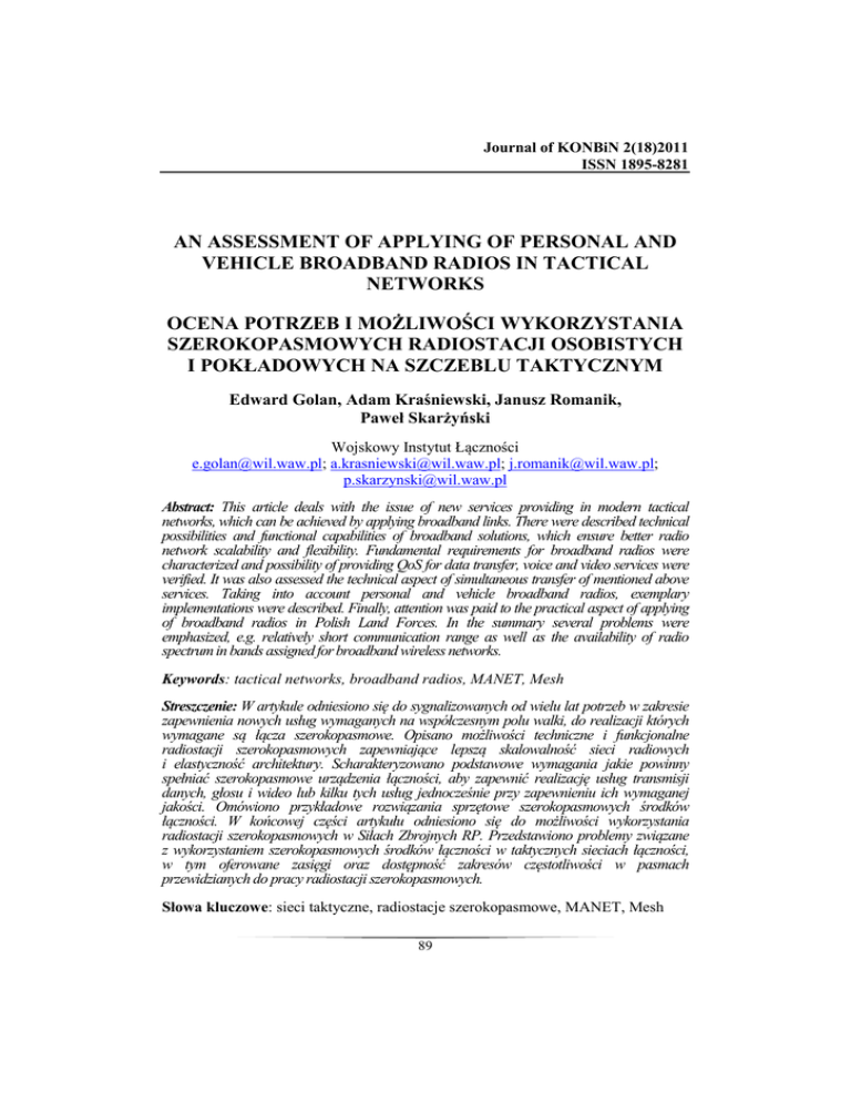 Journal of KONBiN 2(18)2011 ISSN 1895-8281 AN ASSESSMENT OF APPLYING OF PERSONAL AND VEHICLE BROADBAND RADIOS IN TACTICAL NETWORKS OCENA POTRZEB I MOŻLIWOŚCI WYKORZYSTANIA SZEROKOPASMOWYCH RADIOSTACJI OSOBISTYCH I POKŁADOWYCH NA SZCZEBLU TAKTYCZNYM Edward Golan, Adam Kraśniewski, Janusz Romanik, Paweł Skarżyński Wojskowy Instytut Łączności [email protected]; [email protected]; [email protected]; [email protected] Abstract: This article deals with the issue of new services providing in modern tactical networks, which can be achieved by applying broadband links. There were described technical possibilities and functional capabilities of broadband solutions, which ensure better radio network scalability and flexibility. Fundamental requirements for broadband radios were characterized and possibility of providing QoS for data transfer, voice and video services were verified. It was also assessed the technical aspect of simultaneous transfer of mentioned above services. Taking into account personal and vehicle broadband radios, exemplary implementations were described. Finally, attention was paid to the practical aspect of applying of broadband radios in Polish Land Forces. In the summary several problems were emphasized, e.g. relatively short communication range as well as the availability of radio spectrum in bands assigned for broadband wireless networks. Keywords: tactical networks, broadband radios, MANET, Mesh Streszczenie: W artykule odniesiono się do sygnalizowanych od wielu lat potrzeb w zakresie zapewnienia nowych usług wymaganych na współczesnym polu walki, do realizacji których wymagane są łącza szerokopasmowe. Opisano możliwości techniczne i funkcjonalne radiostacji szerokopasmowych zapewniające lepszą skalowalność sieci radiowych i elastyczność architektury. Scharakteryzowano podstawowe wymagania jakie powinny spełniać szerokopasmowe urządzenia łączności, aby zapewnić realizację usług transmisji danych, głosu i wideo lub kilku tych usług jednocześnie przy zapewnieniu ich wymaganej jakości. Omówiono przykładowe rozwiązania sprzętowe szerokopasmowych środków łączności. W końcowej części artykułu odniesiono się do możliwości wykorzystania radiostacji szerokopasmowych w Siłach Zbrojnych RP. Przedstawiono problemy związane z wykorzystaniem szerokopasmowych środków łączności w taktycznych sieciach łączności, w tym oferowane zasięgi oraz dostępność zakresów częstotliwości w pasmach przewidzianych do pracy radiostacji szerokopasmowych. Słowa kluczowe: sieci taktyczne, radiostacje szerokopasmowe, MANET, Mesh 89 Edward Golan, Adam Kraśniewski, Janusz Romanik, Paweł Skarżyński 1. Wstęp W czasie prowadzonych obecnie działań wojskowych, coraz większą rolę odgrywają systemy pozyskiwania, przetwarzania i przesyłania informacji, umożliwiając dowódcom podjęcie jak najlepszej decyzji. Podstawowy rodzaj informacji dotyczy położenia sił własnych (ang. BFT Blue Force Tracking) i przeciwnika (ang. RFT Red Force Tracking) oraz ich stanu, wyposażenia i bieżącego potencjału bojowego. Do osiągnięcia celu operacji pożądane jest, aby dowódcy różnych szczebli dowodzenia mieli zapewniony wspólny obraz sytuacji taktycznej (ang. COP Common Operational Picture) [1]. Obraz taki jest bardzo pożądany, ponieważ na obszarze prowadzonej operacji (ang. AO Area of Operation) ułatwia współdziałanie różnych rodzajów wojsk, często pochodzących z państw koalicji oraz umożliwia optymalizację użycia ilości sił i środków [2]. Aby sprostać przedstawionym powyżej wymaganiom, na szeroką skalę wdrażane są nowoczesne systemy C4I (ang. Command, Control, Communications, Computers, and Intelligence) zapewniające automatyzację procesu dowodzenia i kierowania. Systemy te do efektywnej pracy wymagają ciągłego zasilania nowymi i aktualnymi danymi w celu uzyskania wiarygodnej oceny sytuacji i szybkiego podjęcia prawidłowej decyzji. Ewolucja w zakresie rosnących potrzeb systemów dowodzenia przekłada się na konkretne wymagania, jakim muszą sprostać współczesne systemy łączności. Szczególnego znaczenia nabierają sieci organizowane na szczeblu taktycznym, gdzie użytkownicy charakteryzują się dużą mobilnością, a zatem gdzie istnieje konieczność stosowania środków radiowych. Jednocześnie użytkownicy przesyłają coraz większe ilości danych, w tym danych czasu rzeczywistego. Do zapewnienia wymaganej jakości tych usług niezbędne są łącza radiowe o dużej przepływności, które można uzyskać pod warunkiem wykorzystania nowoczesnych radiostacji szerokopasmowych. W celu zdobycia przewagi informacyjnej oraz decyzyjnej nad przeciwnikiem, jak określił prof. M. Amanowicz: „Konieczne jest osiągnięcie istotnego postępu w zaspokajaniu potrzeb informacyjnych użytkowników mobilnych, przemieszczających się w całej przestrzeni działań bojowych i tworzących dynamiczne grupy zainteresowań informacyjnych. Dotyczy to w szczególności standaryzacji struktur sygnałowych, architektury programowalnej radiostacji taktycznej (ang. SDR- Software Defined Radio), rozwoju koncepcji „radia inteligentnego” (ang. Cognitive Radio), poprawy wykorzystania zasobów widmowych dla potrzeb komunikacji z użytkownikami mobilnymi, doskonalenie protokołów sieci bezprzewodowych, w tym mobilnych sieci doraźnych (ang. MANET- Mobile Ad-hoc Network), a także uzyskania pełnego wsparcia jakości świadczonych usług”. [3] 2. Potrzeby i możliwości funkcjonalne Jedną z cech nowoczesnych radiostacji jest możliwość szybkiej i prostej organizacji sieci doraźnych (ang. Ad hoc networks). Sieci takie mogą być 90 An assessment of applying of personal and vehicle broadband.... Ocena potrzeb i możliwości wykorzystania szerokopasmowych radiostacji... wykorzystywane podczas stanów zagrożenia lub podczas usuwania skutków klęsk żywiołowych, zapewniając współdziałanie wojska, policji, str