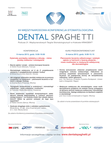 Organizator: Patronat honorowy: Patronat prasowy: XII MIĘDZYNARODOWA KONFERENCJA STOMATOLOGICZNA Podczas 21. Międzynarodowych Targów Stomatologicznych w Krakowie KRAKDENT® KONFERENCJA KURS PRZEDKONFERENCYJNY 9 marca 2013, godz. 9.00-19.00 8 marca 2013, godz. 9.00-15.15 Dylematy pomiędzy estetyką a okluzją – różne punkty widzenia i rozwiązania Planowanie leczenia odtwórczego i estetyki zębów w harmonii z twarzą pacjenta – nowe możliwości w medycynie estetycznej dla stomatologów • Starcie zębów i erozje – zmiana koncepcji leczenia dr Stefen Koubi (Marsylia, Francja) • Stomatologia estetyczna od A do Z: projektowanie uśmiechu z uwzględnieniem estetyki i funkcji dr Dinos Kountouras (Saloniki, Grecja) • Jak osiągnąć optymalne rezultaty estetyczne za pomocą uzupełnień na implantach – planowanie leczenia w har- monii z okluzją i funkcją dr Andrea Ricci (Florencja, Włochy) • Tomografia komputerowa w endodoncji i stomatologii odtwórczej – nowe wskazania i możliwości dr Francesc Abella (Barcelona, Hiszpania) • Nowe możliwości wypełnień kompozytowych zakła- danych metodą bezpośrednią w czasach ekonomi- cznego kryzysu – co możemy zrobić bez udziału labora- torium? Gdzie są granice wskazań do tego typu wypełnień? dr Walter Devoto (Genua, Włochy) • Korony tymczasowe: właściwe projektowanie celem osiągnięcia sukcesu estetycznego. Odbudowa za pomocą uzupełnień tymczasowych w planowaniu leczenia: od pojedynczej korony do kompleksowej odbudowy łuków zębowych prof. Pál Gerlóczy (Praktyka Prywatna Budapeszt, Uniwer sytet w Szegedzie, Węgry) • Medycyna estetyczna dla stomatologów: nowe multi- dyscyplinarne podejścia do estetyki twarzy polegające na łączeniu technik medycyny estetycznej i stomatologii kosmetycznej. Zabiegi estetyczne na tkankach miękkich w stomatologii prof. Ezio Costa (Uniwersytet w Cagliari, Włochy) Za udział w kursie przewidziano 6 punktów edukacyjnych • Dyskusja okrągłego stołu z udziałem wykładowców Moderatorzy: dr hab. Jerzy Krupiński prof. nadzw., dr n. med. Maciej Żarow Za udział w Konferencji przewidziano 8 punktów edukacyjnych Sponsorzy Konferencji: Sponsorzy Kursu: Informacje szczegółowe i zapisy on-line: www.dentalspaghetti.pl formularz zgłoszeniowy XII MIĘDZYNARODOWA KONFERENCJA Stomatologiczna DENTAL SPAGHETTI kurs przedkonferencyjny Zgłaszam swój udział w: XII Międzynarodowej Konferencji Dental Spaghetti (zgłoszenie do dnia 10.02.2013) . ...................... 610 zł Lekarz stażysta, student, asystentka dentystyczna ....................................................................... 290 zł XII Międzynarodowej Konferencji Dental Spaghetti (zgłoszenie od dnia 11.02.2013) . ...................... 700 zł Lekarz stażysta, student, asystentka dentystyczna ....................................................................... 390 zł Członkowie PASE ............................................................................................................................. 540 zł Kursie przedkonferencyjnym................................................................................................................... 450 zł Razem.................................................. zł Dane personalne i adres do korespondencji uczestnika: Imię i nazwisko Kod pocztowy - Miejscowość Ulica, numer Telefon E-mail Proszę o wystawienie faktury: Na firmę/instytucję Fax Na moje nazwisko (jestem osobą fizyczną) Dane do faktury: Nazwa firmy / Imię i nazwisko) Kod pocztowy - Miejscowość Ulica, numer NIP Wyrażam zgodę na otrzymywanie informacji i ofert od Targów w Krakowie Sp. z o.o. na podany wyżej adres mailowy (Ustawa z dn. 18.07.2002 – Dz. U. 2002 nr 144, poz. 1204 – O Świadczeniu Usług Drogą Elektroniczną) oraz na przechowywanie i przetwarzanie danych osobowych w zakresie prowadzonej przez Targi w Krakowie działalności gospodarczej (Ustawa z dn. 29.08.1997r. – Dz. U. 2002 nr 101, poz. 926 – O Ochronie Danych Osobowych). Akceptuję warunki regulaminu uczestnictwa (regulamin uczestnictwa znajduje się na stronie www.dentalspaghetti.pl) ............................................... ............................................................. (pieczątka) (data i czytelny podpis) Formularz proszę odesłać na adres: Targi w Krakowie Sp. z o.o., 31-586 Kraków, ul. Centralna 41A Kontakt: Patrycja Zielezińska, tel.: 012 651 90 48, fax: 012 644 61 41, [email protected]