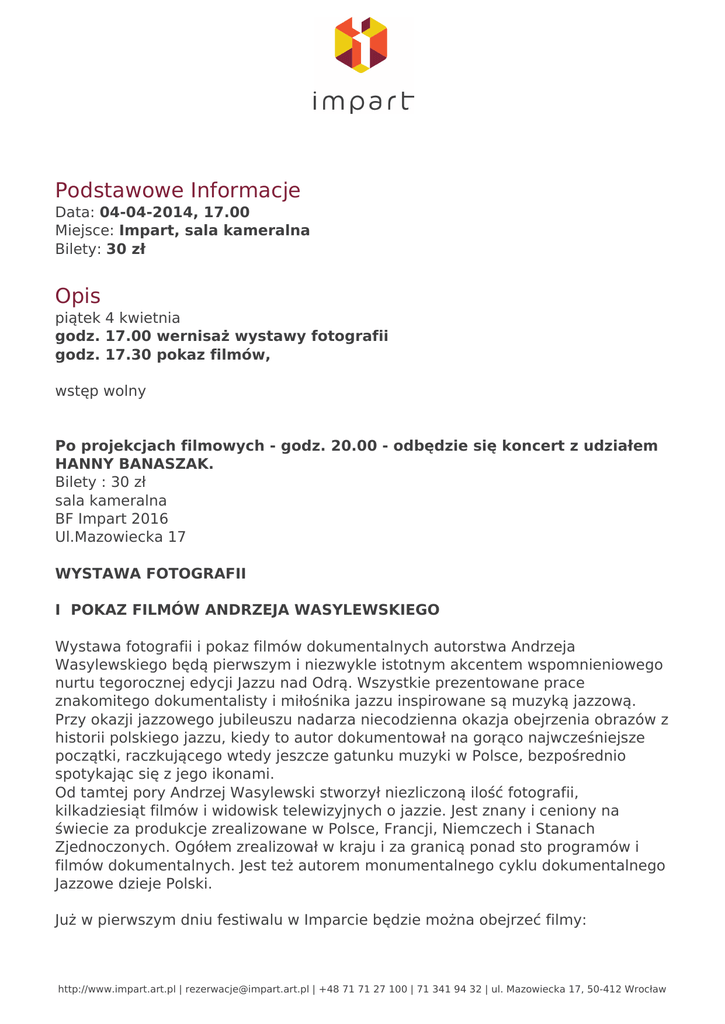 Podstawowe Informacje Data: 04-04-2014, 17.00 Miejsce: Impart, sala kameralna Bilety: 30 zł Opis piątek 4 kwietnia godz. 17.00 wernisaż wystawy fotografii godz. 17.30 pokaz filmów, wstęp wolny Po projekcjach filmowych - godz. 20.00 - odbędzie się koncert z udziałem HANNY BANASZAK. Bilety : 30 zł sala kameralna BF Impart 2016 Ul.Mazowiecka 17 WYSTAWA FOTOGRAFII I POKAZ FILMÓW ANDRZEJA WASYLEWSKIEGO Wystawa fotografii i pokaz filmów dokumentalnych autorstwa Andrzeja Wasylewskiego będą pierwszym i niezwykle istotnym akcentem wspomnieniowego nurtu tegorocznej edycji Jazzu nad Odrą. Wszystkie prezentowane prace znakomitego dokumentalisty i miłośnika jazzu inspirowane są muzyką jazzową. Przy okazji jazzowego jubileuszu nadarza niecodzienna okazja obejrzenia obrazów z historii polskiego jazzu, kiedy to autor dokumentował na gorąco najwcześniejsze początki, raczkującego wtedy jeszcze gatunku muzyki w Polsce, bezpośrednio spotykając się z jego ikonami. Od tamtej pory Andrzej Wasylewski stworzył niezliczoną ilość fotografii, kilkadziesiąt filmów i widowisk telewizyjnych o jazzie. Jest znany i ceniony na świecie za produkcje zrealizowane w Polsce, Francji, Niemczech i Stanach Zjednoczonych. Ogółem zrealizował w kraju i za granicą ponad sto programów i filmów dokumentalnych. Jest też autorem monumentalnego cyklu dokumentalnego Jazzowe dzieje Polski. Już w pierwszym dniu festiwalu w Imparcie będzie można obejrzeć filmy: http://www.impart.art.pl | [email protected] | +48 71 71 27 100 | 71 341 94 32 | ul. Mazowiecka 17, 50-412 Wrocław NA PRZYKŁAD... MUNIAK Film dokumentalny Produkcja: Polska Rok produkcji: 1976 Gatunek: Film o sztuce Dane techniczne: Kolor ; 30 minut Gdzie kończy się "czysty" jazz? Każdy ma prawo grać, co mu się podoba o ile robi to szczerze i interesująco. Okazją do corocznych spotkań z muzyką, niekiedy bardzo kontrowersyjną, jest festiwal Jazz nad Odrą. Granice jazzu obejmują ogromny obszar, mieści się tu muzyka Jamajczyka i Meksykanina, profesjonalisty i amatora, radykalnego awangardzisty i miłośnika tradycji. Na przykład Muniak... Udział biorą m.in.: Vistula River Brass Band, Mexico Jazz Group, Errol Dixon /Jamajka/, Ossjan, Big Band PWSM Katowice, Duet Gitar Klasycznych, Duo Gładkowski-Zgraja, Bayon /NRD-Kambodża/, Chałturnik, J.Ptaszyn-Wróblewski, T.Górny, B.Jankowski, San Mateo Święcicki, J.Balcerak, S.Modelski, G.Tusiewicz, L.Terpiłowski, M.A.Karewicz, W. Idzior, K.Zgraja, W.Siwek, M.Ostaszewski, J.Dębek, Z.Namysłowski, P.Brodowski, A.Zarębski, A.Jaroszewski, W.Partyka, K.Brodacki, T.Tłuczkiewicz Film zrealizowany podczas “Jazz nad Odrą’1975” Reżyseria: Andrzej Wasylewski Scenariusz: Andrzej Wasylewski Zdjęcia: Tadeusz Owsianko Współpraca operatorska: Wojciech Rawecki Montaż: Ewa Romanowska Produkcja: Centralna Wytwórnia Programów i Filmów Telewizyjnych Poltel 1976 * JAZZOWE DZIEJE POLSKI - odsłona IX ,, Prosty rytm, niemądre słowa “ 30 min. scenariusz i reżyseria Andrzej Wasylewski prod. Micromegas udział biorą m.in. laureaci I Przeglądu Studenckich Zespołów Jazzowych we Wrocławiu /1957/ : Krzysztof SADOWSKI - organy – z zespołem Modern Combo; Zbigniew NAMYSŁOWSKI w Modern Combo gra na wiolonczeli i w zespole pianisty Witolda Krotochwila-Modern Dixielanders - jako puzonista - zdobywa wyróżnienie dla solistów ; Andrzej CIĄŻYŃSKI – prawnik - w 1958 założyciel Wrocławskiego Jazz Clubu przy Studenckim Klubie Od Nowa i kierownik sekcji muzycznej pianista Tadeusz Erroll KOSIŃSKI, kolejno w Piwnicy Świdnickiej założyciel Dolnośląskiego Klubu Jazzowego o filmie : Jazzowe dzieje Polski trwają pięć godzin... http://www.impart.art.pl | [email protected] | +48 71 71 27 100 | 71 341 94 32 | ul. Mazowiecka 17, 50-412 Wrocław I oto – polski jazz doczekał się pomnika. Wzniósł go praktycznie jednoosobowo – w niczym nie ujmując jego współpracownikom – Andrzej Wasylewski. Postać to zresztą najbardziej predestynowana do stworzenia takiego dzieła: to on dokumentował swą kamerą dorobek największych osobowości polskiego – i nie tylko – jazzu. On właśnie pokusił się nakręcić (i zmontować) Jazzowe dzieje Polski – dziesięć półgodzinnych odcinków, obejmujących jedynie okres do roku 1960. Jak wyjaśnia w wywiadzie dla „Jazz Forum”, najpierw chciał pokazać tylko to, czego sam był świadkiem – jako uczeń krakowskiego III Liceum im. Króla Jana Sobieskiego, którego uczniami byli także m.in. Jerzy „Duduś” Matuszkiewicz i Andrzej Trzaskowski, a potem jako student sławnej łódzkiej szkoły filmowej. Potem postanowił uzupełnić swe dzieło – które skromnie nazywa „czymś w rodzaju (przyzwoicie udokumentowanej) impresji na temat jazzu w tamtych latach” – i pokazać, jak w Polsce rodził się jazz – ten, który znamy, świadomy siebie, wyrazisty. Wasylewski stworzył swe dzieło właściwie z niczego. Zachowanych materiałów filmowych i telewizyjnych jest zaledwie kilka plus kilka tematów z Kroniki Filmowej. Jazzowe dzieje Polski trwają pięć godzin... Oczywiście, reżyser nie dokonał cudu, nie znalazł też – mimo swej skrupulatności – nieznanych materiałów. Posłużył się nagrywanymi w ciągu ponad dwudziestu kilku lat wspomnieniami świadków – muzyków, organizatorów, zagorzałych fanów. Dziś już wielu z nich nie ma na tym świecie. Wykorzystał też rozmaite materiały z historii jazzu światowego, a także z „pozajazzowej” historii Polski. Jedno i drugie tworzy bogate tło, na którym rozgrywają się dzieje jazzu w naszym kraju. Dzięki zgrabnemu montażowi widzimy je zarówno w kontekście rozwoju tej muzyki na świecie, jak i na tle najnowszej historii Polski. Widzimy i słyszymy legendarnych muzyków, o których wysłuchaniu na żywo Polacy mogli wtedy tylko pomarzyć. Mimo to – wpływali na rozwój polskiego jazzu dzięki wydobywanym spod ziemi płytom, a także dzięki legend