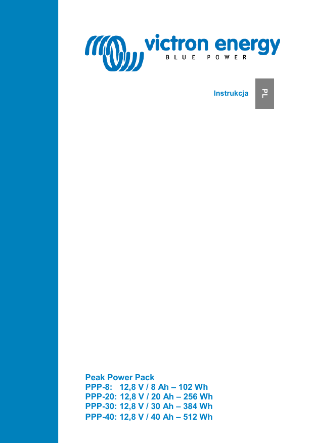 Peak Power Pack PPP-8: 12,8 V / 8 Ah – 102 Wh PPP-20: 12,8 V / 20 Ah – 256 Wh PPP-30: 12,8 V / 30 Ah – 384 Wh PPP-40: 12,8 V / 40 Ah – 512 Wh PL Instrukcja Akumulator litowo-jonowy z samoistnie bezpiecznymi ogniwami LiFePO4 i wbudowana ładowarka o wyjątkowej szczytowej mocy wyjściowej. Napięcie nominalne: 12,8 V Zakres pojemności akumulatora: 8 Ah do 40 Ah Niewielka masa i łatwość instalacji Idealnie przystosowany do zastosowań przenośnych Staranne zabezpieczenie przed nieprawidłowym użyciem Doskonała wydajność w zastosowaniach solarnych i innych, w których częste głębokie rozładowania i niewystarczające naładowanie powodują szybkie uszkodzenia akumulatorów kwasowo-ołowiowych. Wyjście 1: wyjście wysokoprądowe do wózków do przestawiania przyczep kempingowych i innych zastosowań wymagających wysokiej mocy Zastosowanie do wózków do przestawiania przyczep kempingowych: automatyczne wyłączanie wyjścia wysokiej mocy po 30 minutach od włączenia Inne zastosowania: możliwość przełączenia wyjścia wysokiej mocy w tryb „stale włączony” Zabezpieczenie przed zwarciem Zabezpieczenie akumulatora przed nadmiernym rozładowaniem Wyjście 2: wyjście dodatkowe dla odbiorników prądu stałego o niskiej mocy (nie występuje w modelu 8 Ah) Stale włączone Zabezpieczenie przed zwarciem Zabezpieczenie akumulatora przed nadmiernym rozładowaniem Wejście 1: wejście uniwersalne dla akumulatora samochodowego/ładowarki solarnej Regulowane napięcie i natężenie prądu w celu bezpiecznego ładowania akumulatora Li-ion. Możliwość podłączenia do tego wejścia praktycznie każdego zasilania elektrycznego prądem stałym spełniającego warunek 11 V < Vin < 25 V. Wejście 2: drugie wejście do podłączania zasilania 15 V DC Obejmuje zasilanie 3 A (podłączane do sieci elektrycznej 100/240 V AC) 1 PL 1. Opis ogólny Możliwość szybkiego ładowania przez wejście 1 (wyjście o wysokim natężeniu prądu) Do wyjścia wysokiej mocy można podłączyć ładowarkę akumulatorów lub falownik/ładowarkę w celu zapewnienia szybkiego ładowania. Maksymalne natężenie prądu ładowania wynosi 40 A, natomiast maksymalne napięcie bezwzględne 14 V (wyższe napięcie ładowania może spowodować uszkodzenie ogniw akumulatora Li-ion w przypadku braku równowagi ogniw). Tryb przechowywania (storage) Ogranicza pobór prądu z akumulatora praktycznie do zera. Zapobiega uszkodzeniom akumulatora z powodu nadmiernego rozładowania podczas długoterminowego przechowywania. Wyświetlanie danych w czasie rzeczywistym na smartfonach z systemem Apple i Android, tabletach i innych urządzeniach Konieczny klucz sprzętowy VE.Direct Bluetooth Smart — patrz nasza strona internetowa. 2 Zagrożenie wybuchem z powodu iskrzenia Przed rozpoczęciem instalacji i użytkowania urządzenia należy uważnie przeczytać niniejszą instrukcję. Produkt, którego dotyczy niniejsza instrukcja, został zaprojektowany i przebadany zgodnie z normami międzynarodowymi. Urządzenia należy używać wyłącznie zgodnie z jego przeznaczeniem. Urządzenie należy instalować w otoczeniu chronionym przed wysokimi temperaturami. Należy również upewnić się, że w bezpośrednim sąsiedztwie urządzenia nie znajdują się substancje chemiczne, przedmioty z tworzyw sztucznych, zasłony ani inne tkaniny. Nie łącz szeregowo w celu uzyskania wyższego napięcia (może to spowodować uszkodzenie zabezpieczenia przed przeciążeniem i zwarciem). Upewnić się, że urządzenie jest użytkowane w odpowiednich warunkach roboczych. Nigdy nie używaj urządzenia w otoczeniu wilgotnym. Nie używać produktu w miejscach, w których istnieje zagrożenie wybuchem gazu lub pyłu. Upewnij się, że wolna przestrzeń wokół urządzenia jest wystarczająca dla zapewnienia wentylacji. Podłączenia należy zawsze wykonywać w kolejności podanej w rozdziale 3.5. Do podłączeń do wyjścia 1 i wyjścia 2 używaj elastycznego miedzianego przewodu wielożyłowego. Maksymalna średnica/przekrój pojedynczych żył wynosi 0,4 mm/0,125 mm² (0,016"/AWG26). Przykładowo przewód o przekroju 25 mm² powinien składać się z co najmniej 196 żył (skrętka kategorii 5 lub wyższej wg norm VDE 0295, IEC 60228 i BS6360). Nosi on oznaczenie H07V-K. Przewód o przekroju AWG2 powinien składać się co najmniej z żył 259/26 (259 żył o przekroju AWG26). W przypadku grubszych żył powierzchnia styku będzie zbyt mała i wynikająca z niej rezystancja stykowa będzie powodować poważne przegrzania, które mogą doprowadzić do pożaru. 3 PL 2. Instrukcje bezpieczeństwa 4 Urządzenie PPP przed pierwszym użyciem należy całkowicie naładować. Całkowite naładowanie jest sygnalizowane świecącą stale niebieską diodą LED. Nieużywane urządzenie PPP należy przełączyć w tryb przechowywania i całkowicie ładować co najmniej raz na 12 miesięcy. W przypadku korzystania sezonowego urządzenie PPP przed przechowywaniem musi być naładowane co najmniej do 50%. Aby przełączyć urządzenie PPP w tryb przechowywania, należy nacisnąć przycisk na 5 s. Przełączenie jest potwierdzane miganiem niebieskiej diody. 4. Instalacja Podczas montażu urządzenia Peak Power Pack należy zapewnić wokół niego wystarczającą wentylację. Należy pozostawić odstęp co najmniej 5 cm. W przypadku wysokiej temperatury urządzenie wyłącza się, a usterka jest sygnalizowana diodą LED migającą na czerwono. Aby zabezpieczyć urządzenie Peak Power Pack przed głębokim rozładowaniem, jest ono wysyłane z fabryki w trybie przechowywania. Przed pierwszym użyciem należy nacisnąć przycisk na 5 s. Urządzenie PPP jest gotowe do użycia, a gotowość ta jest potwierdzana diodą LED migającą na niebiesko. Montaż urządzenia PPP w przyczepie kempingowej Obudowa jest wykonana z tworzywa sztucznego i należy ją zamontować na podłodze przyczepy kempingowej w szafce lub schowku, używając pasa z zestawu lub odpowiedniego uc